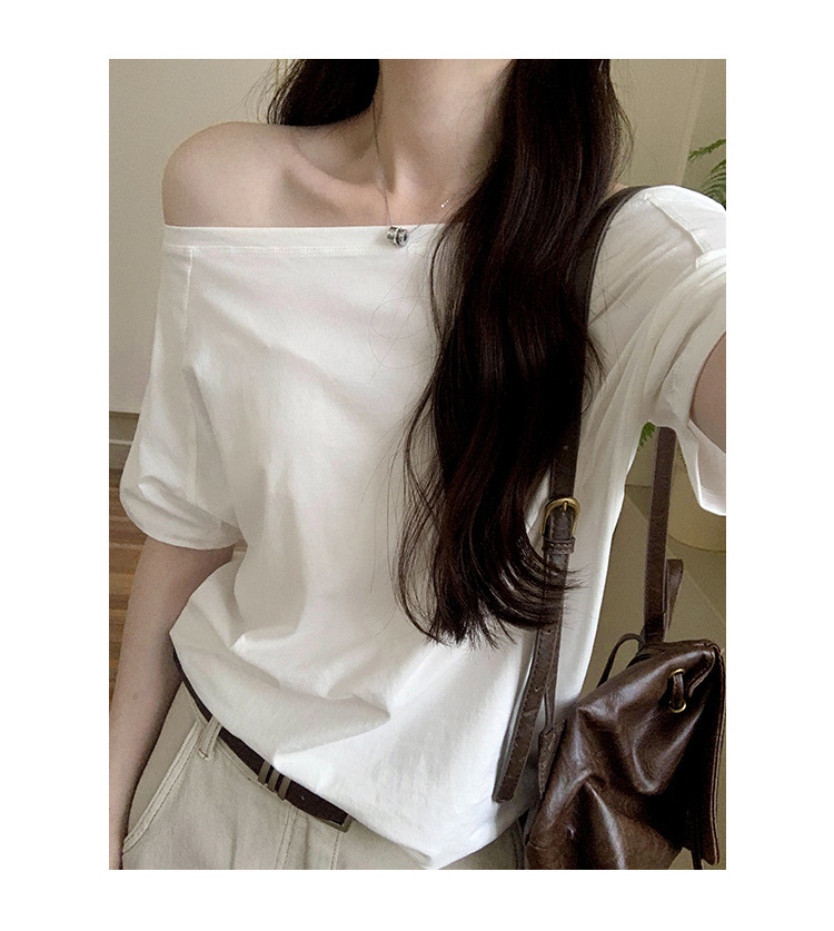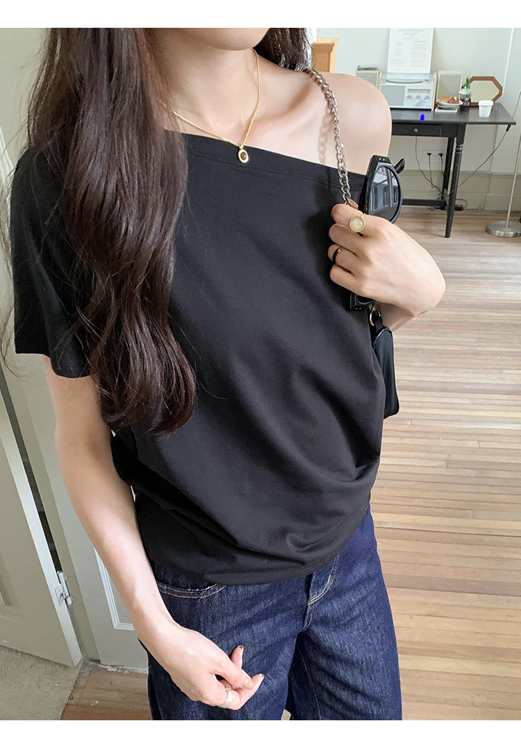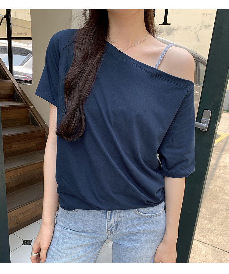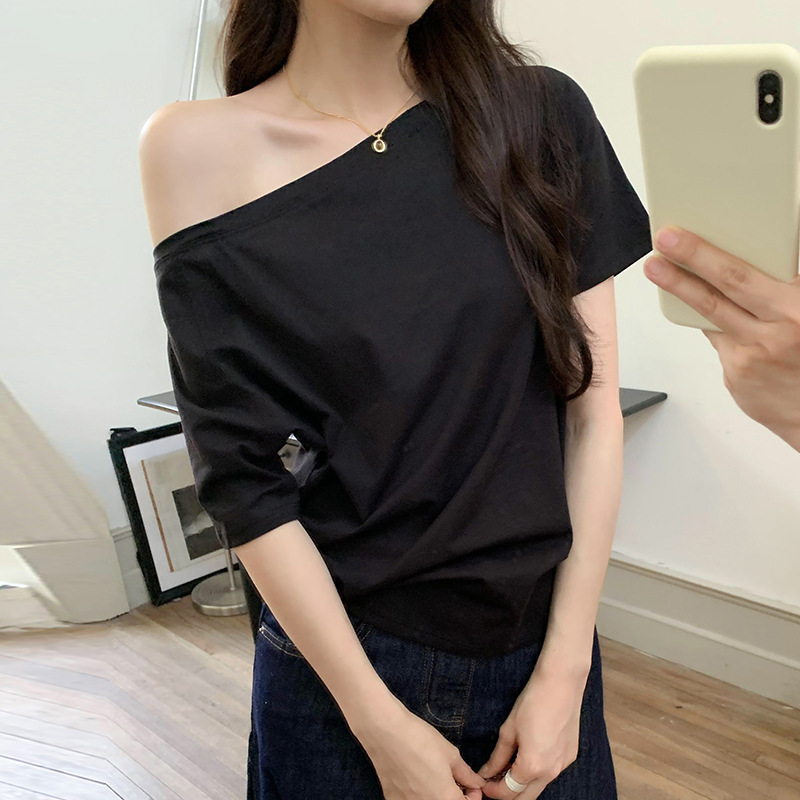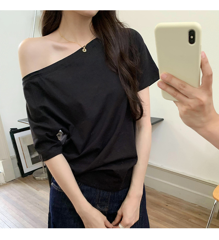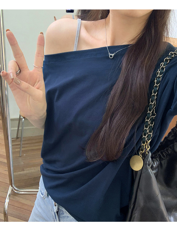 이리나 2025 오프 라인 칼라 경사 숄더 짧은 소매면 티셔츠 여성용 여름 새로운 편안한 게으른 스타일 하이 엔드 탑