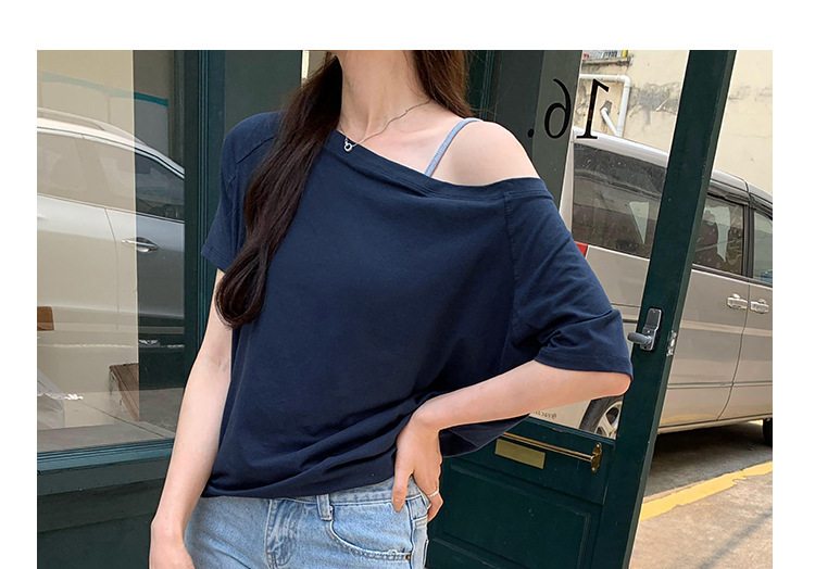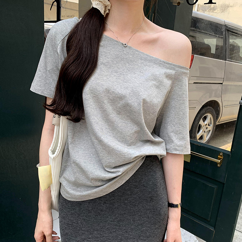 이리나 2025 오프 라인 칼라 경사 숄더 짧은 소매면 티셔츠 여성용 여름 새로운 편안한 게으른 스타일 하이 엔드 탑스토어 가기