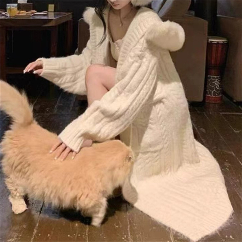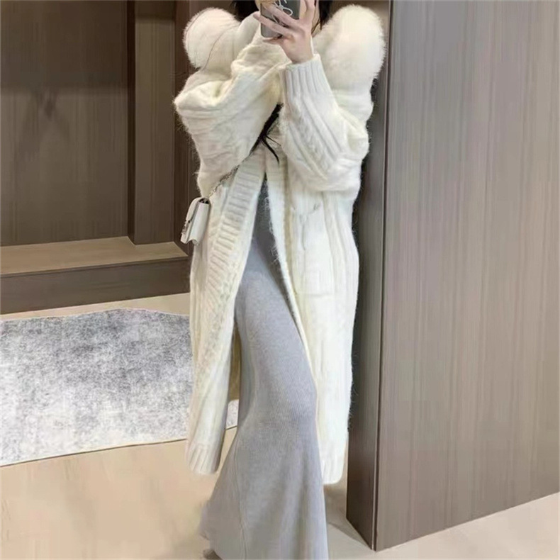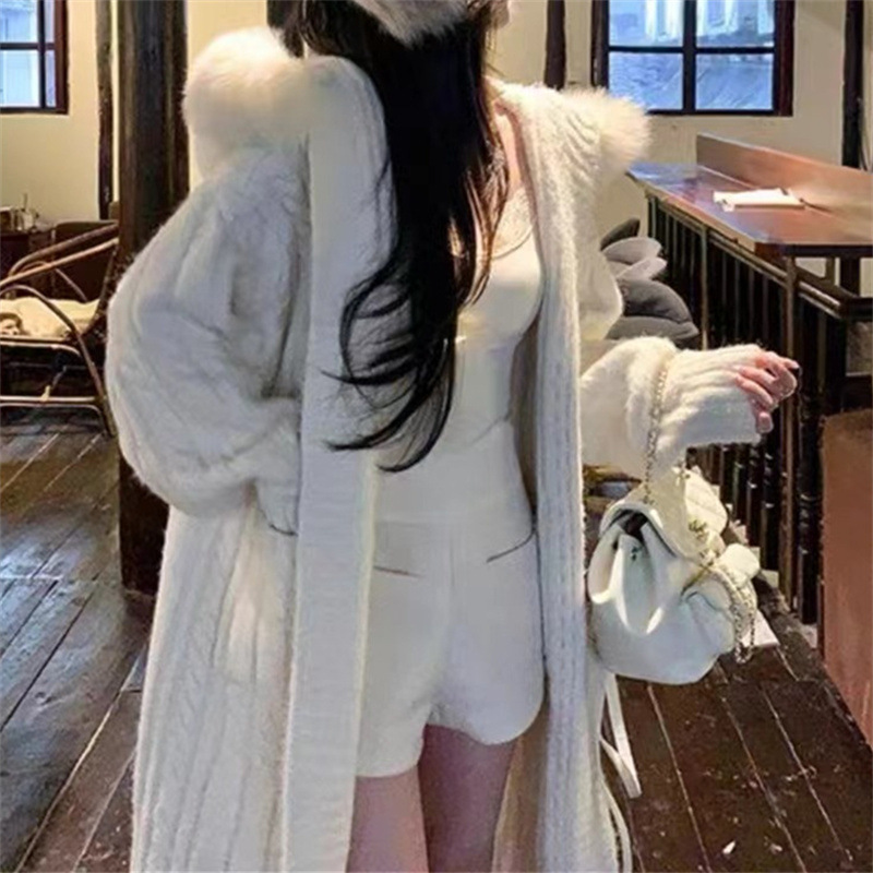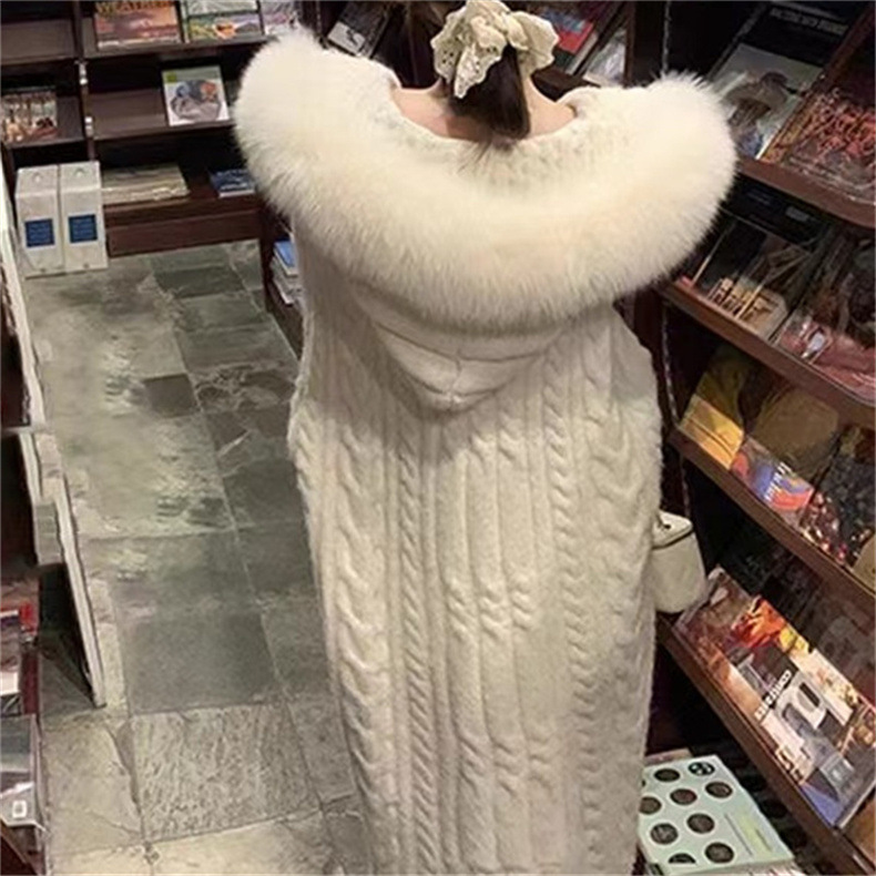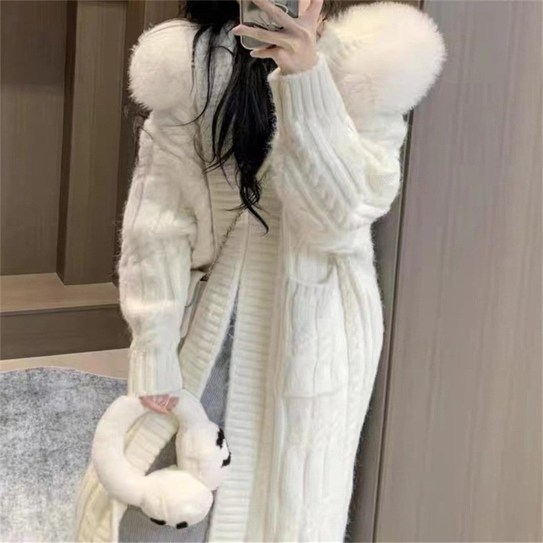 솔리드 컬러 스웨터 코트 여성 가을과 겨울 게으른 스타일 연예인 우아한 카디건 모방 폭스 모피 칼라 후드 케이프 코트스토어 가기