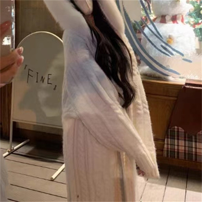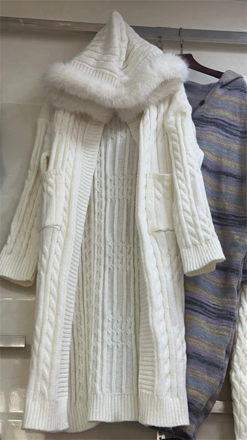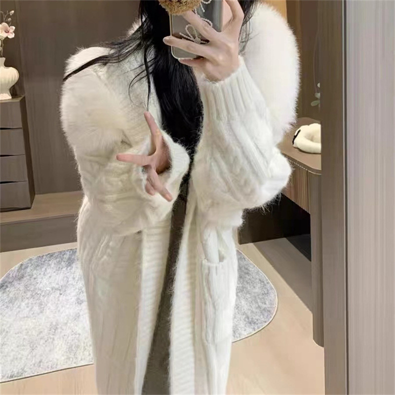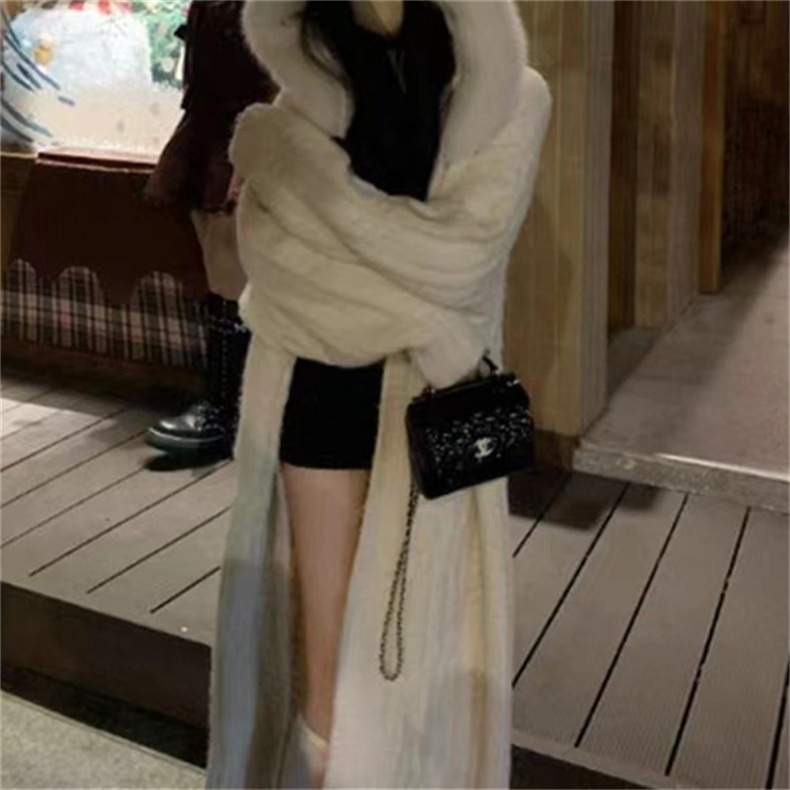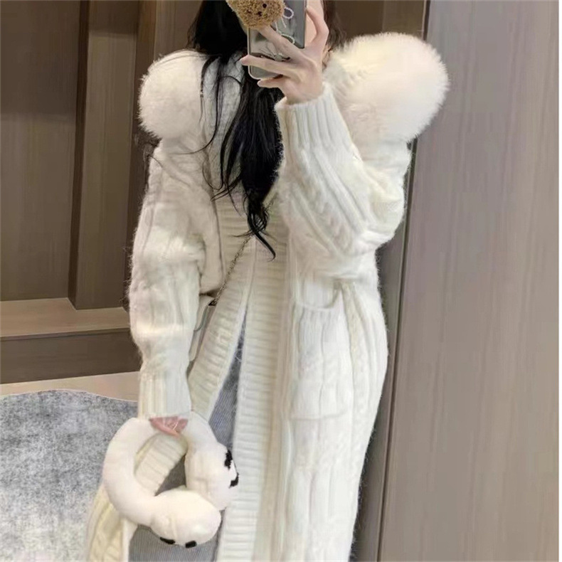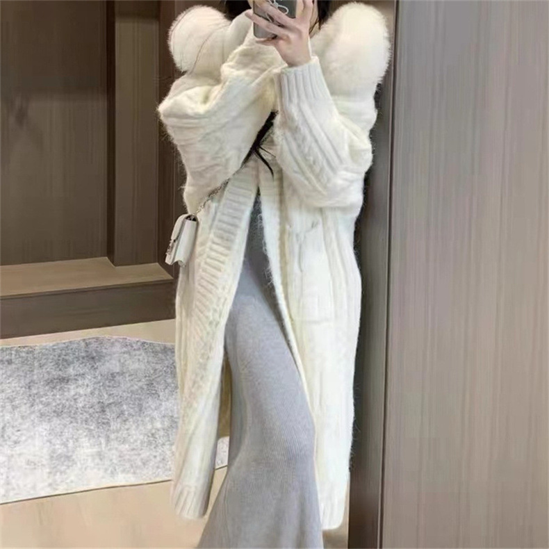 솔리드 컬러 스웨터 코트 여성 가을과 겨울 게으른 스타일 연예인 우아한 카디건 모방 폭스 모피 칼라 후드 케이프 코트
