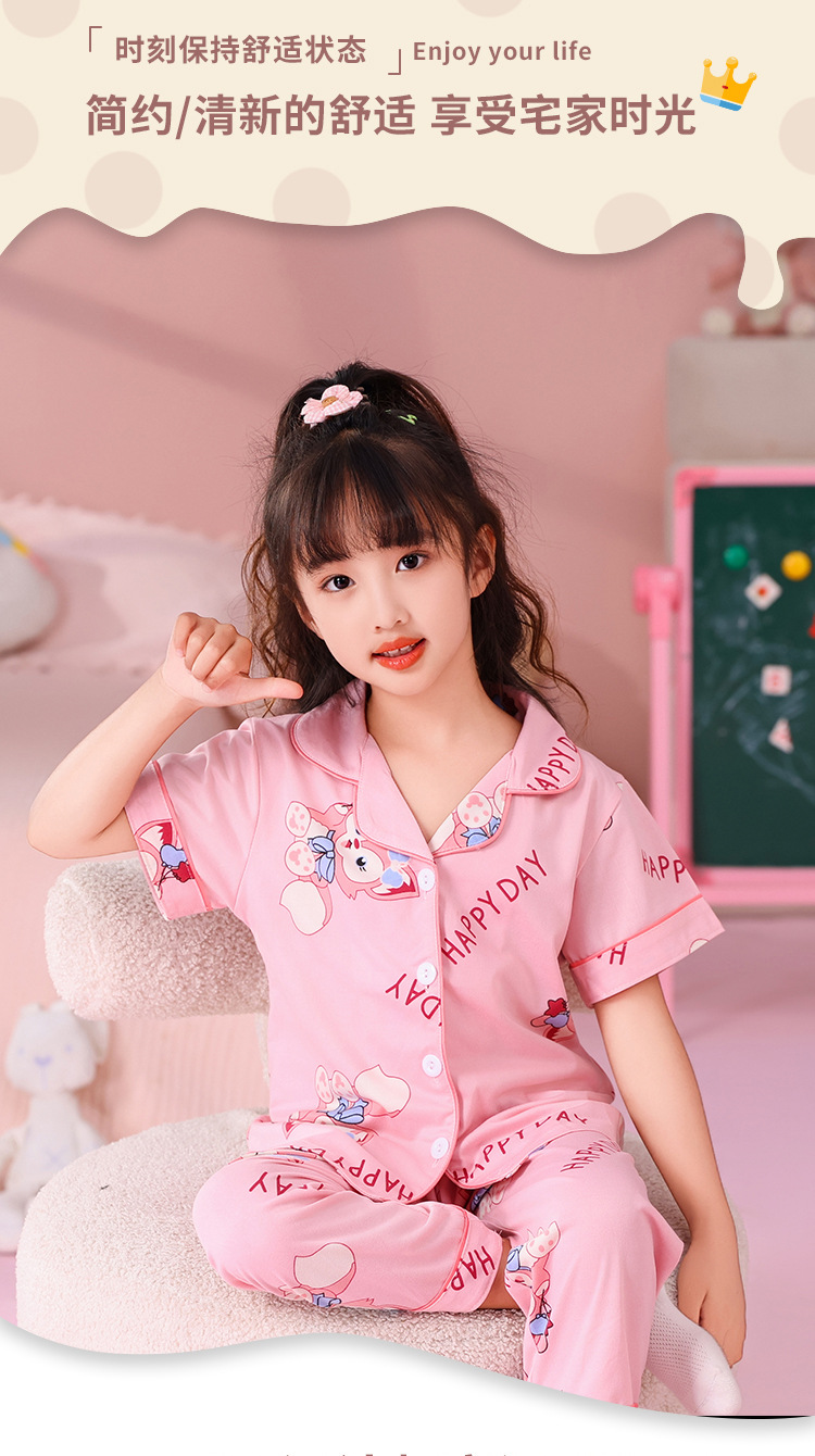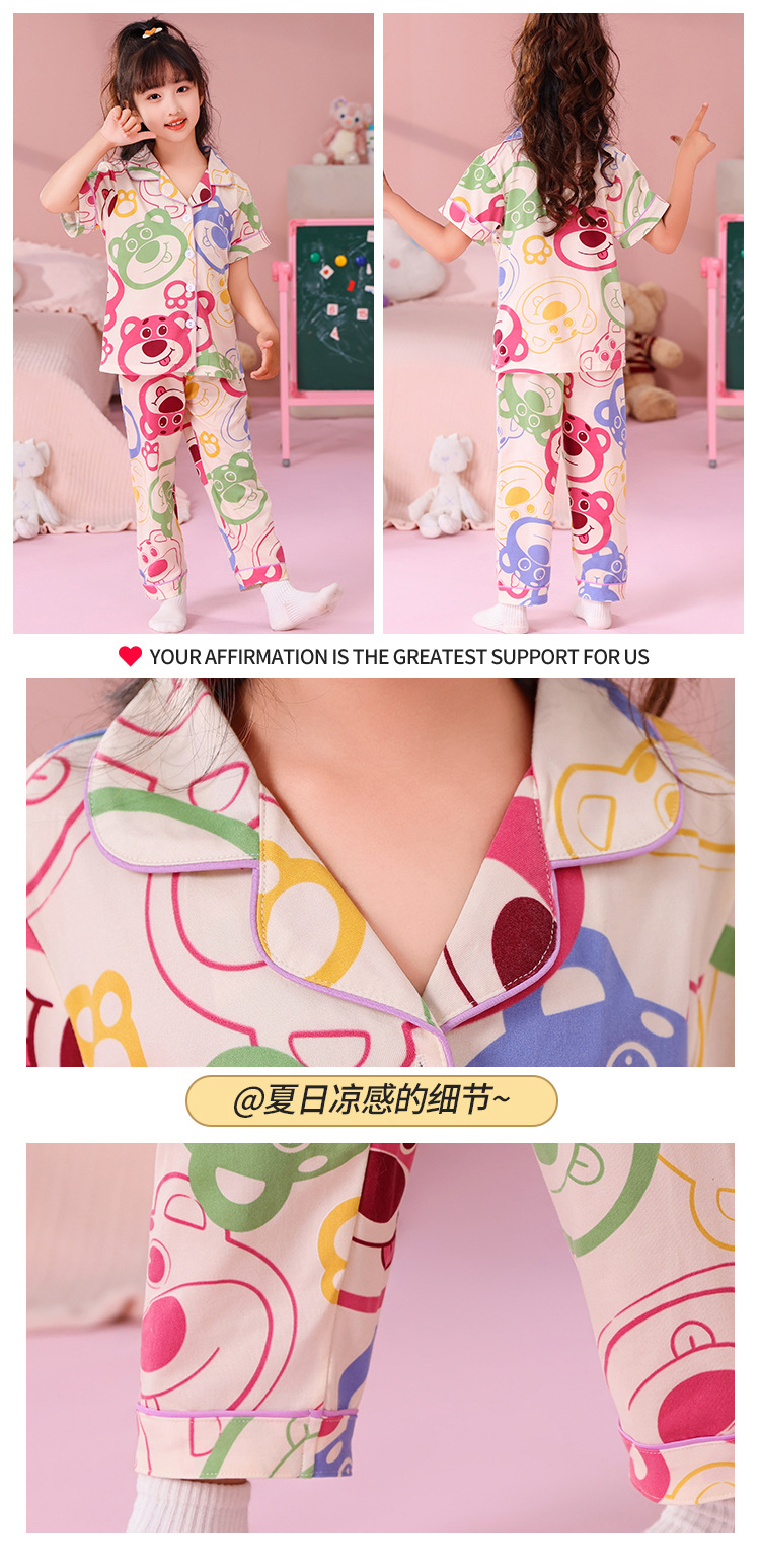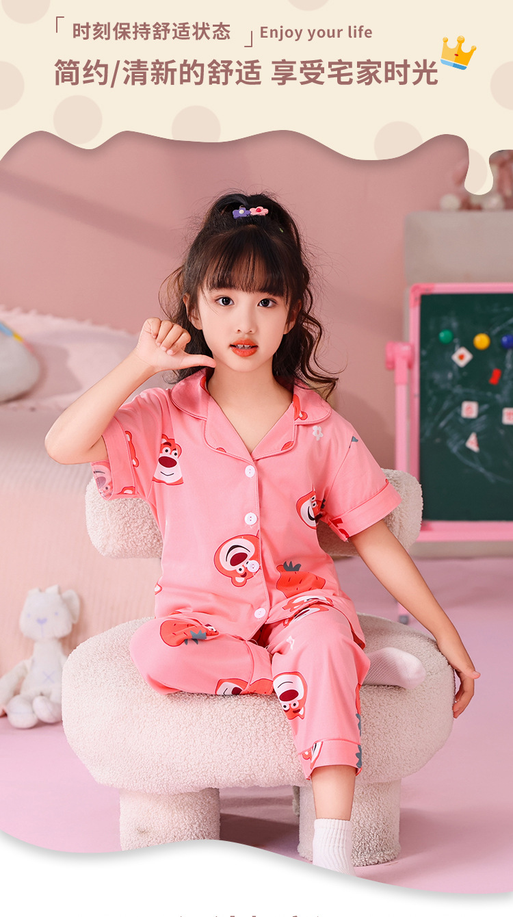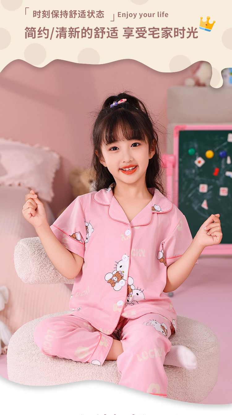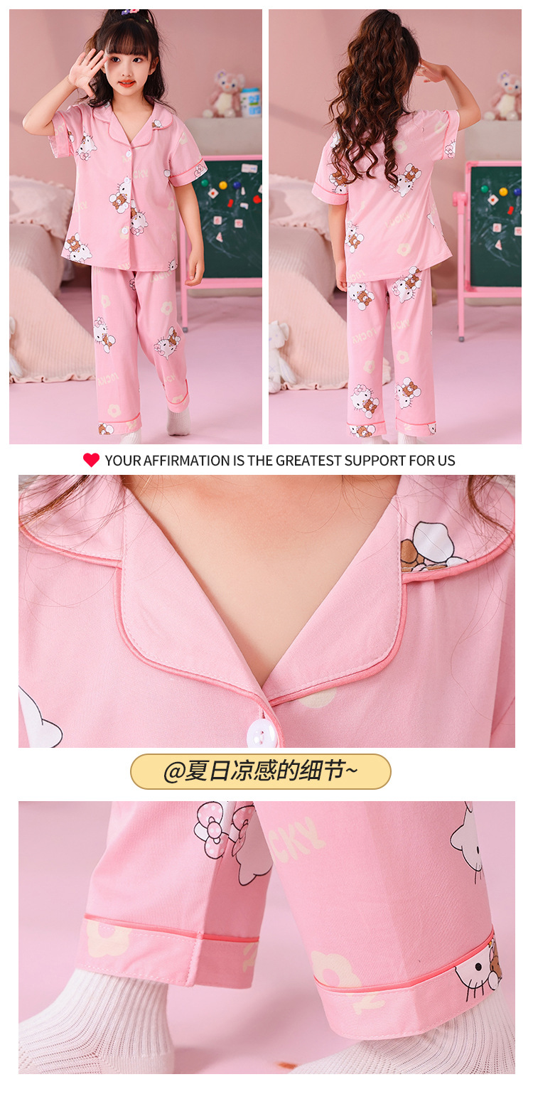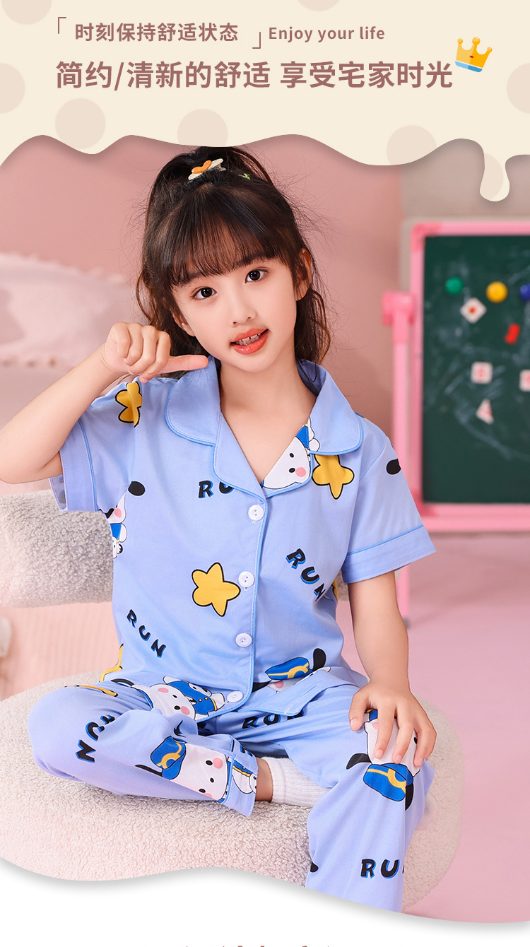 어린이 여성 잠옷 봄과 여름 반팔 바지 얇은 큰 어린이와 소녀 만화 세트 귀여운 카디건 홈 옷스토어 가기