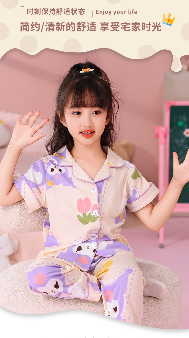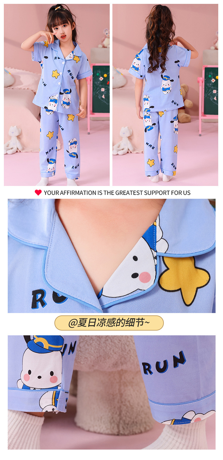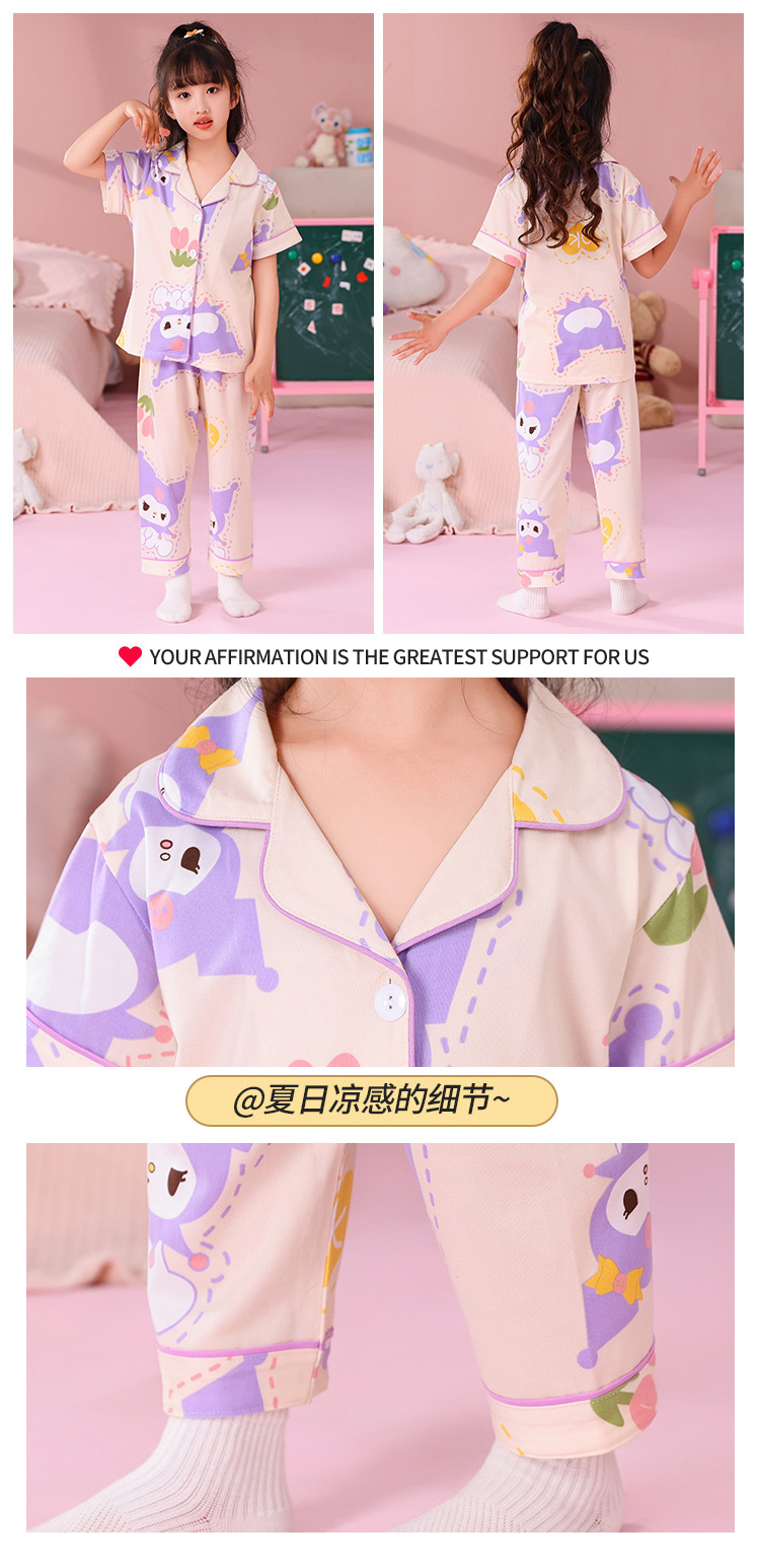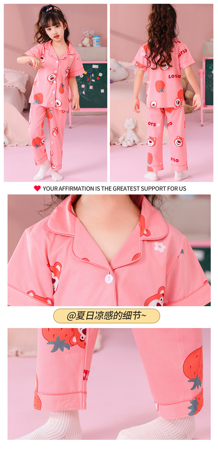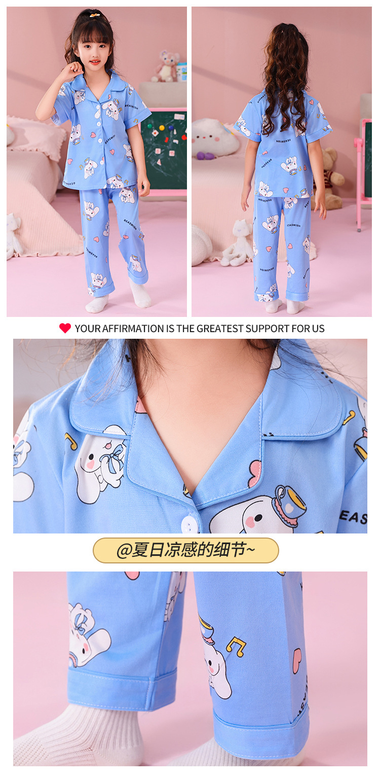 어린이 여성 잠옷 봄과 여름 반팔 바지 얇은 큰 어린이와 소녀 만화 세트 귀여운 카디건 홈 옷스토어 가기