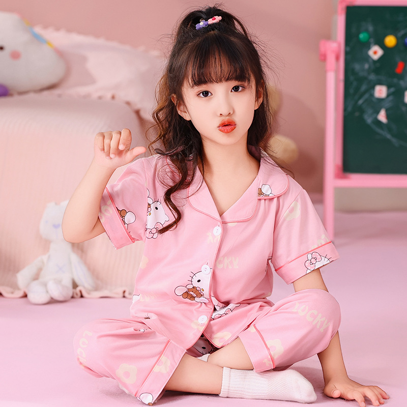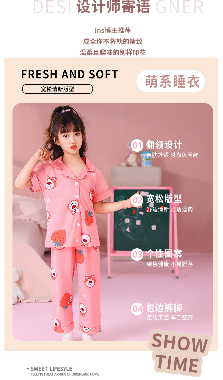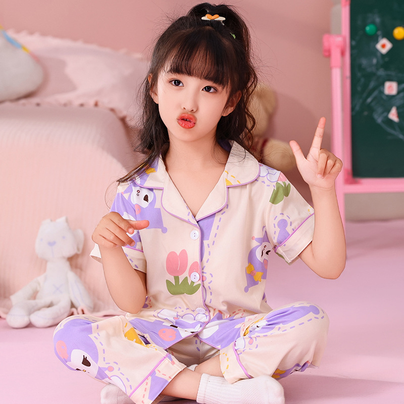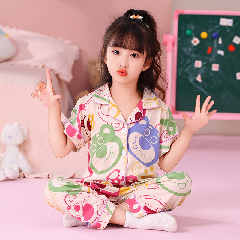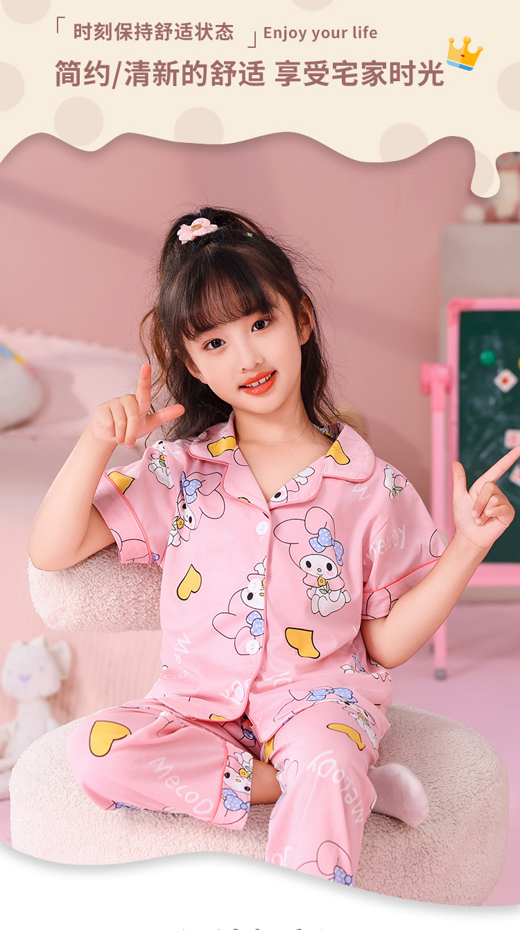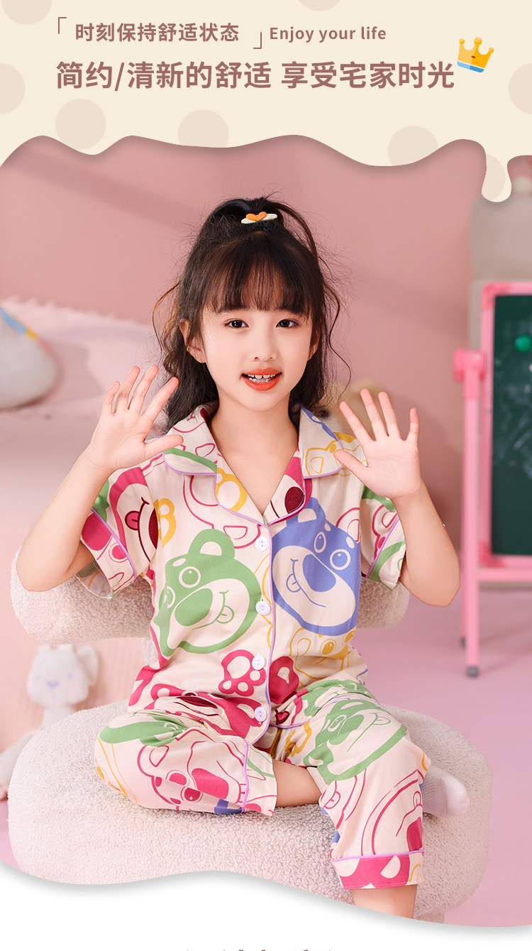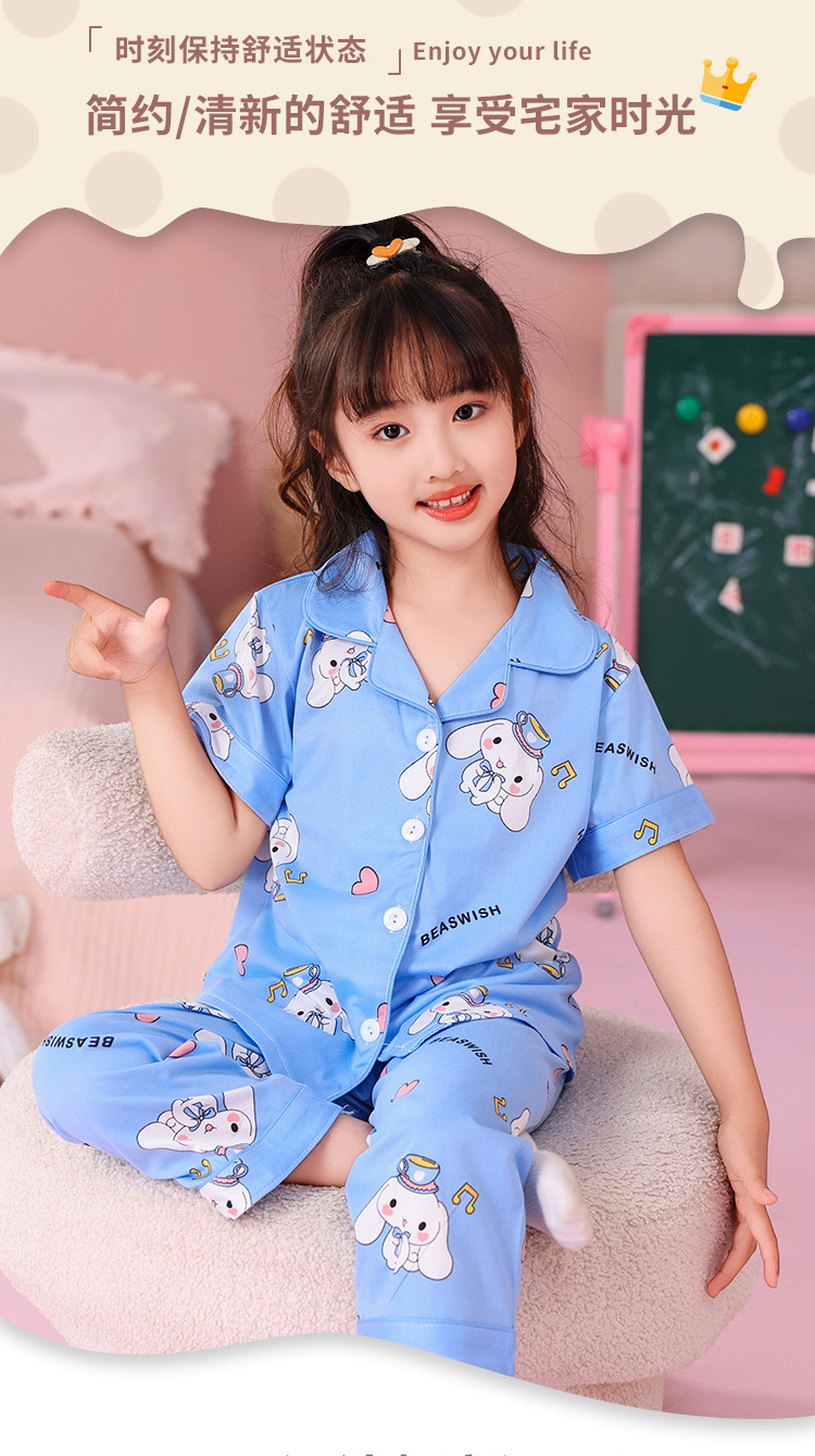 어린이 여성 잠옷 봄과 여름 반팔 바지 얇은 큰 어린이와 소녀 만화 세트 귀여운 카디건 홈 옷스토어 가기