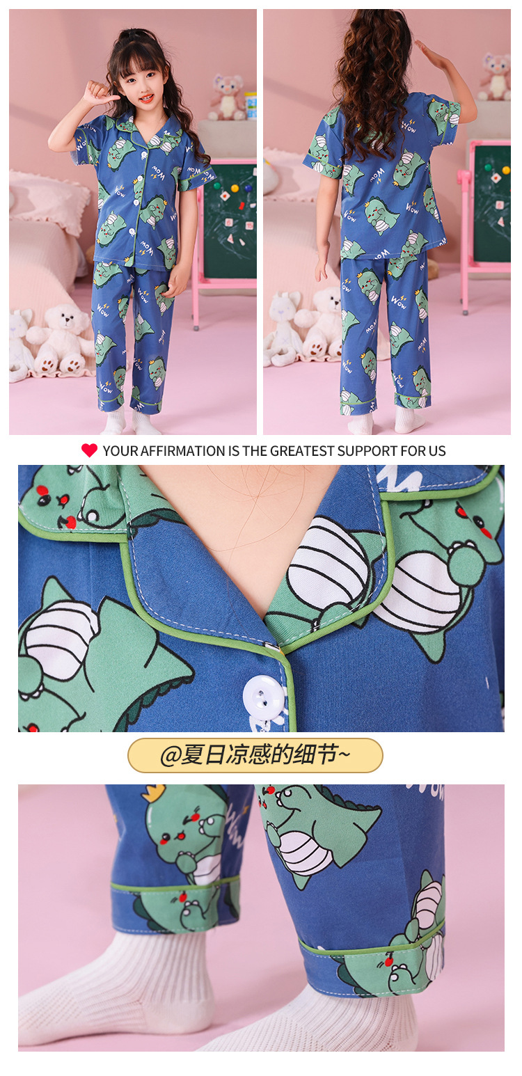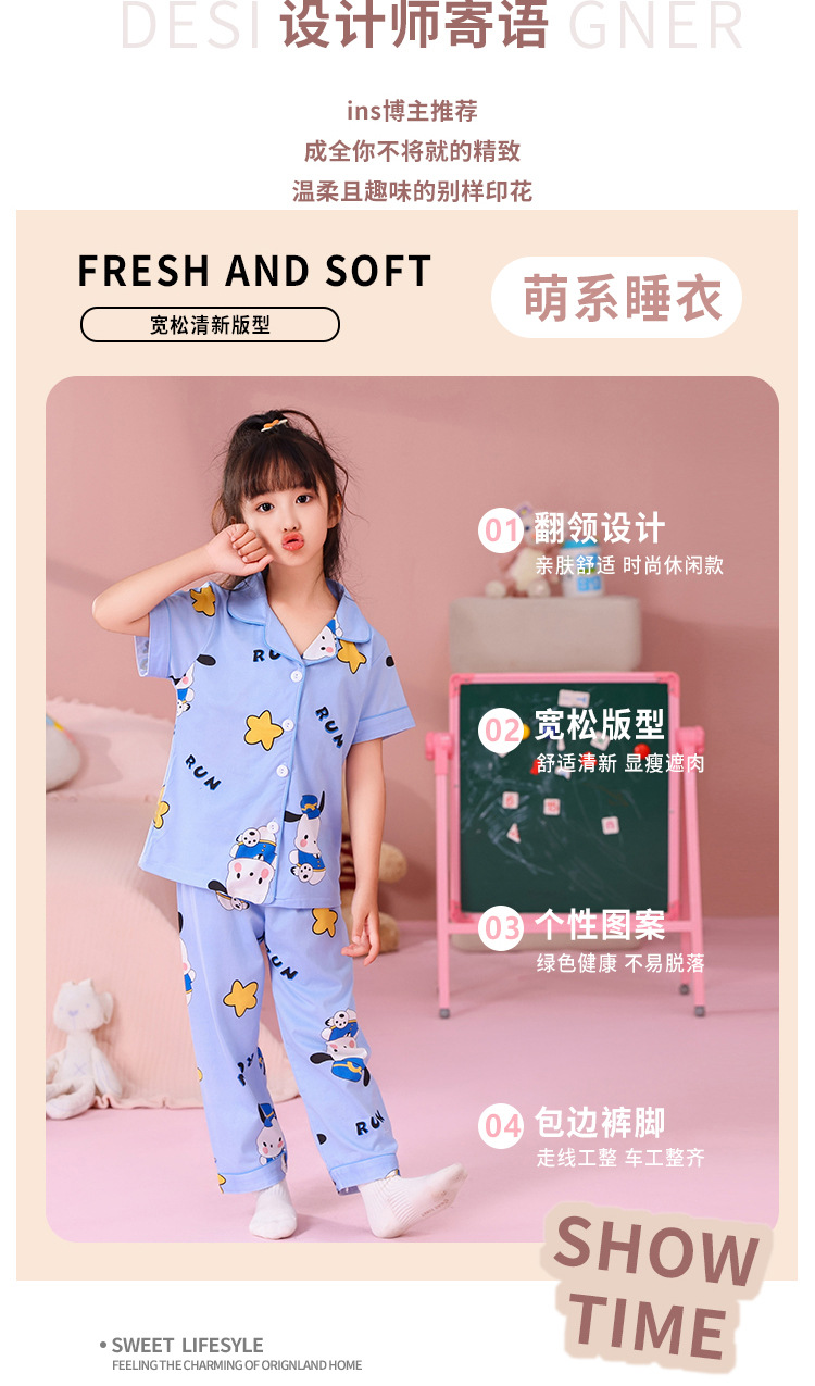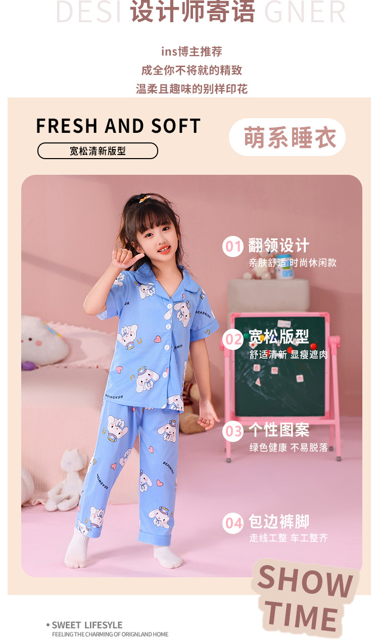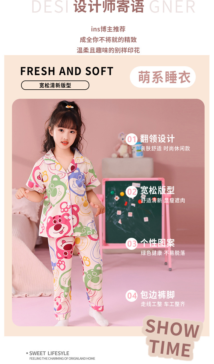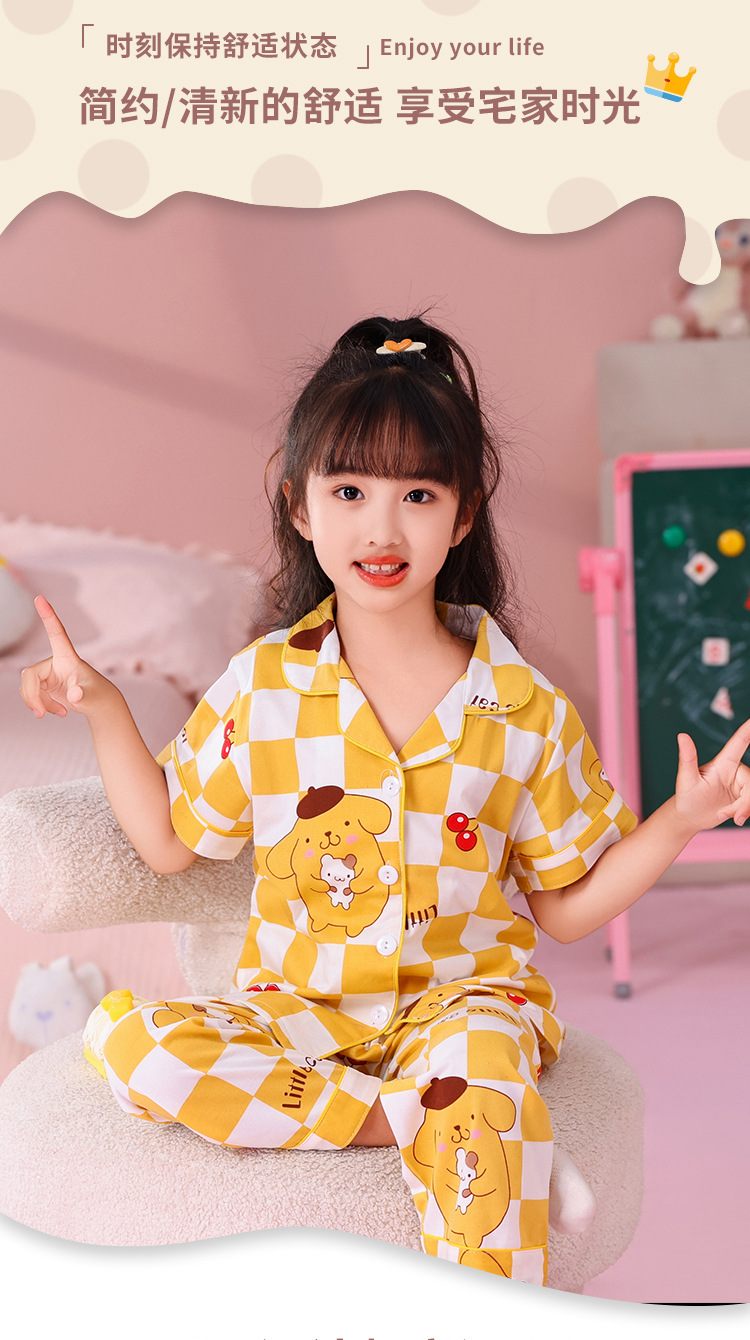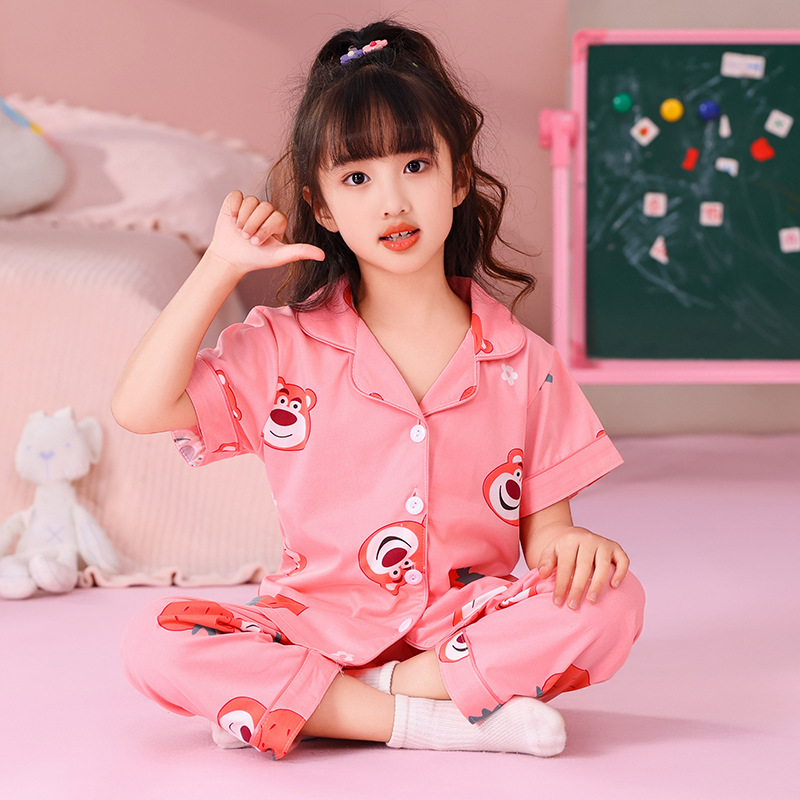 어린이 여성 잠옷 봄과 여름 반팔 바지 얇은 큰 어린이와 소녀 만화 세트 귀여운 카디건 홈 옷스토어 가기