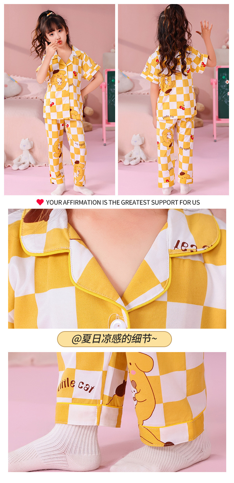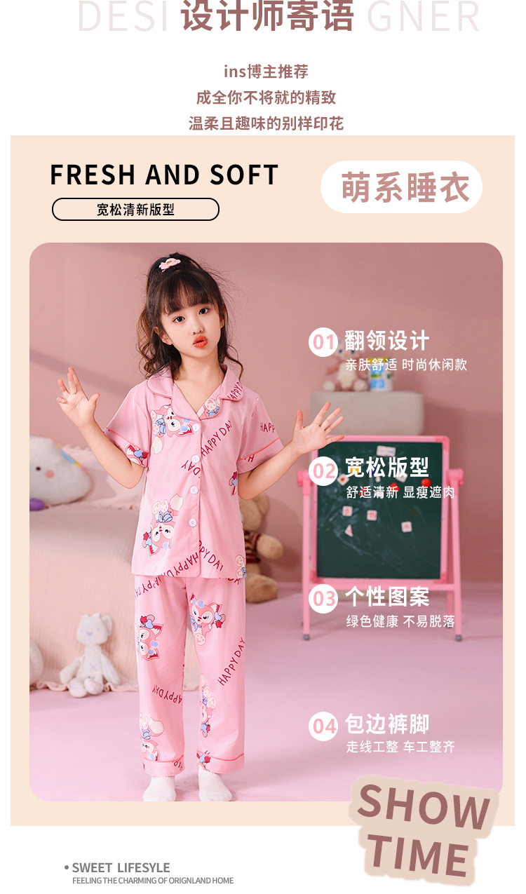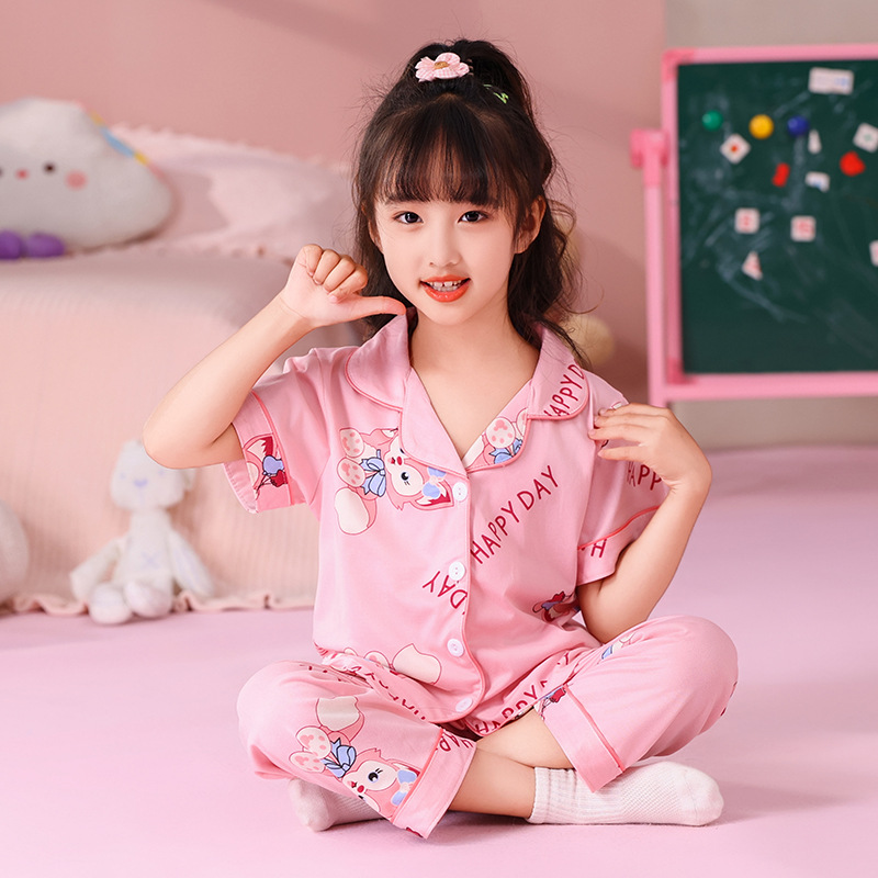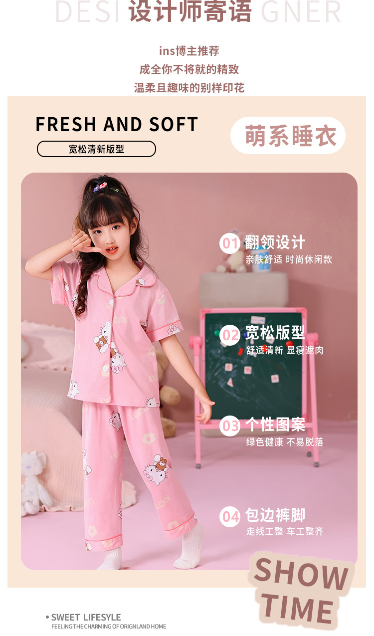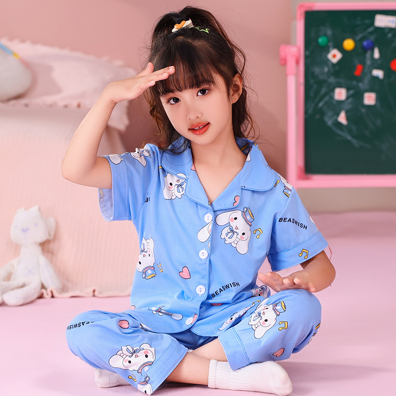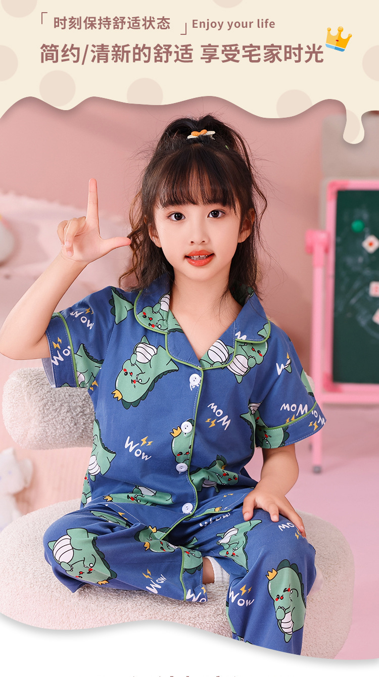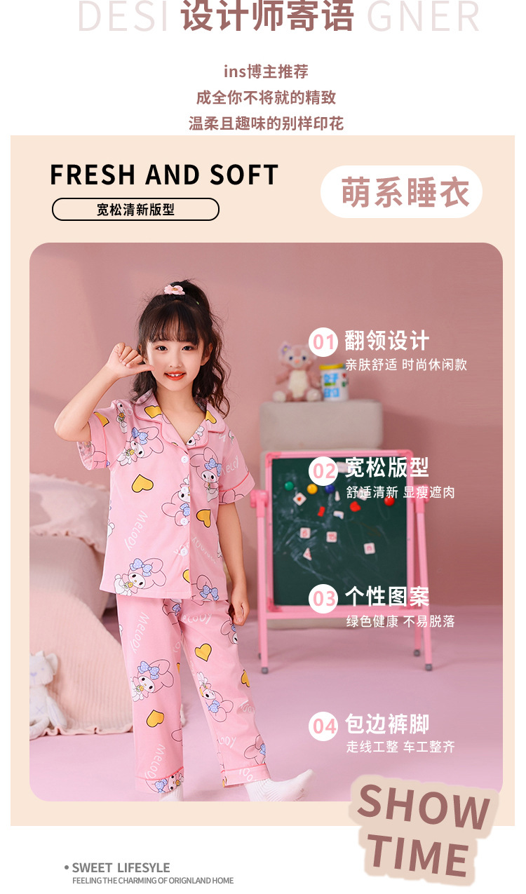 어린이 여성 잠옷 봄과 여름 반팔 바지 얇은 큰 어린이와 소녀 만화 세트 귀여운 카디건 홈 옷스토어 가기