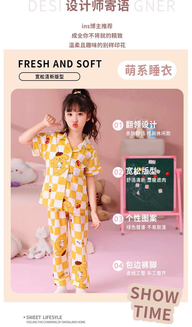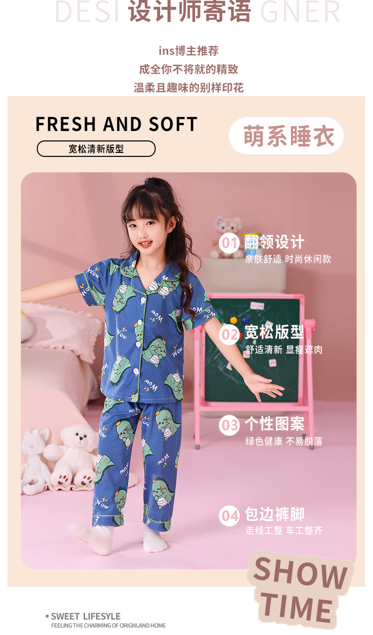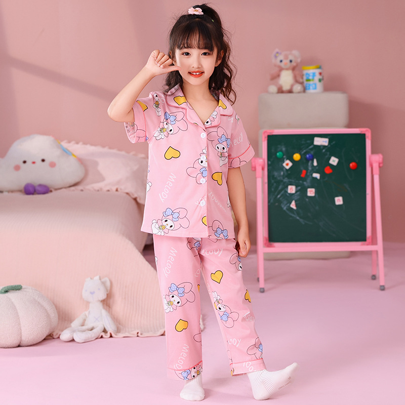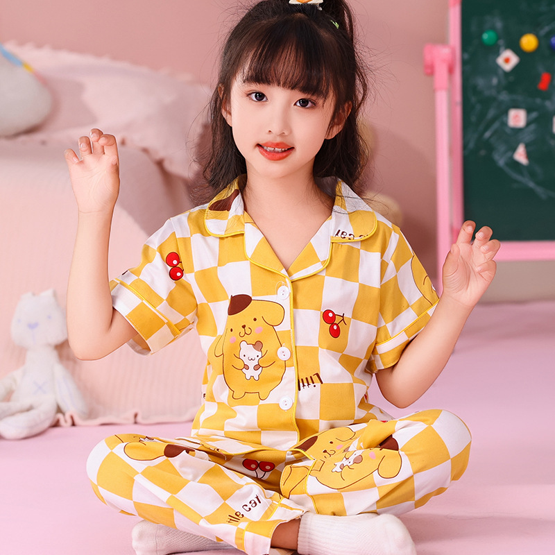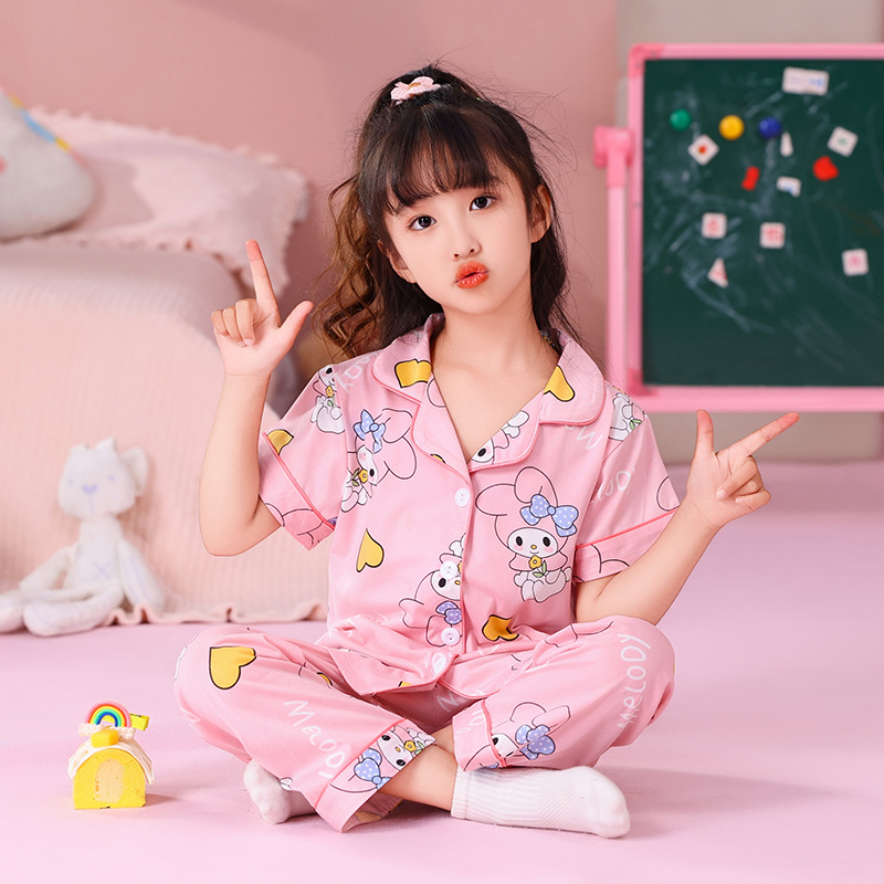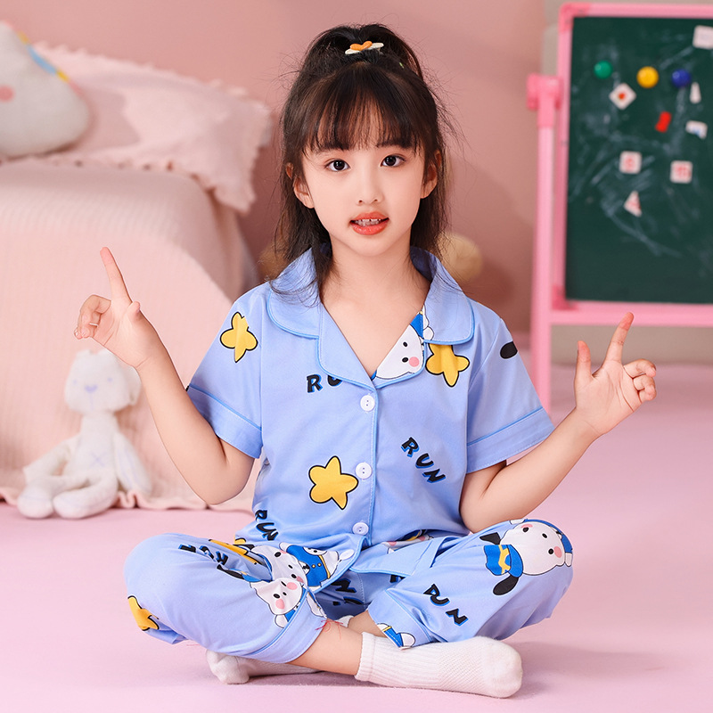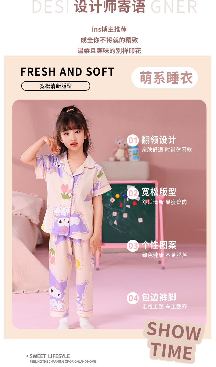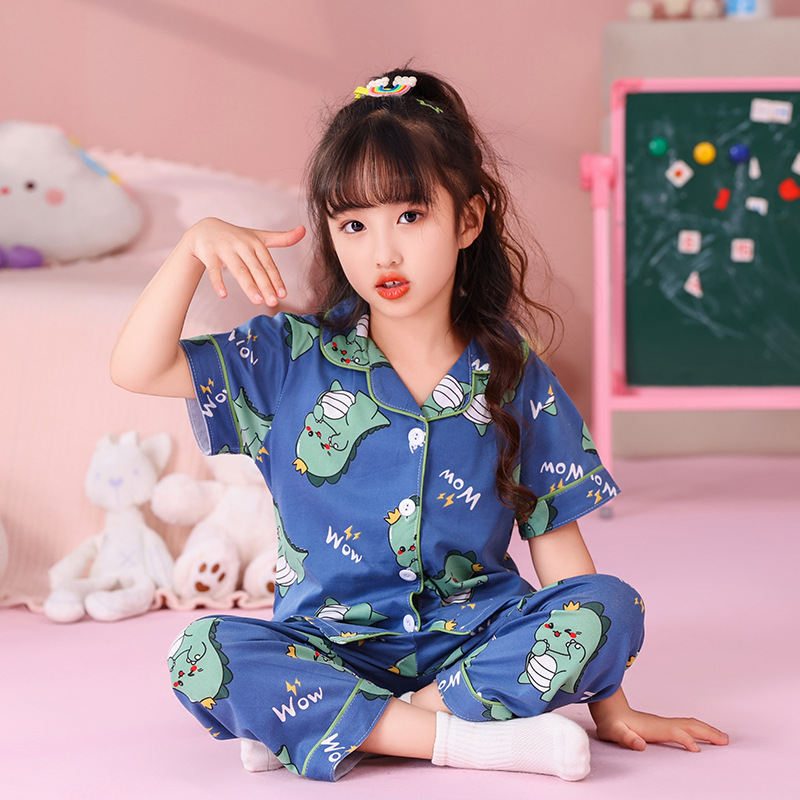 어린이 여성 잠옷 봄과 여름 반팔 바지 얇은 큰 어린이와 소녀 만화 세트 귀여운 카디건 홈 옷스토어 가기