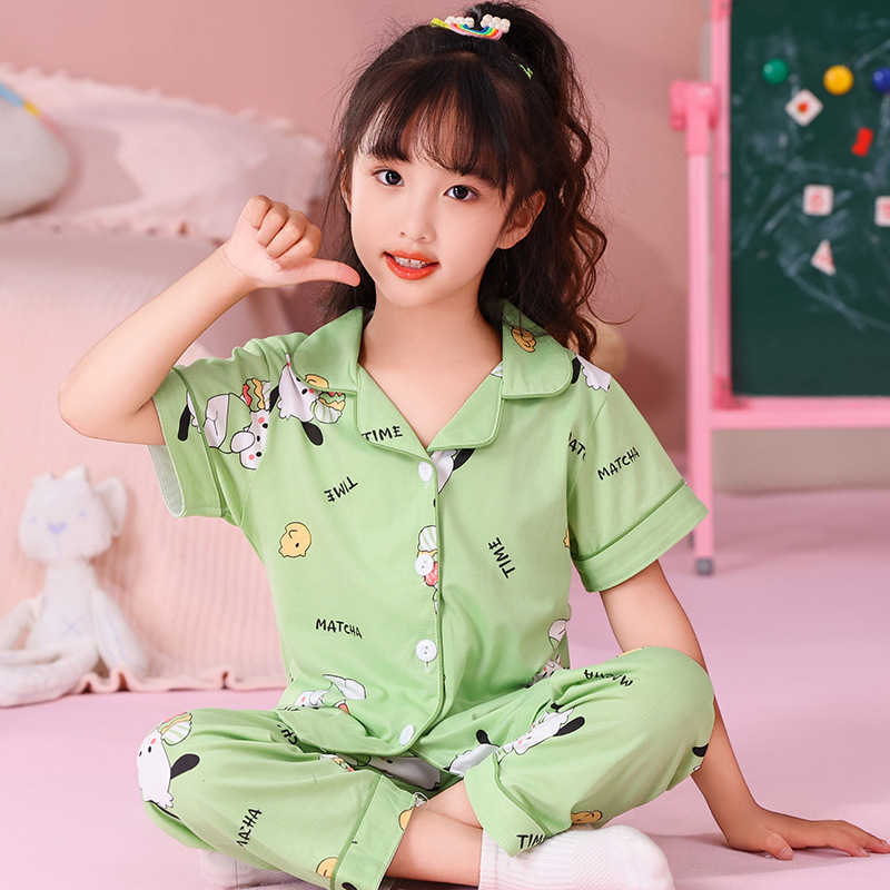 어린이 여성 잠옷 봄과 여름 반팔 바지 얇은 큰 어린이와 소녀 만화 세트 귀여운 카디건 홈 옷