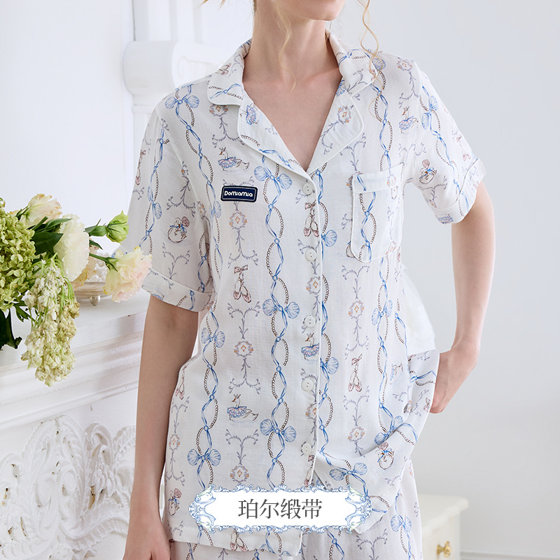 • 성인용 거즈 반팔 반바지 세트 - 진주 리본