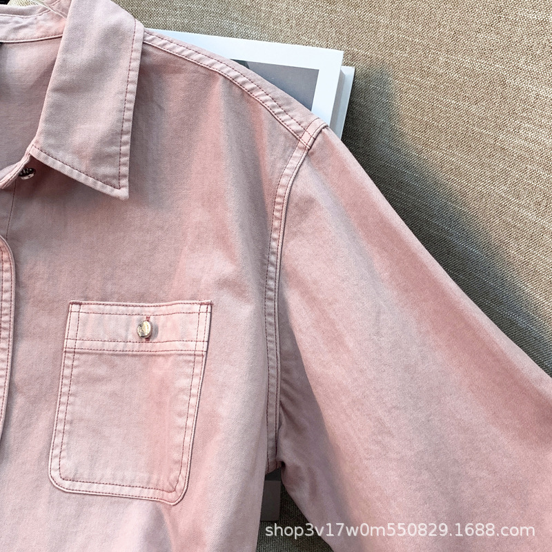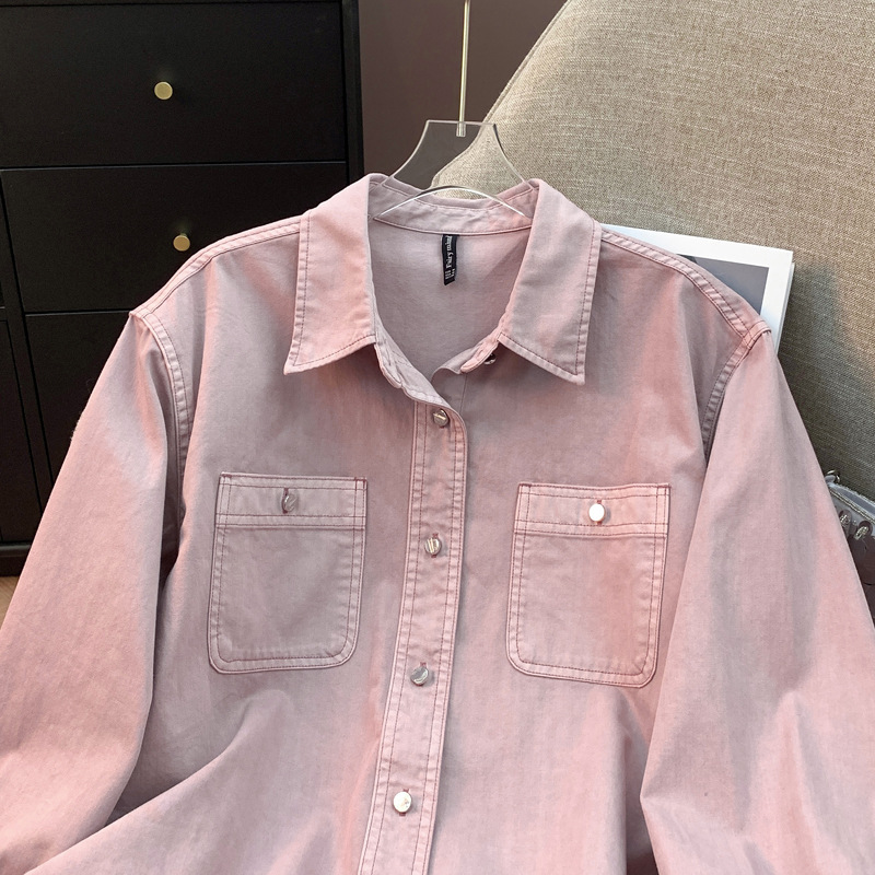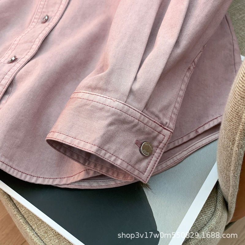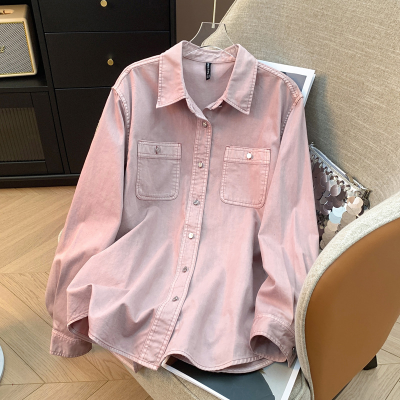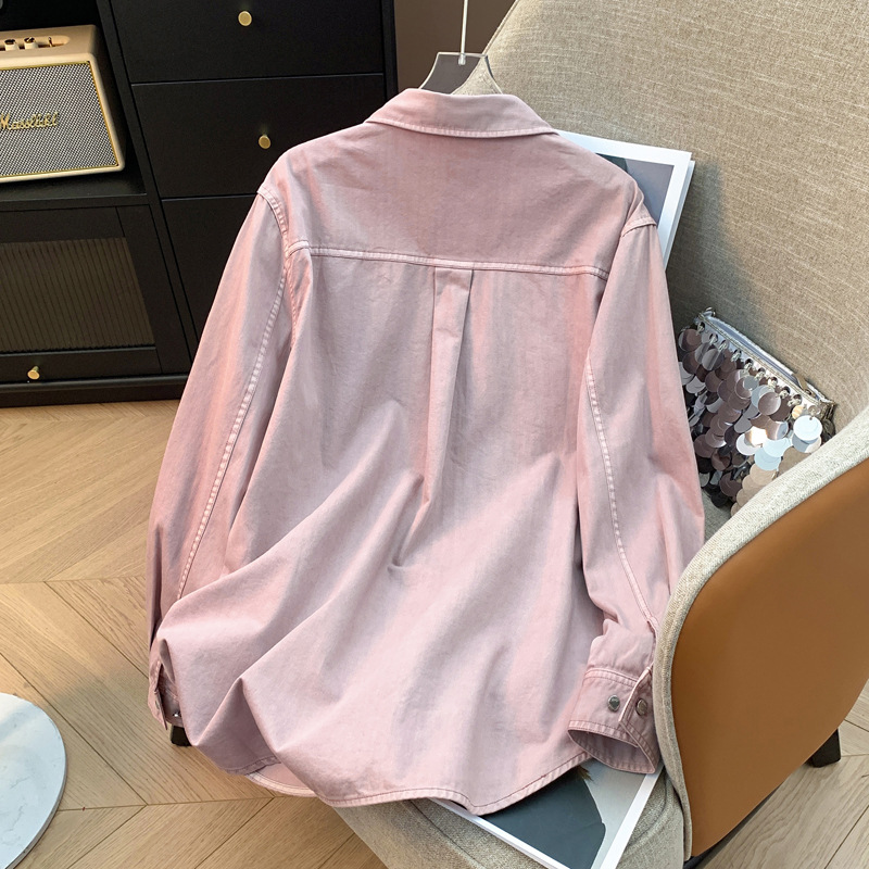 도매 고급 순면 핑크 데님 셔츠 여성 작업복 큰 사이즈 루즈핏 상의 아우터 니치 스타일 두꺼운 셔츠 여성용스토어 가기