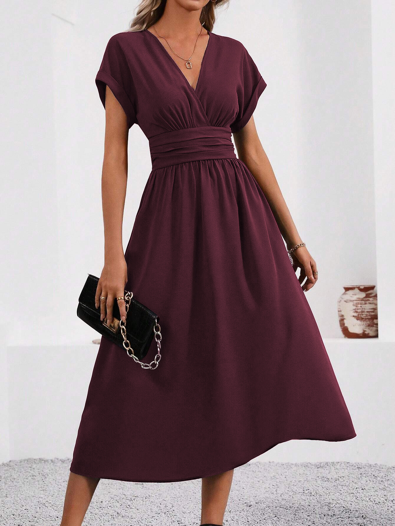 여성의 여름 단색 겹치는 V-넥 박쥐 슬리브 주름 허리 긴 우아한 원피스 여성용 긴 원피스스토어 가기