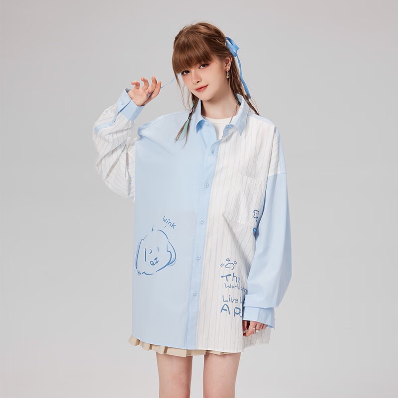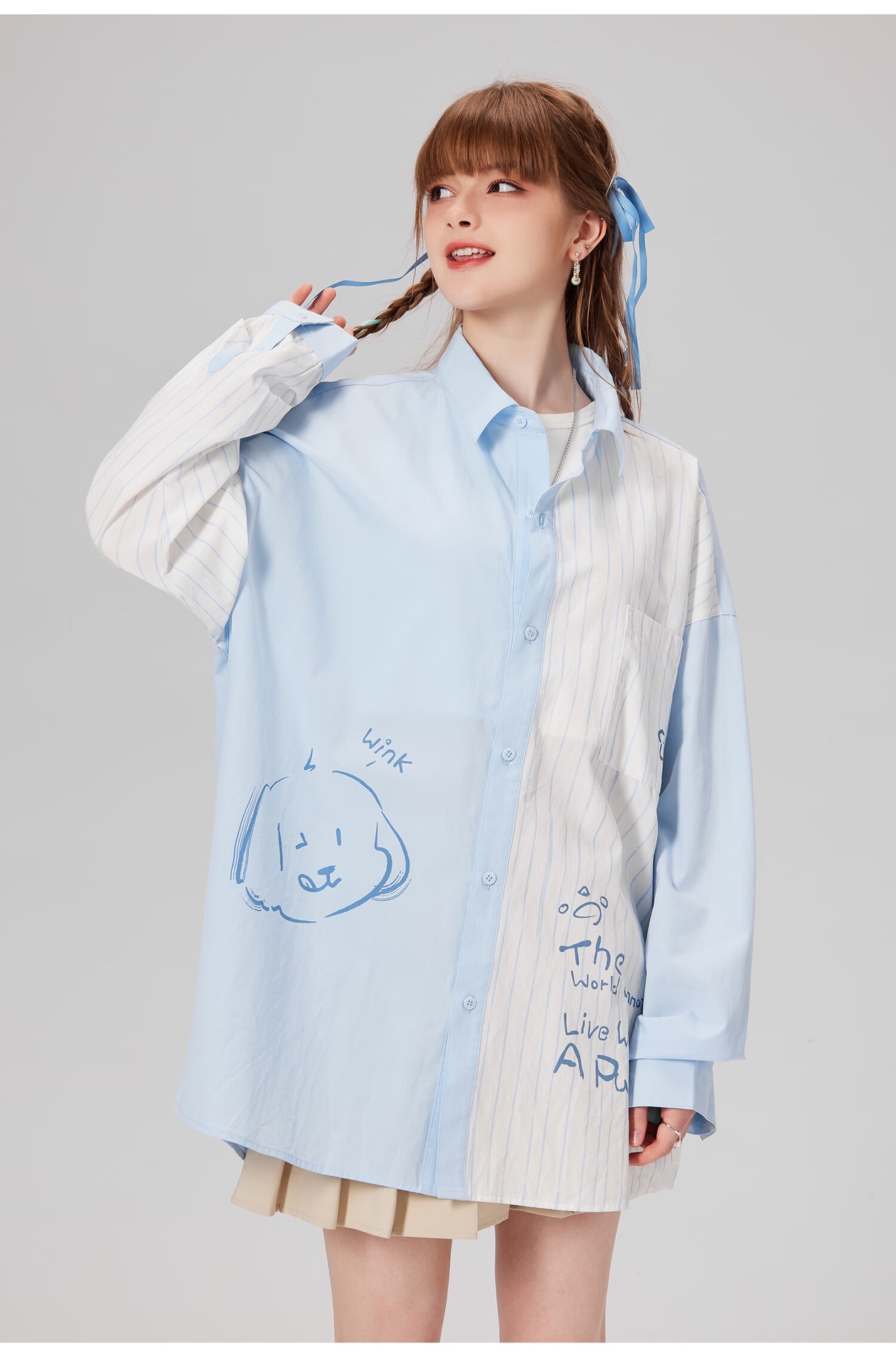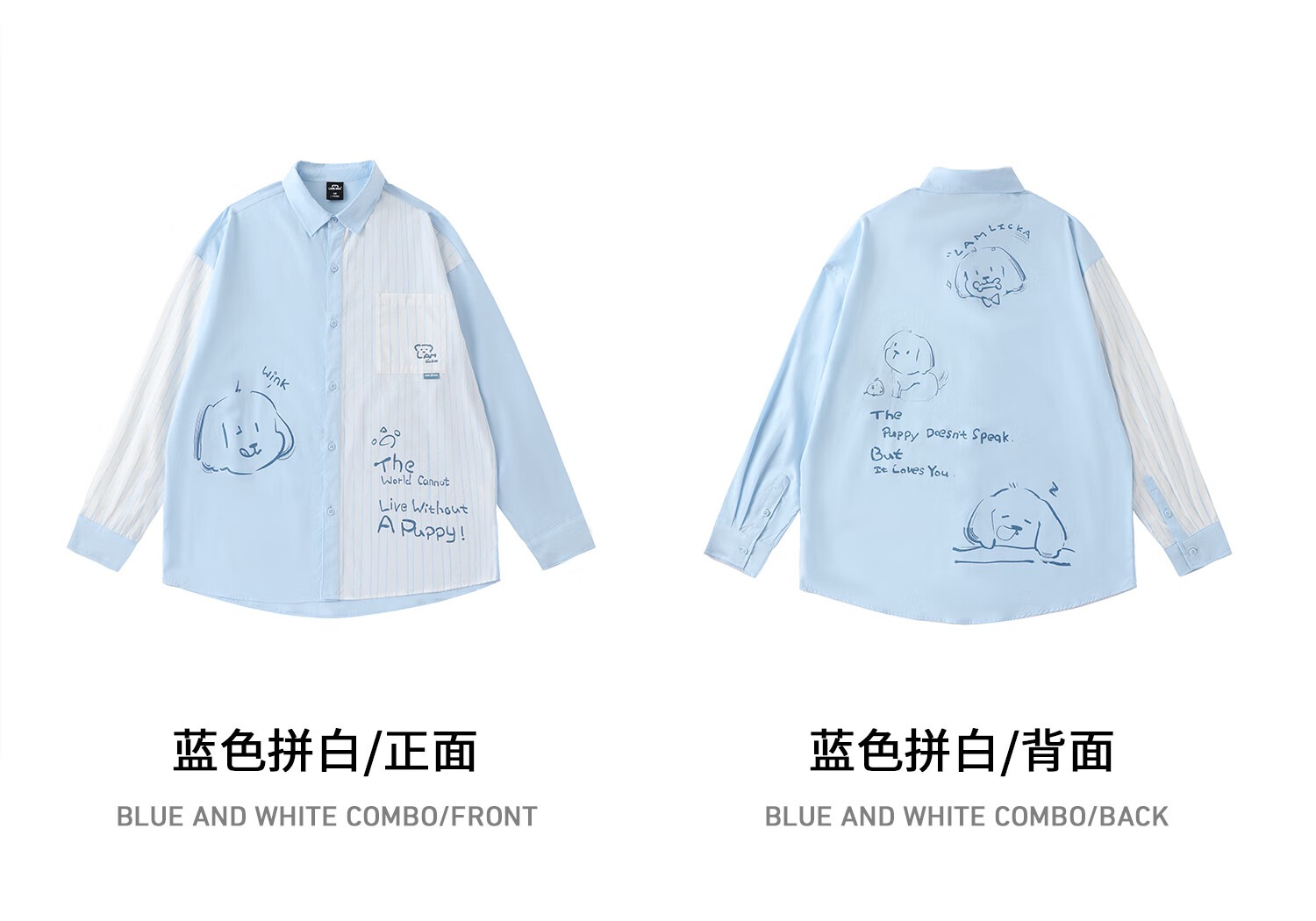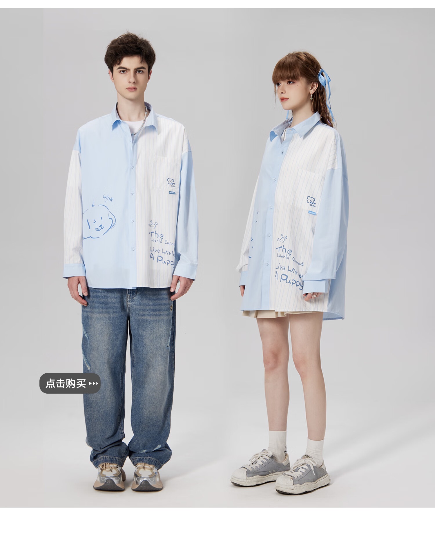 Lamlicka 강아지 시리즈 바느질 컬러 줄무늬 긴팔 셔츠 남성 옷깃 캐주얼 얇은 셔츠 커플 패션스토어 가기
