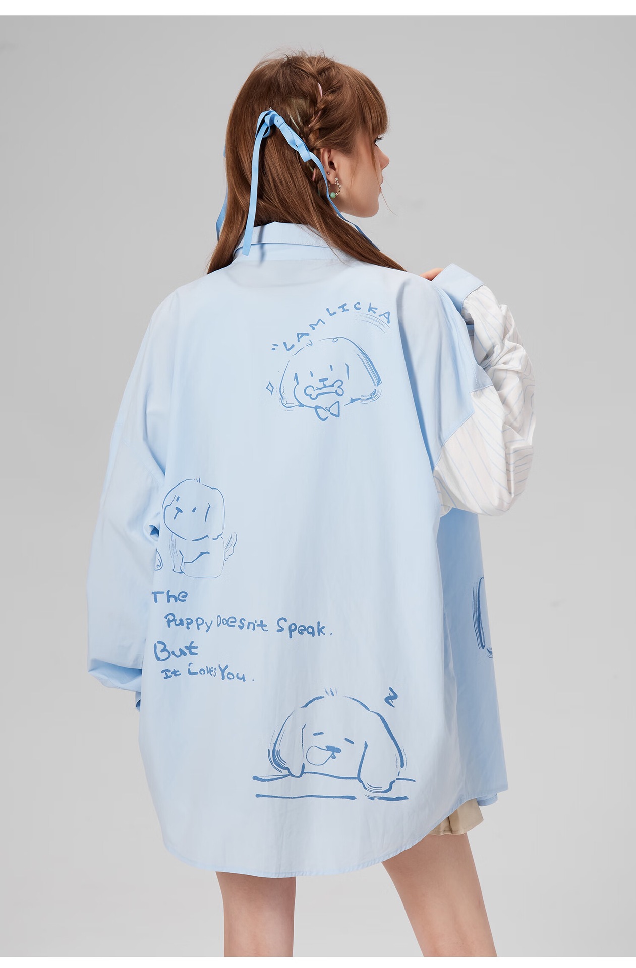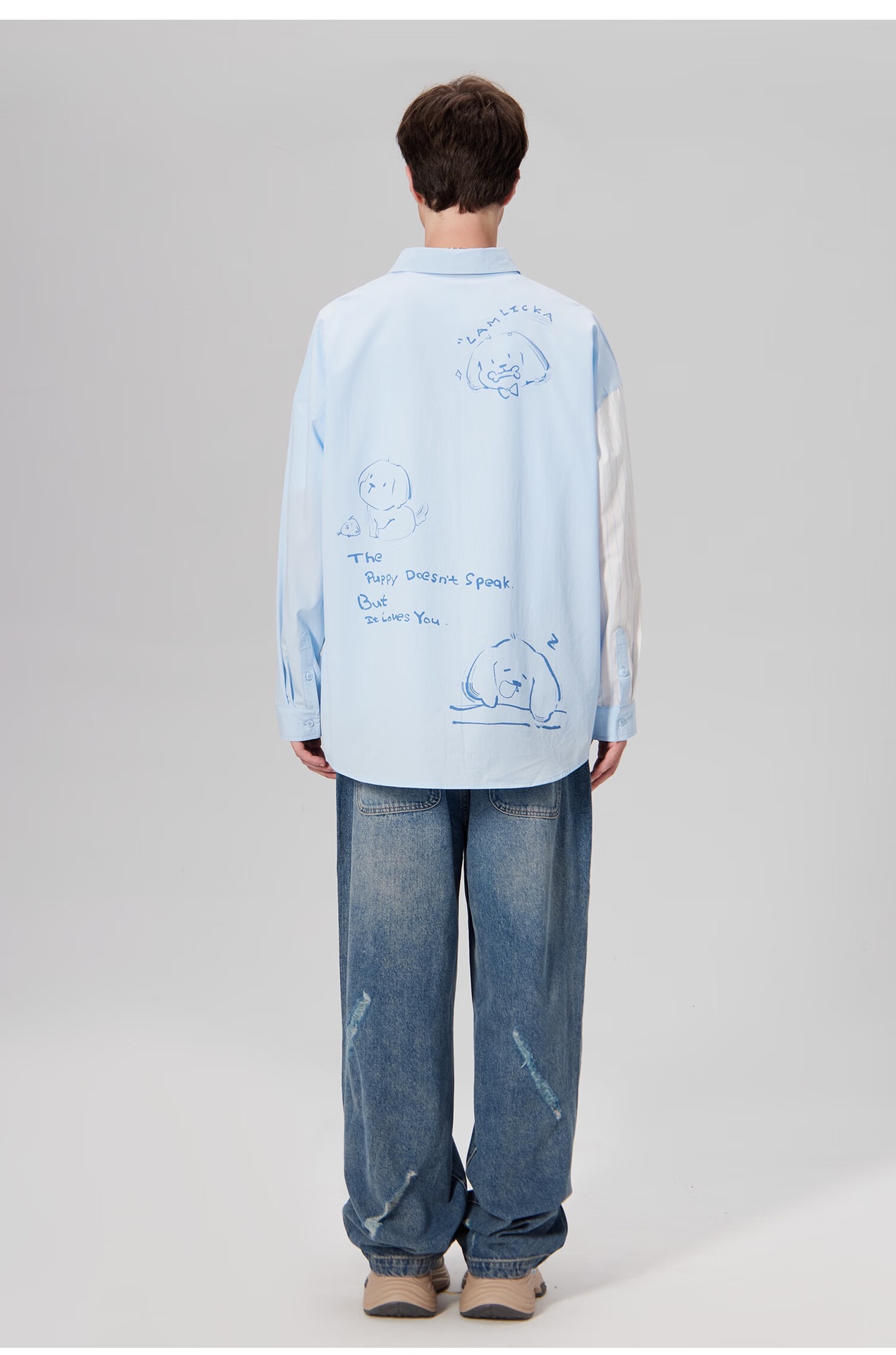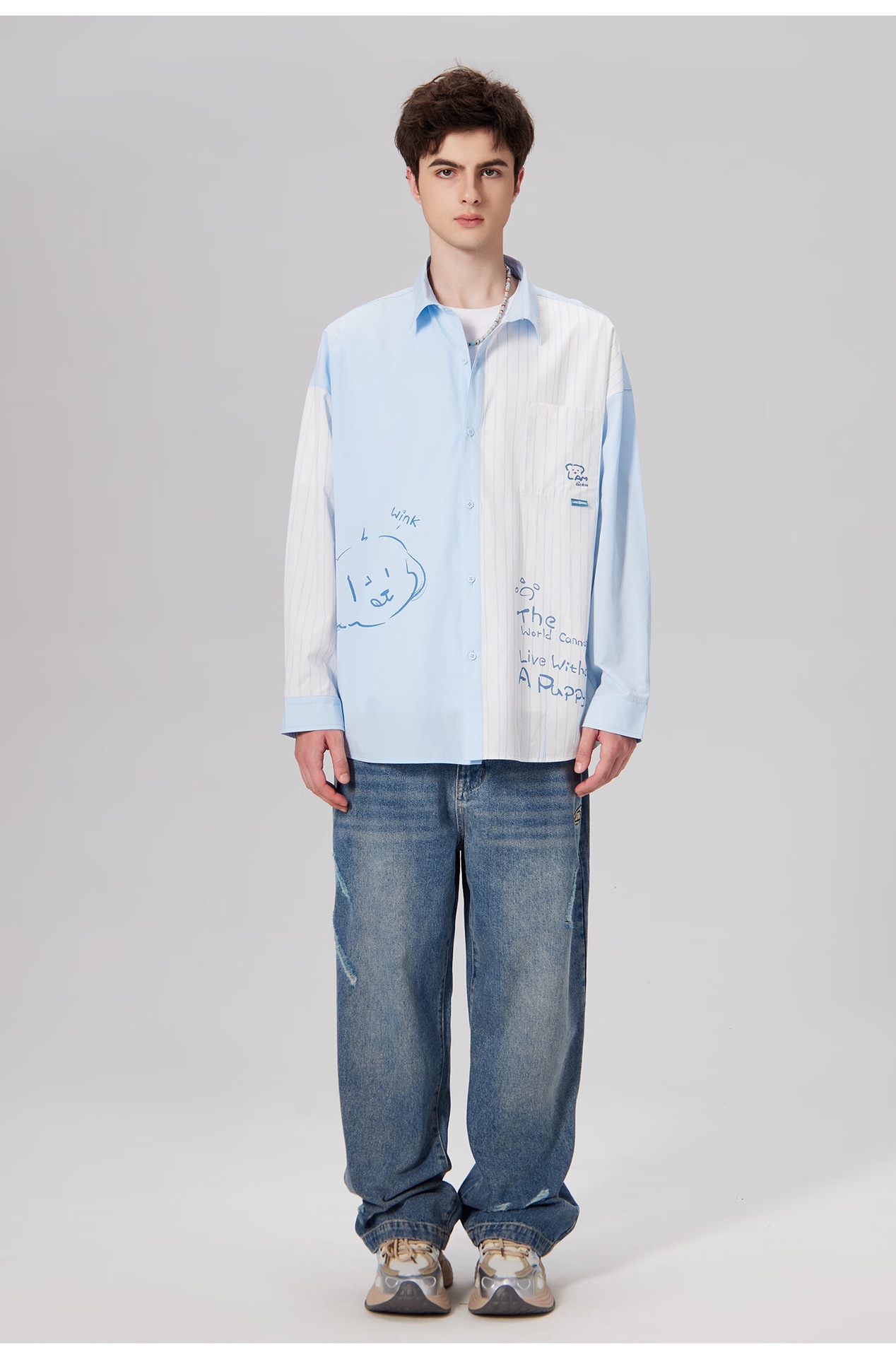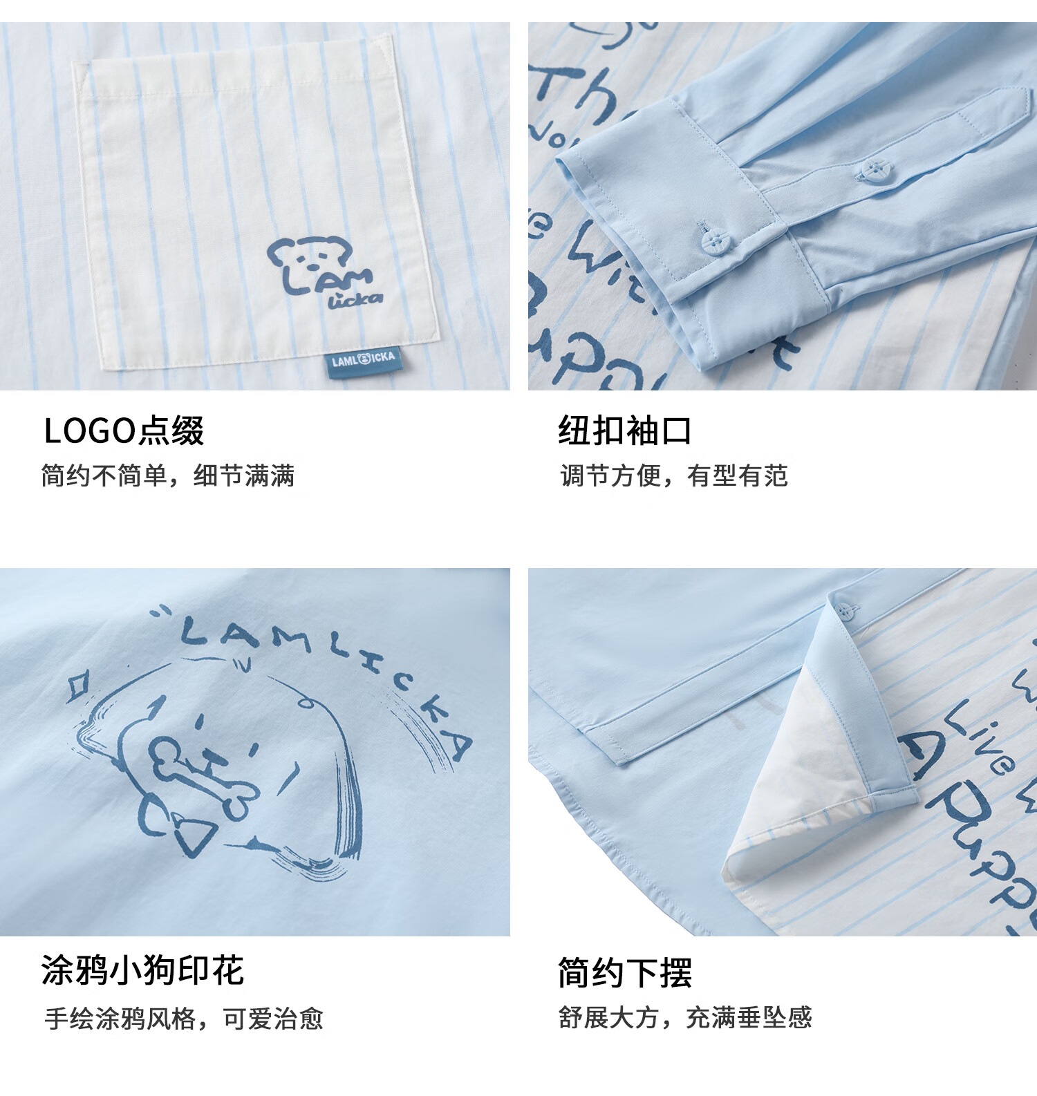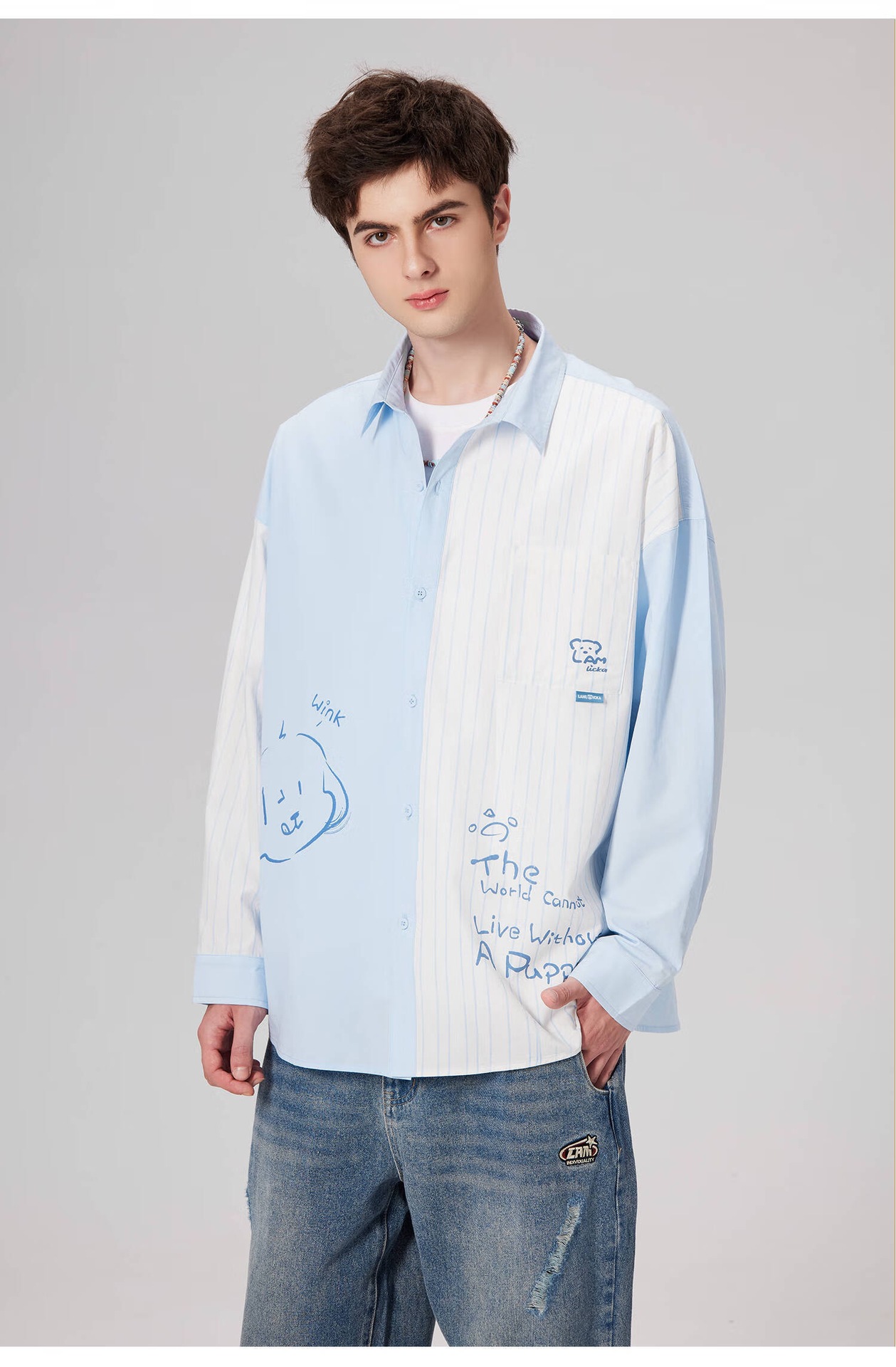 Lamlicka 강아지 시리즈 바느질 컬러 줄무늬 긴팔 셔츠 남성 옷깃 캐주얼 얇은 셔츠 커플 패션