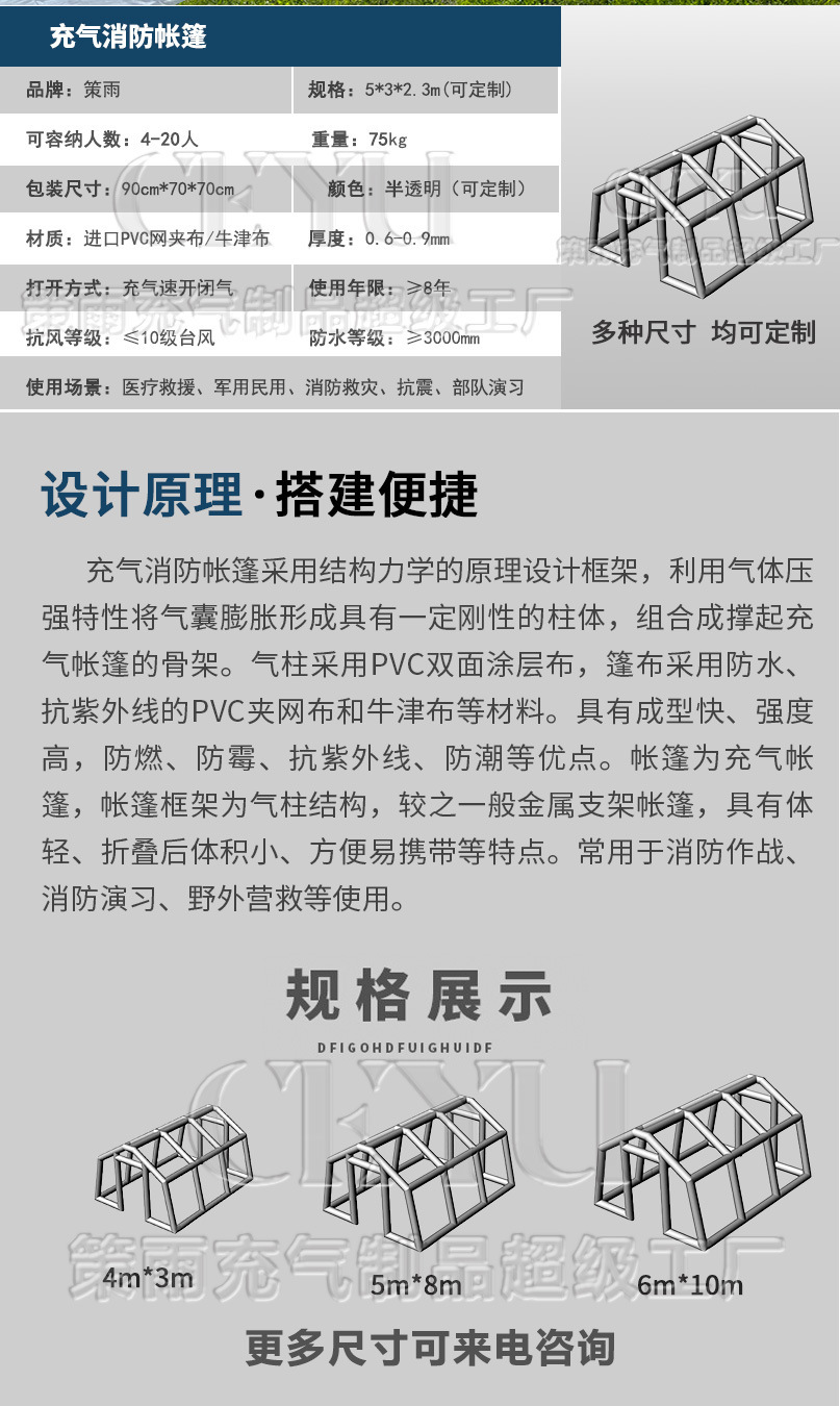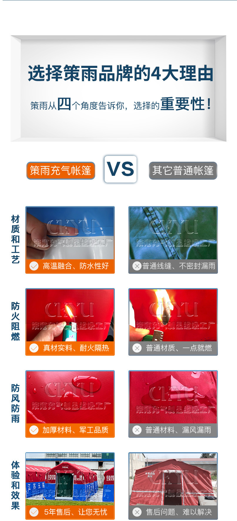 4 传统铁架帐篷搭建需要6~10人耗时两小时,费时费力而我们的充气帐篷只需两人搬运到指定地方即可使用