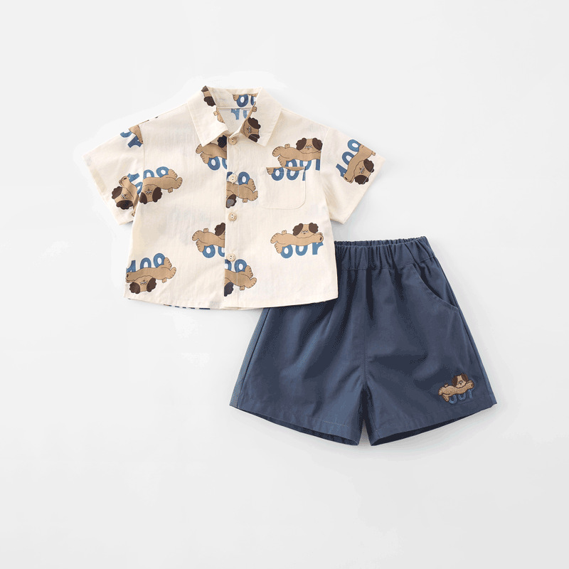 아기 여름 세트 소년 셔츠 투피스 2025 새로운 강아지 인쇄 짧은 소매 아기 어린이 의류 도매