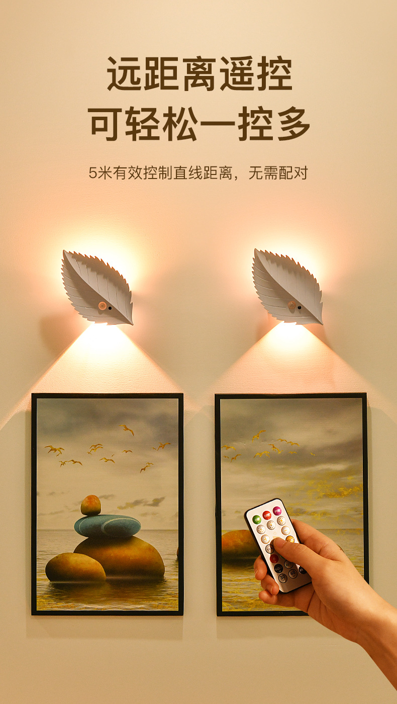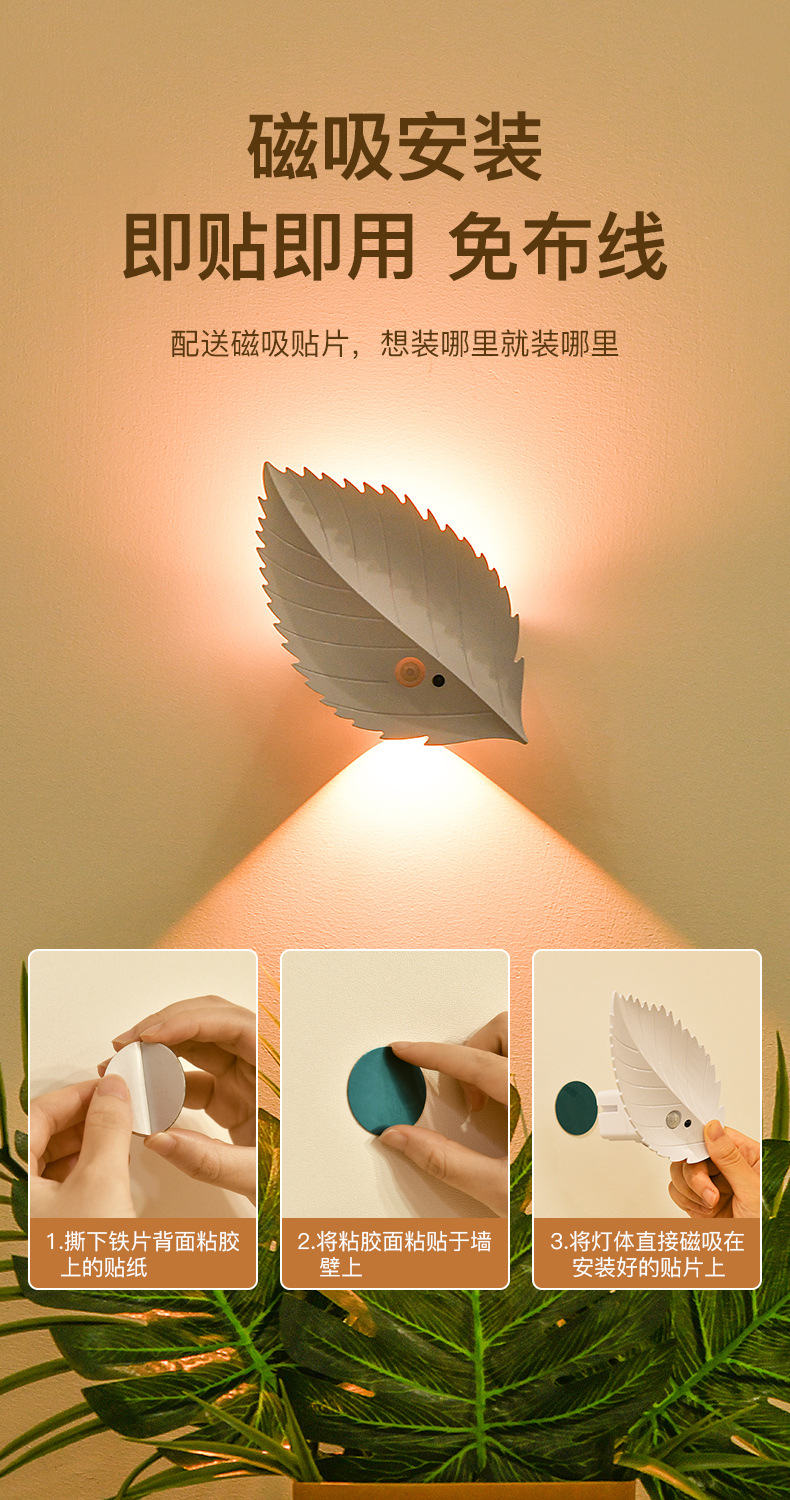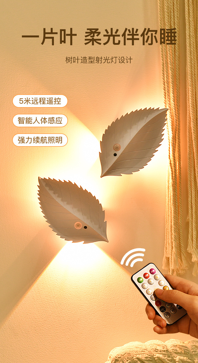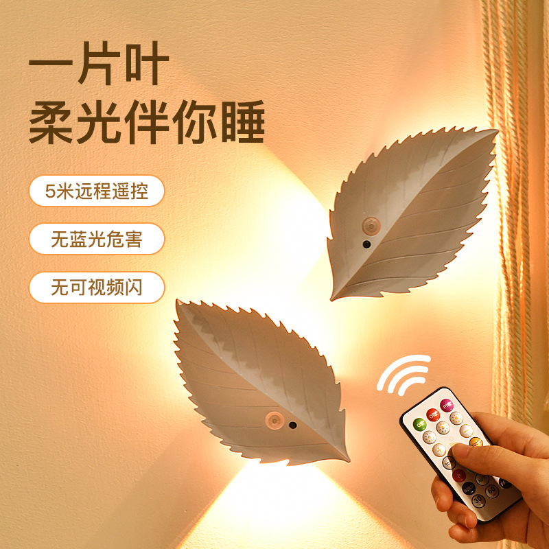 잎 인체 유도 램프 자기 접착 원격 제어 led 야간 조명 침실 물체 충전식 배터리 무선 벽 램프