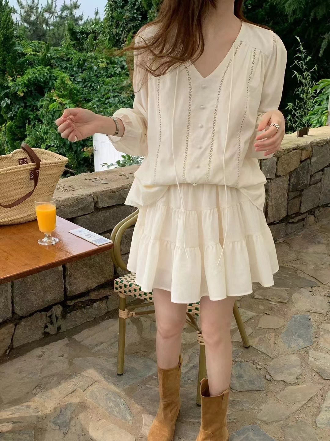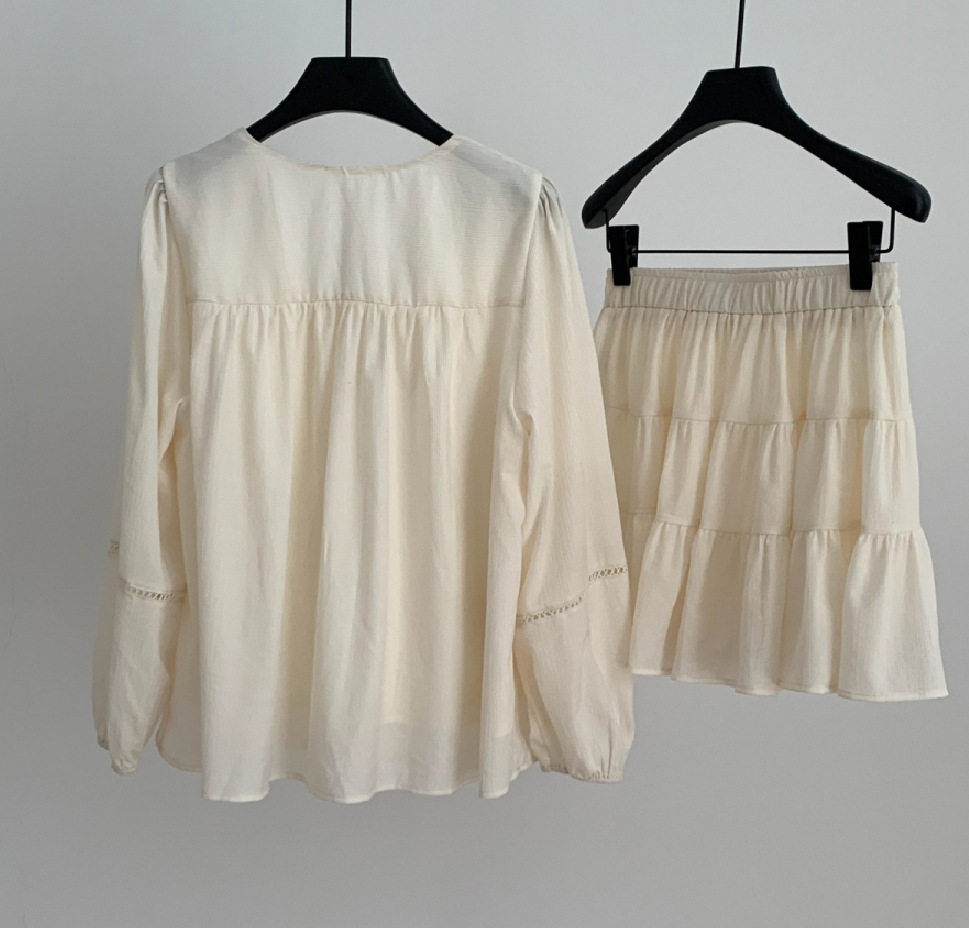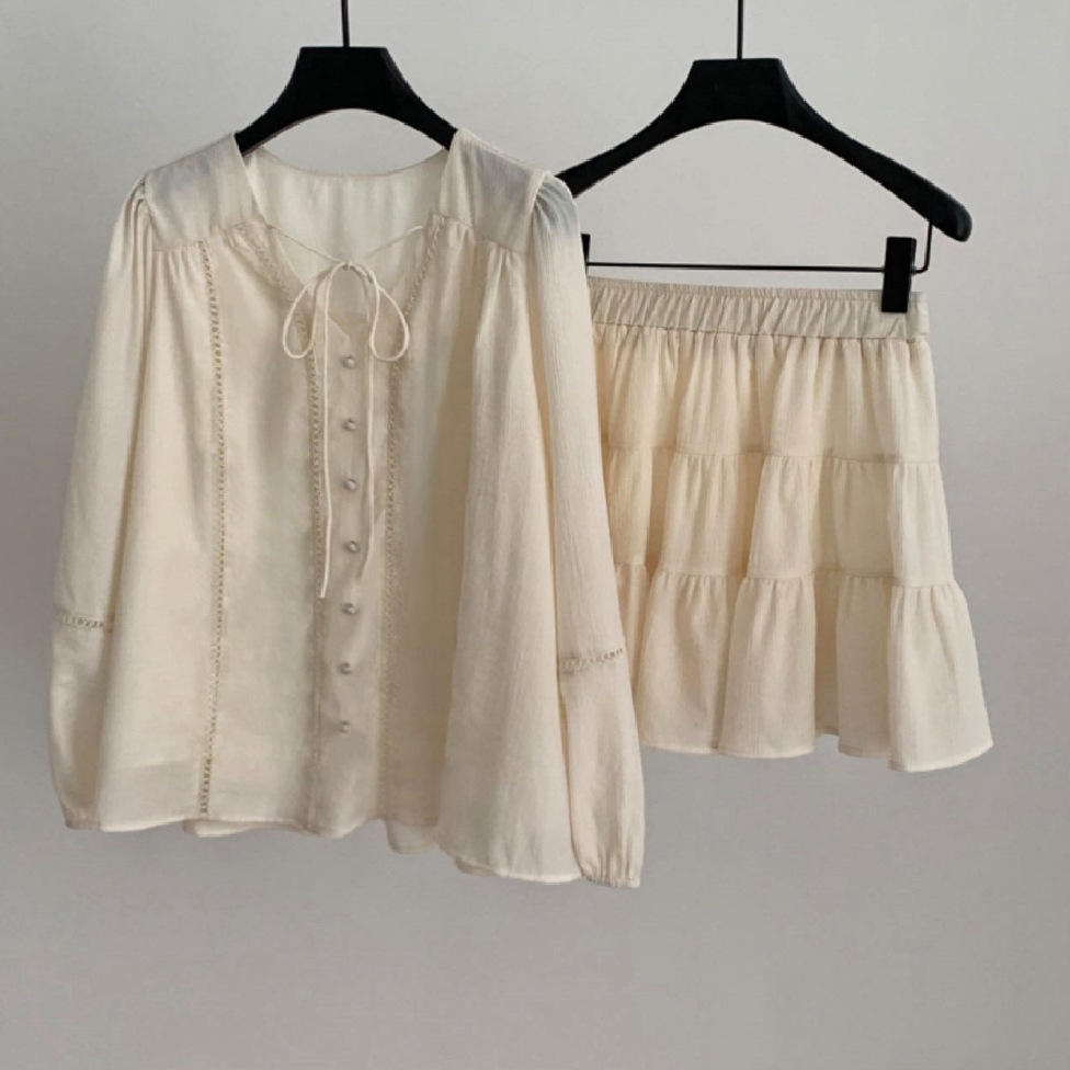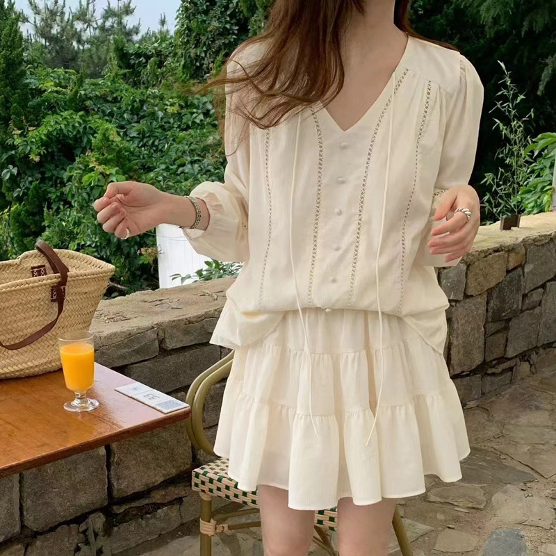 2025 새로운 한국 스타일 부드러운 스타일 V-Neck 할로우 레이스 업 셔츠 높은 허리 스커트 세트 여성용 2 피스 세트스토어 가기