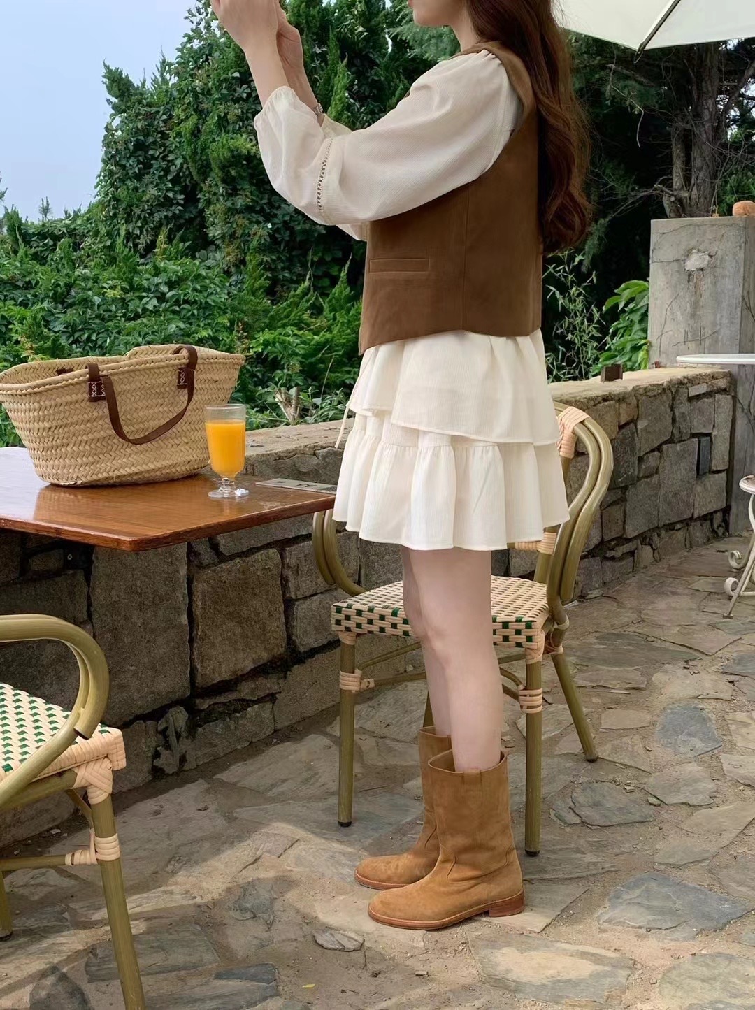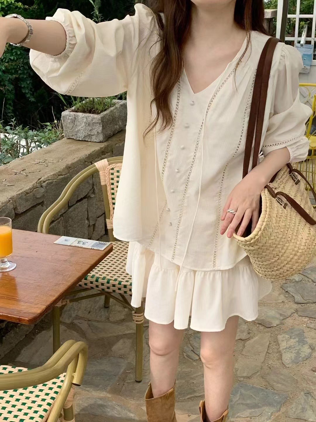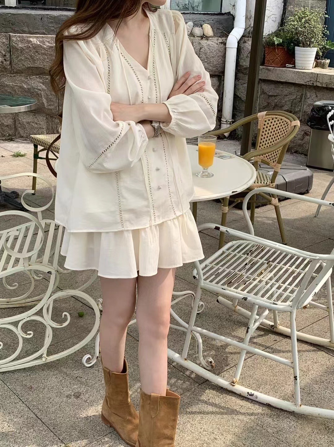 2025 새로운 한국 스타일 부드러운 스타일 V-Neck 할로우 레이스 업 셔츠 높은 허리 스커트 세트 여성용 2 피스 세트