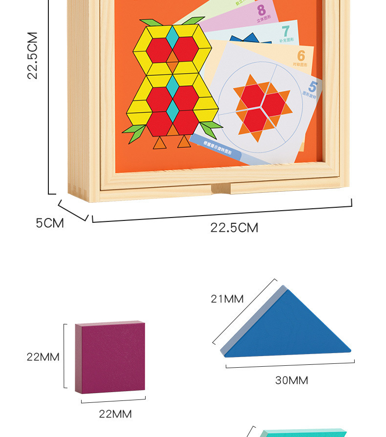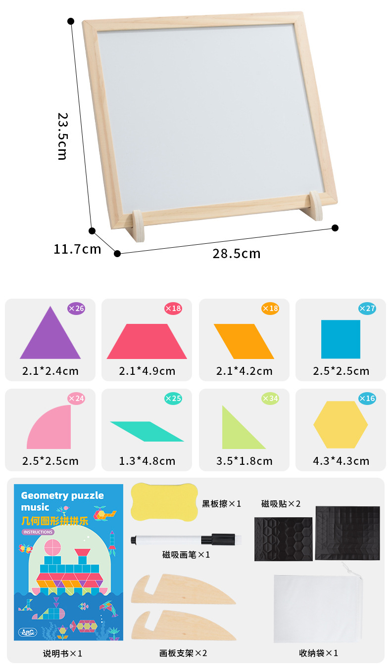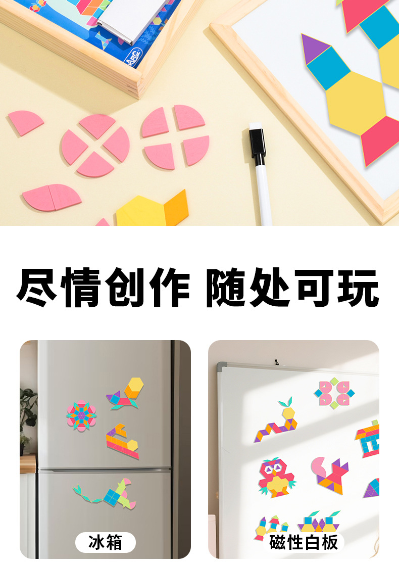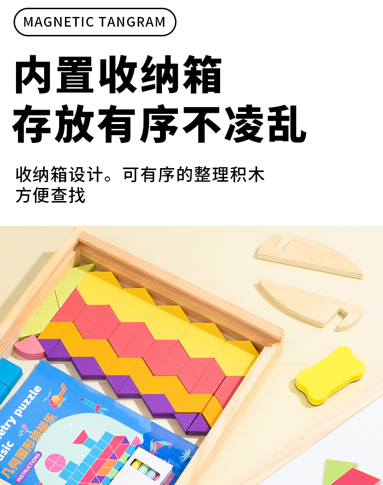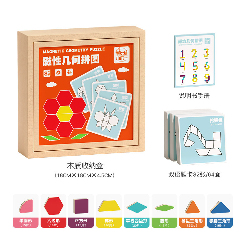 128片磁力几何七巧板拼图:1kg/18*18*4.5,木制收纳盒