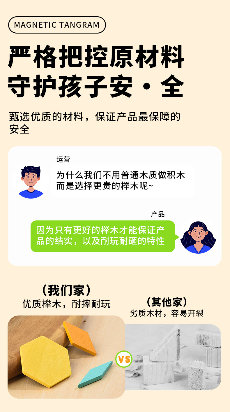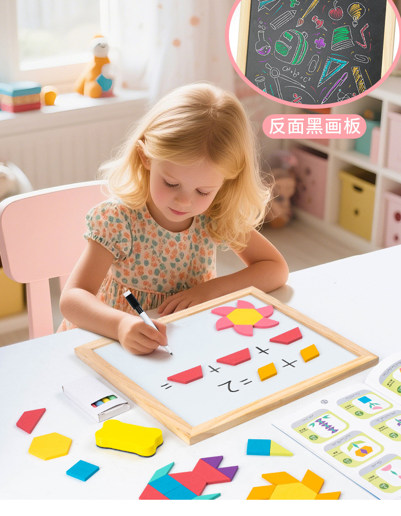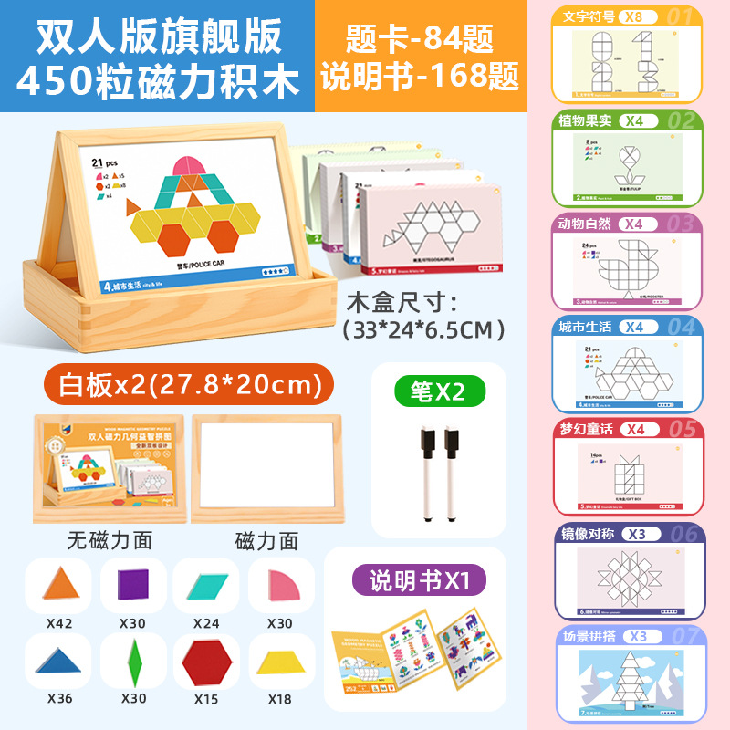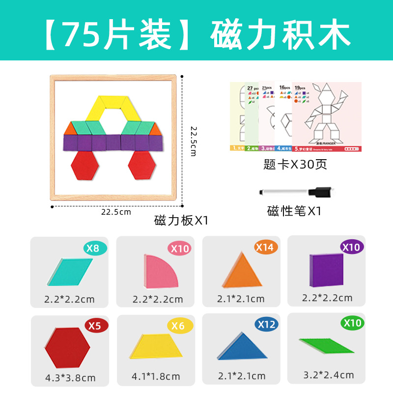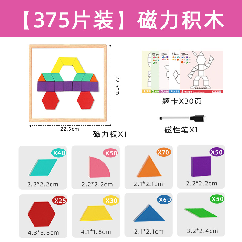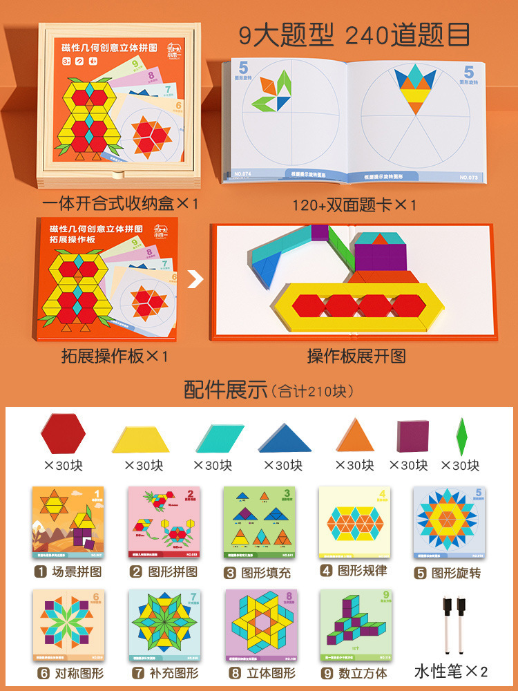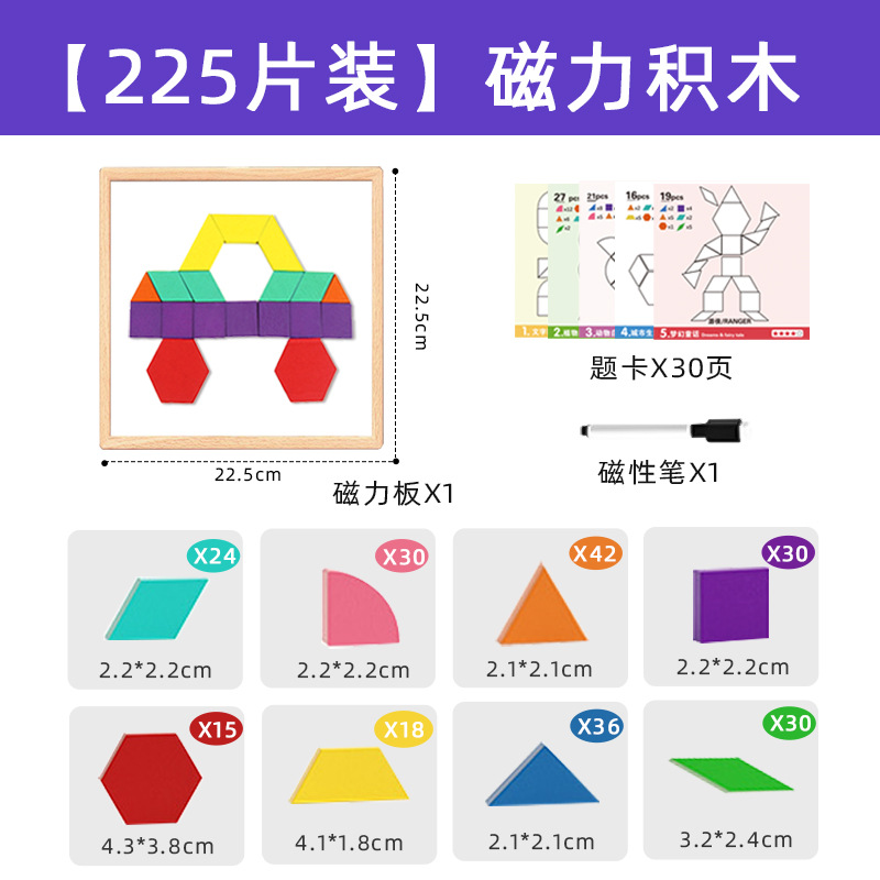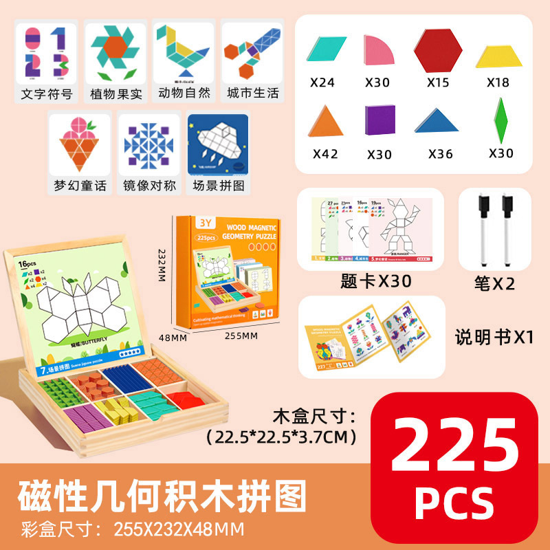 【新款自带磁力】225片磁性七巧板(说明书+题卡+场景卡):0.7kg 牛皮纸盒/彩盒 产品尺寸22.5*22.5*3.7