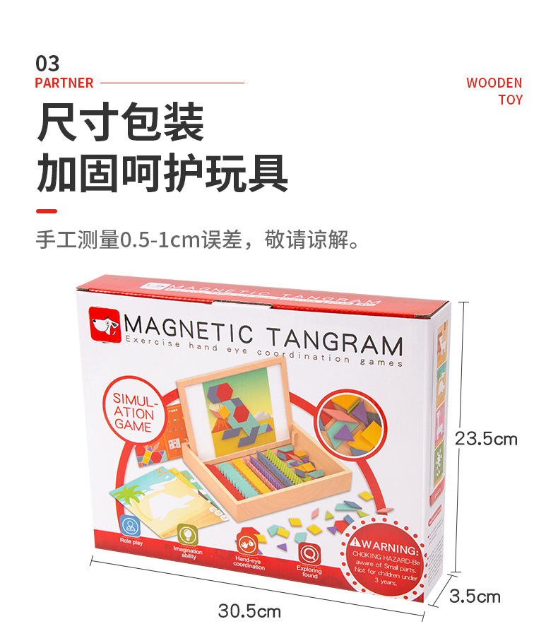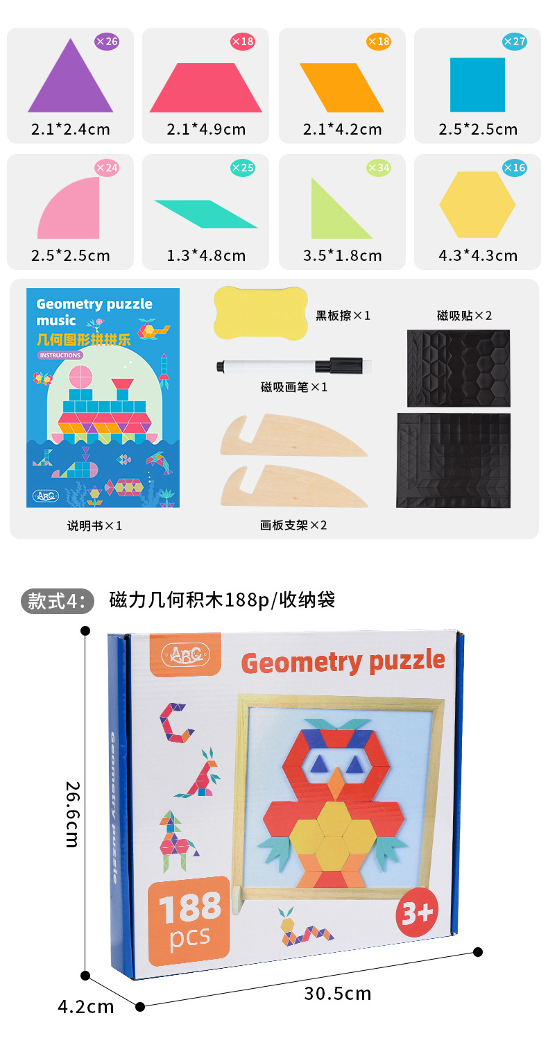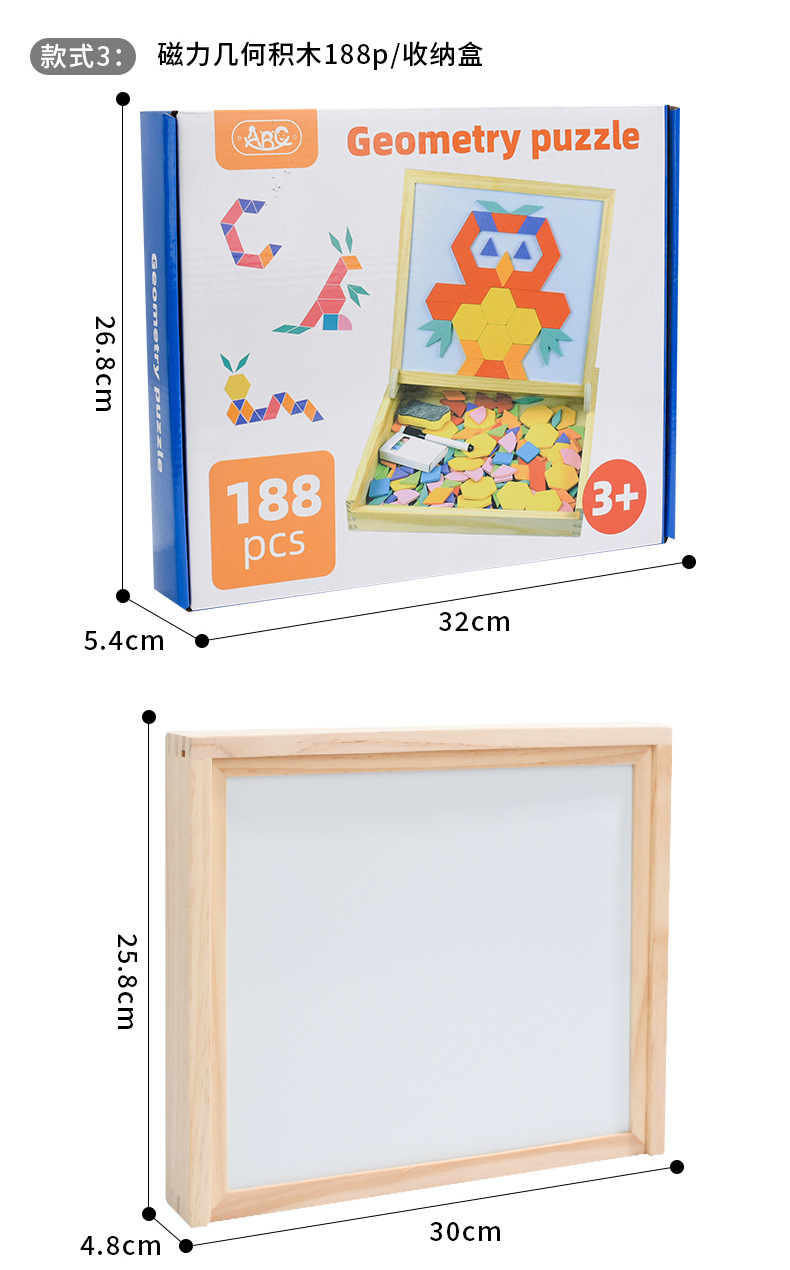 188片木盒磁性几何七巧板(CPC/CE) :1.29kg / 32*27*5cm ,20套 / 56.5*33*56cm / 26.8kg