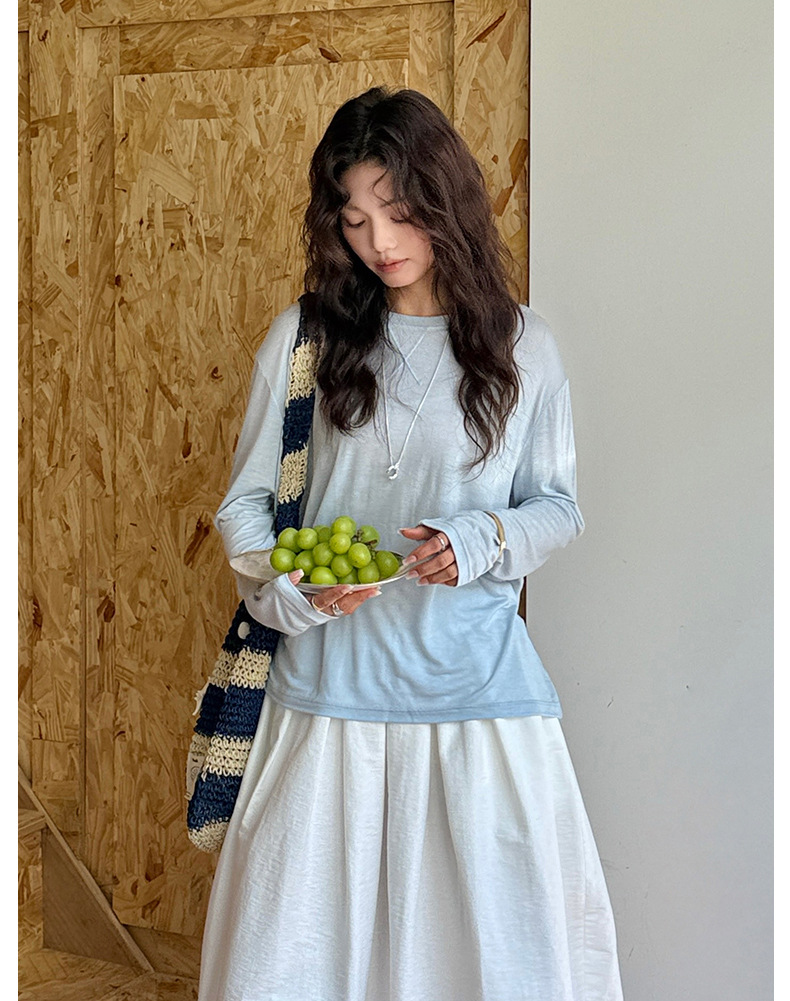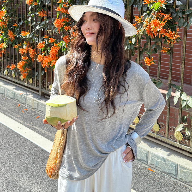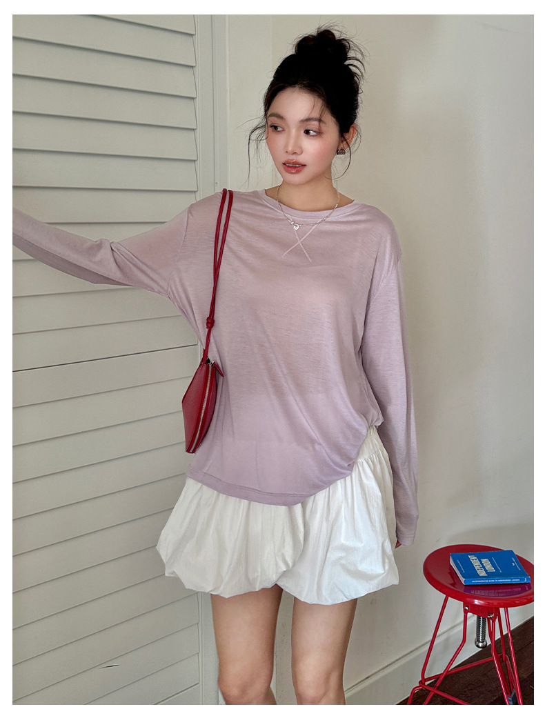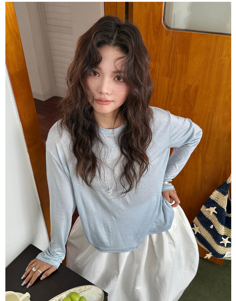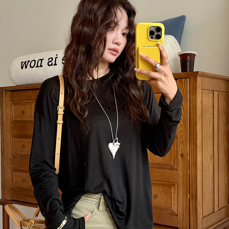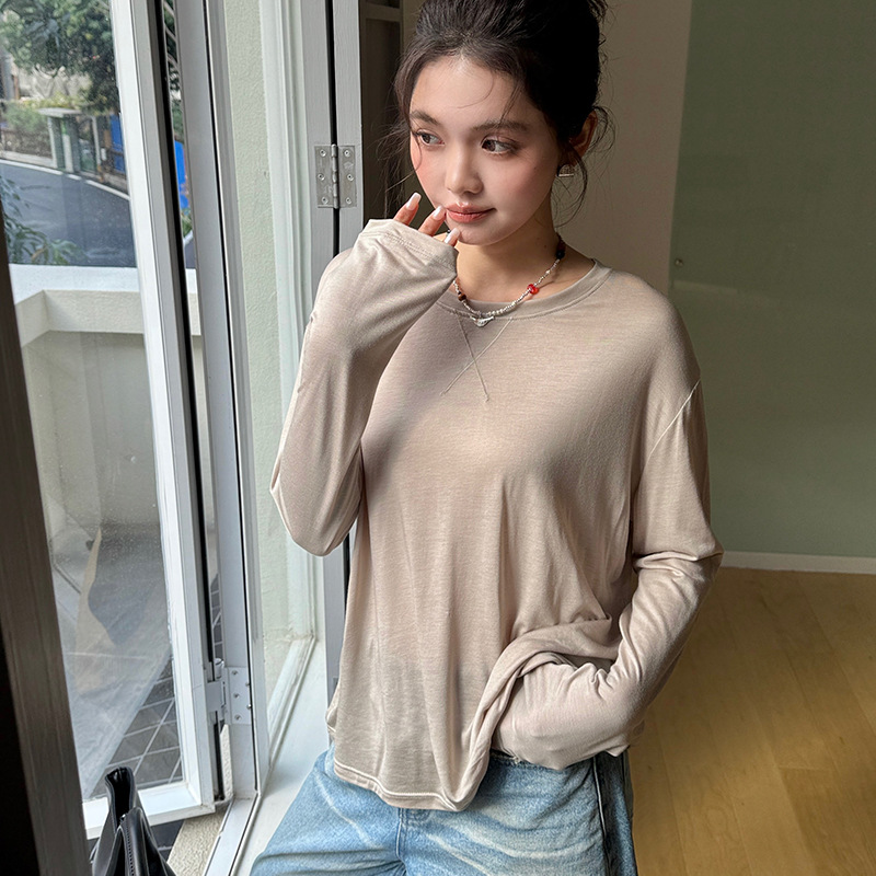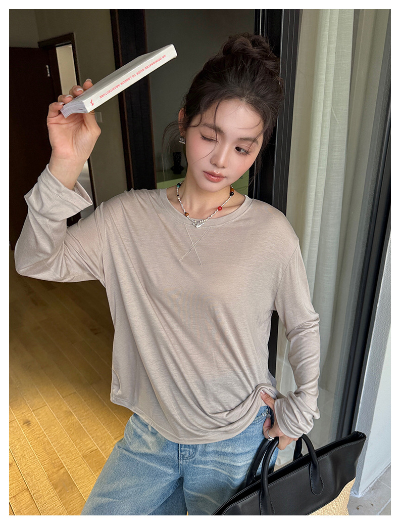 Morishima Tencel Acetic Base 셔츠 여성의 2025 봄과 여름 단색 느슨한 크루 넥 블라우스 양모 긴팔 티셔츠