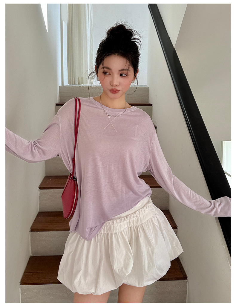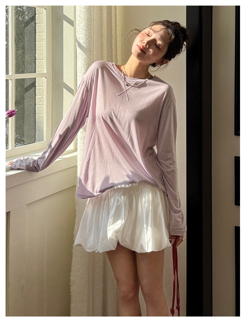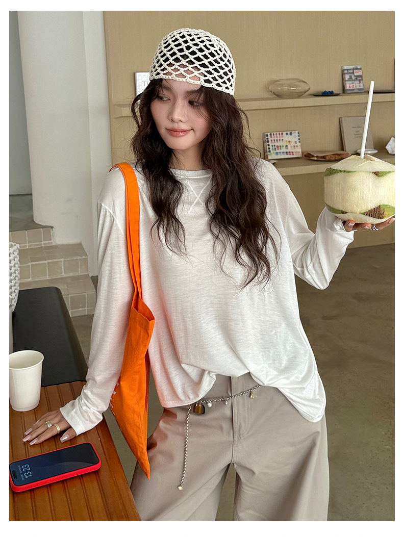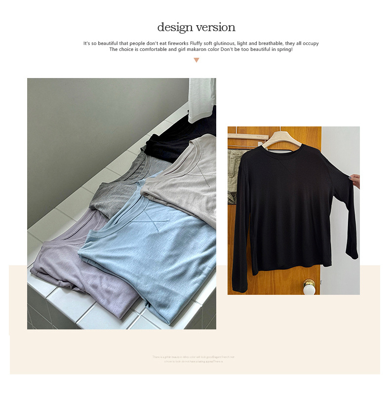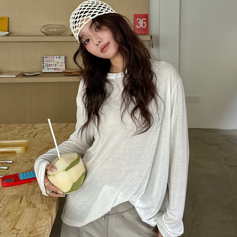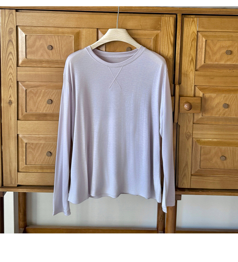 Morishima Tencel Acetic Base 셔츠 여성의 2025 봄과 여름 단색 느슨한 크루 넥 블라우스 양모 긴팔 티셔츠