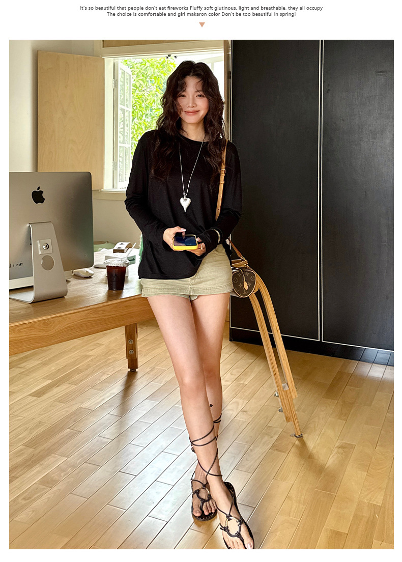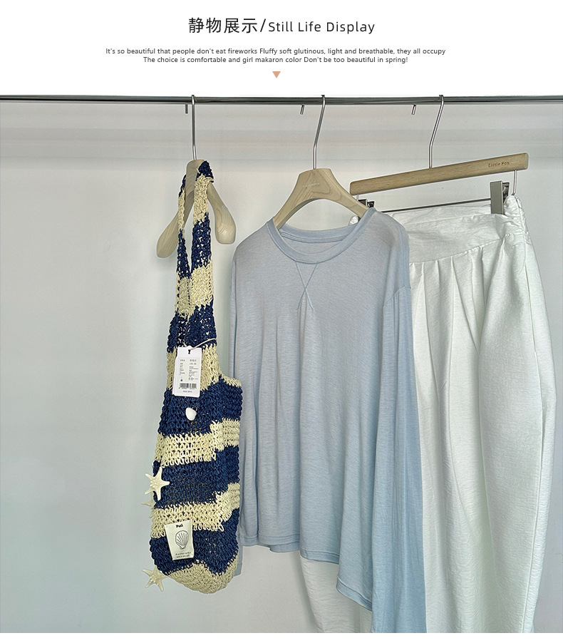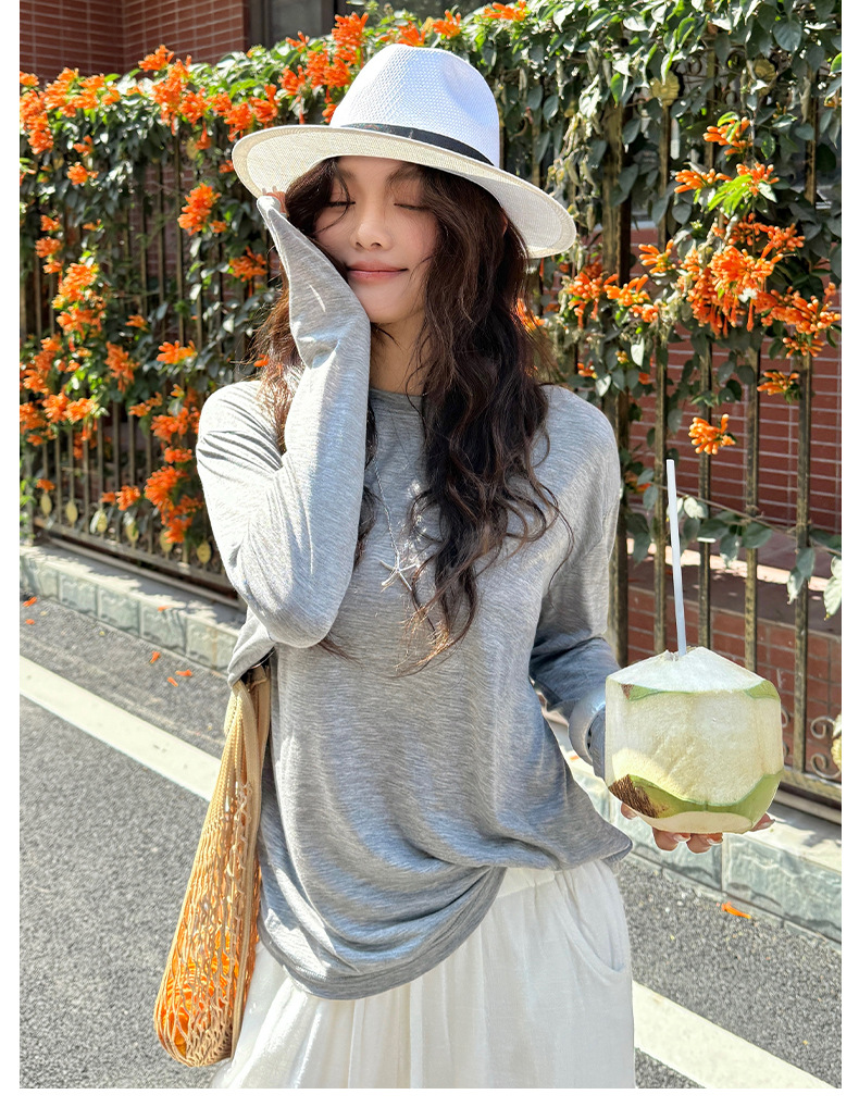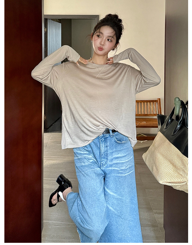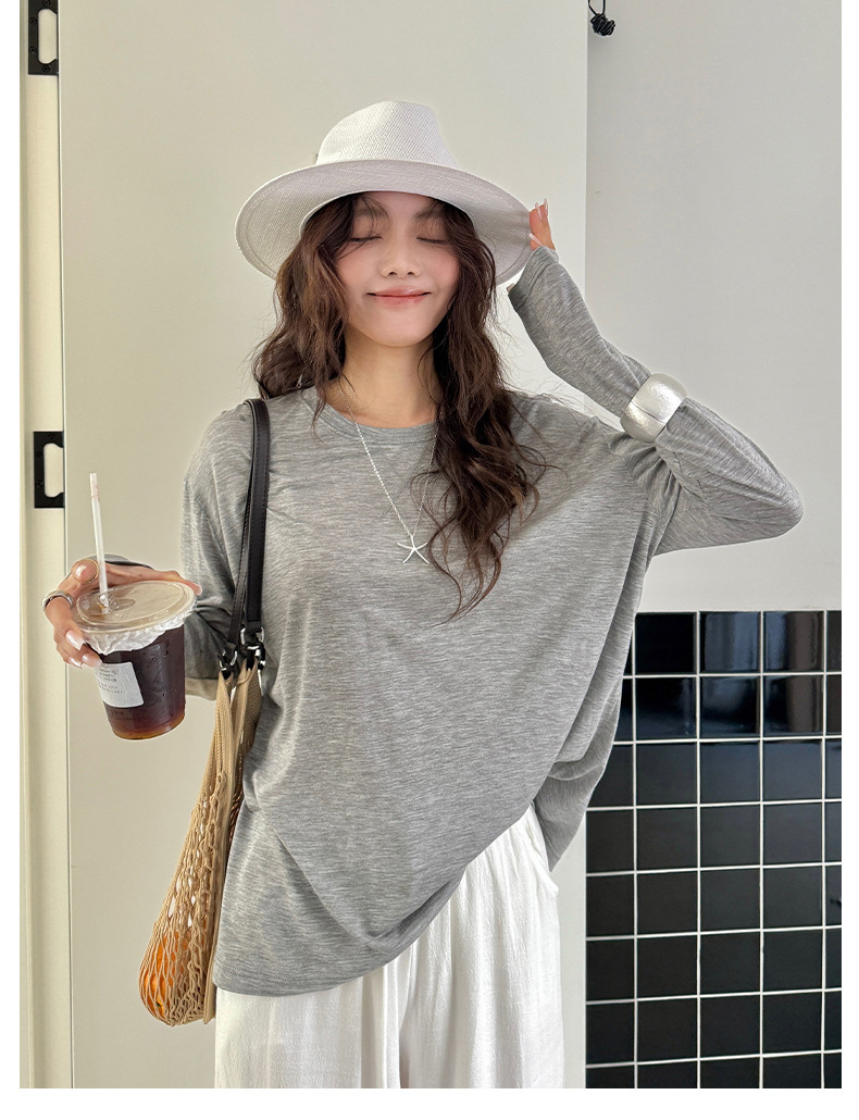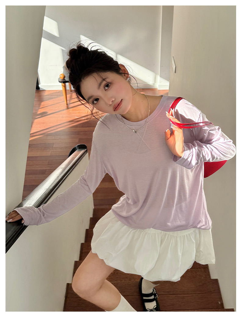 Morishima Tencel Acetic Base 셔츠 여성의 2025 봄과 여름 단색 느슨한 크루 넥 블라우스 양모 긴팔 티셔츠
