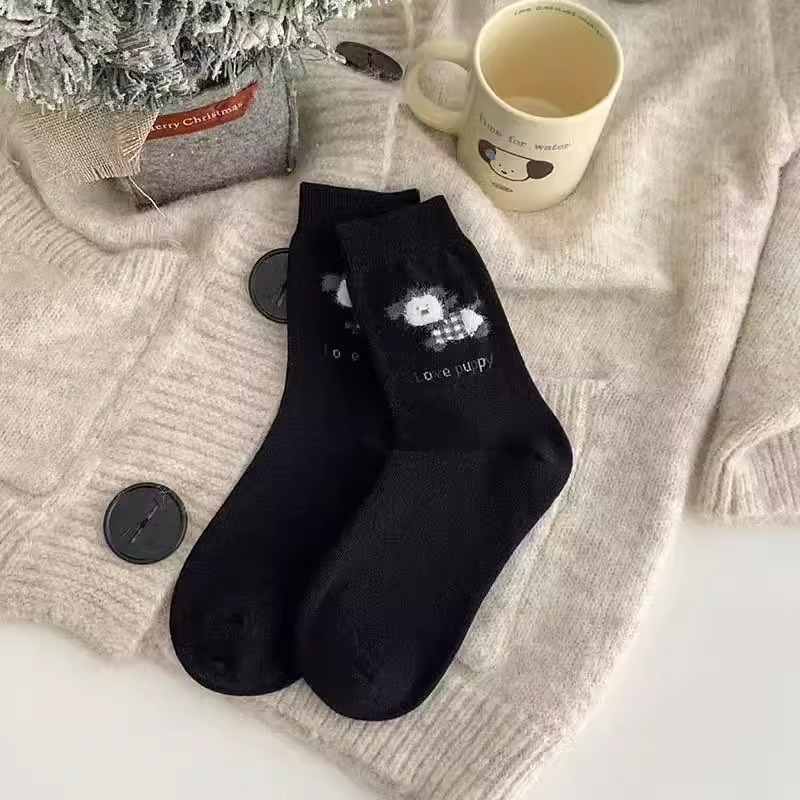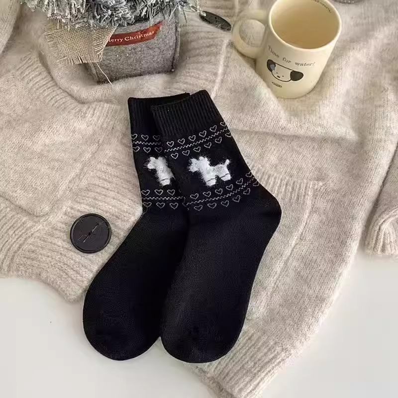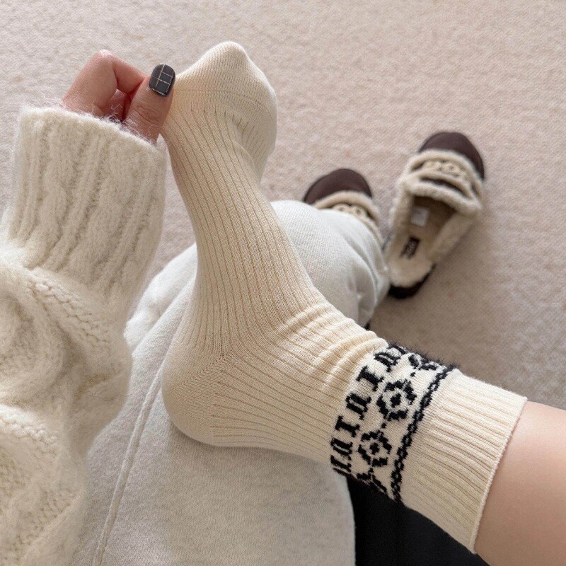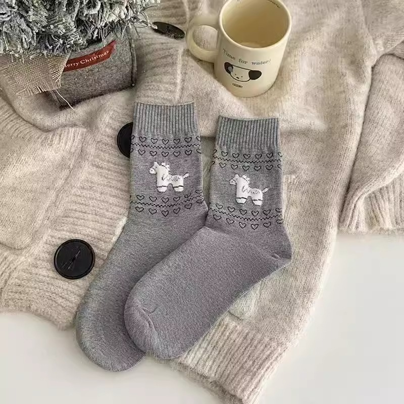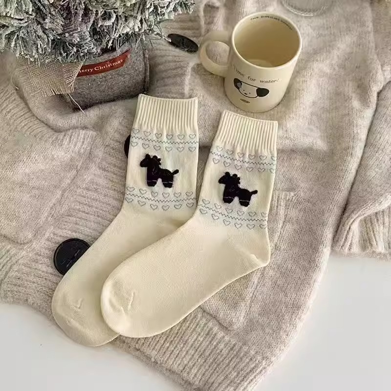 양말 여성용 종아리 중간 양말 봄과 가을 복고풍 니트 자카드 기하학적 단순 민족 스타일 페어 아일 강아지 양말