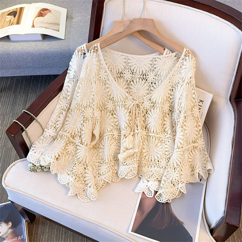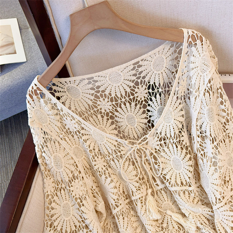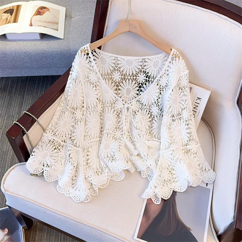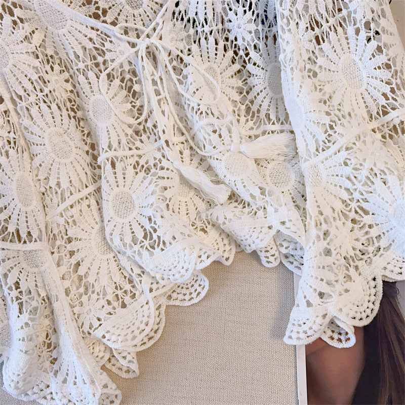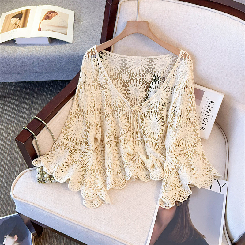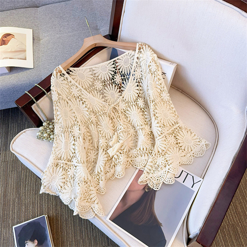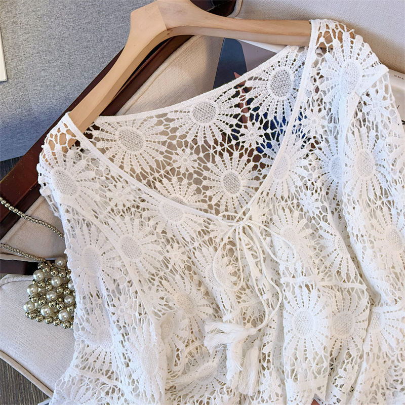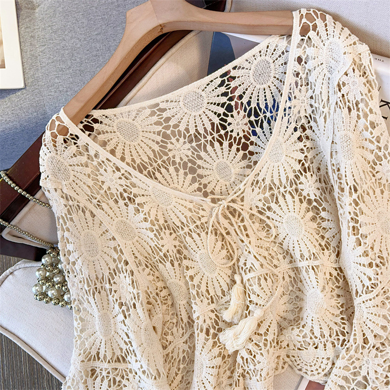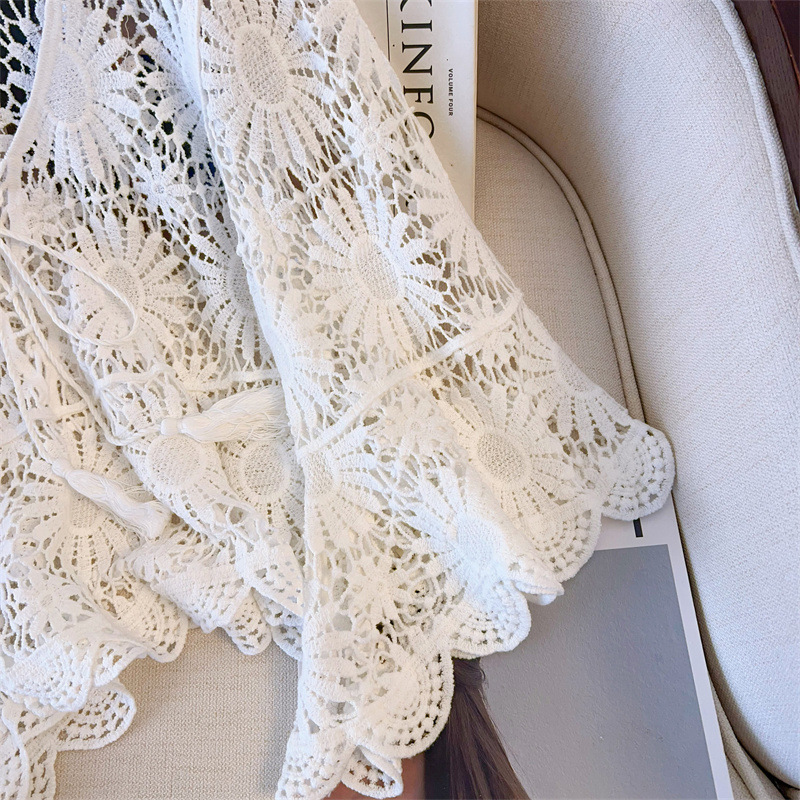 여름 트럼펫 소매 휴가 스타일 할로우 크로 셰 스웨터 여성 풀오버 레이스 업 블라우스 루즈 올 매치 선 스크린 탑스토어 가기