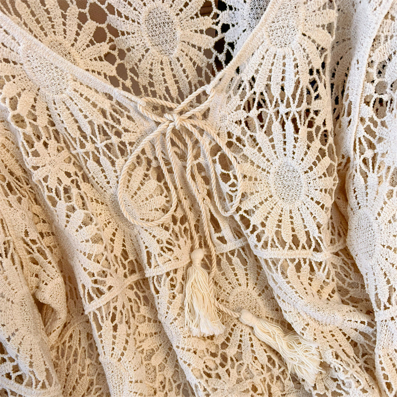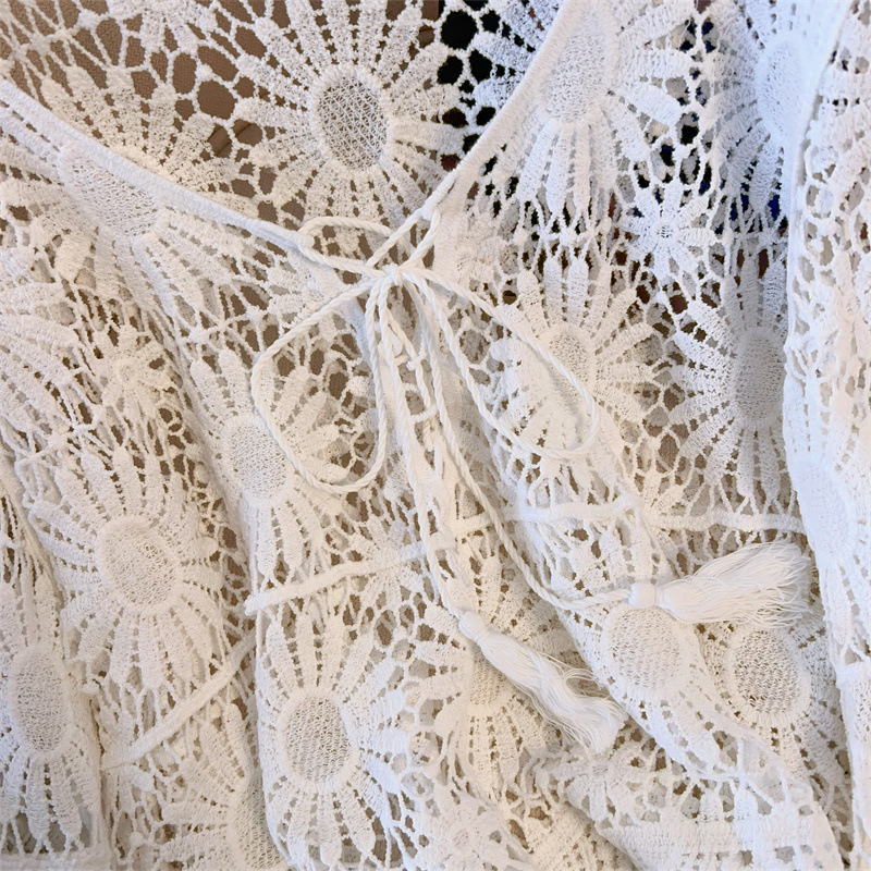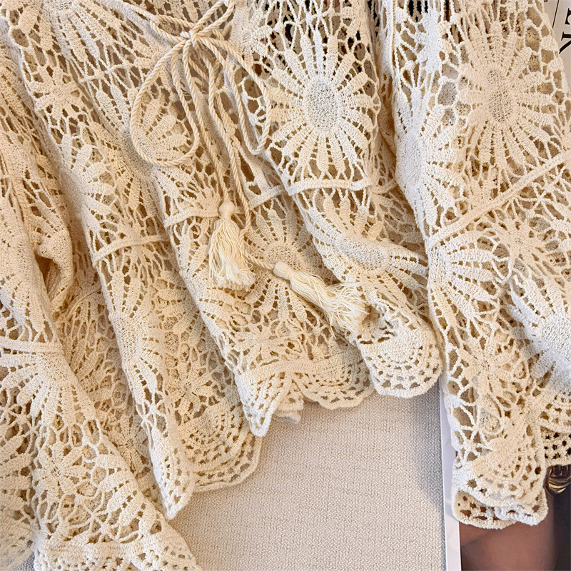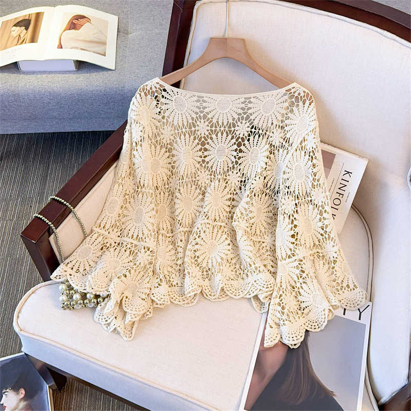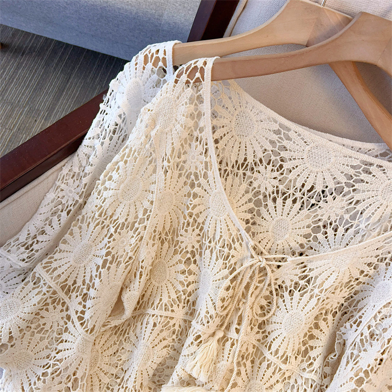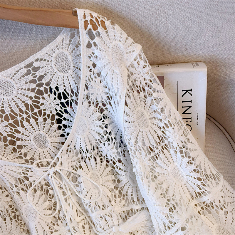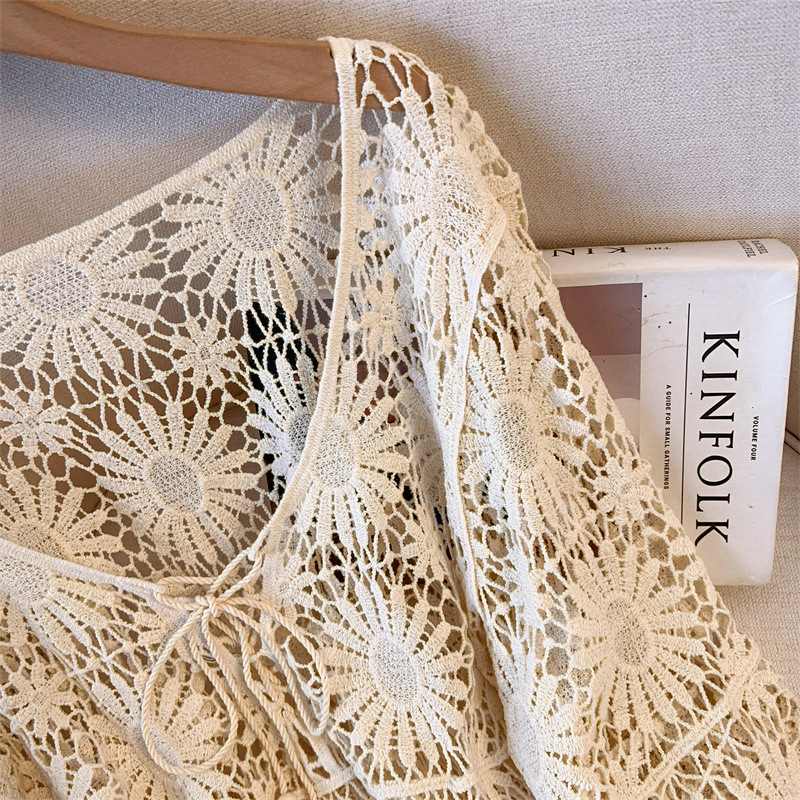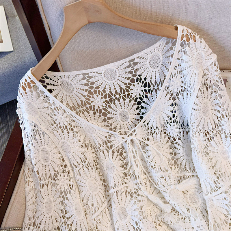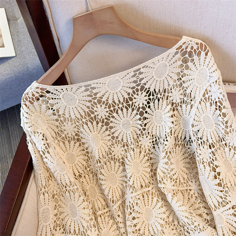 여름 트럼펫 소매 휴가 스타일 할로우 크로 셰 스웨터 여성 풀오버 레이스 업 블라우스 루즈 올 매치 선 스크린 탑스토어 가기