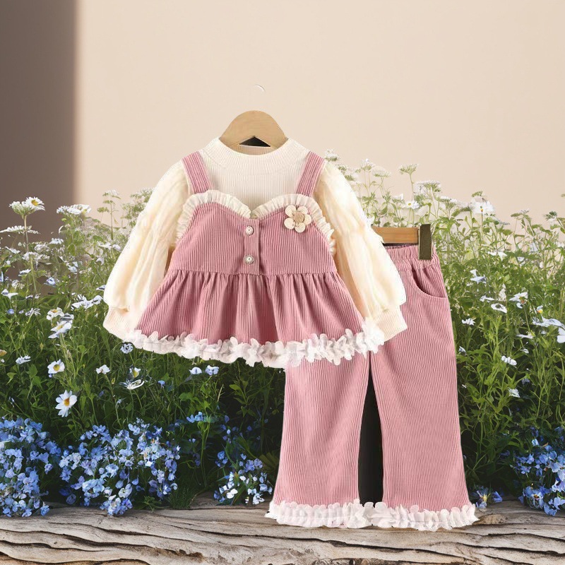소녀 2025 새로운 봄 세트 어린이 둥근 목 긴 소매 탑 스타일 레이스 바지 아기 봄과 가을 원피스스토어 가기