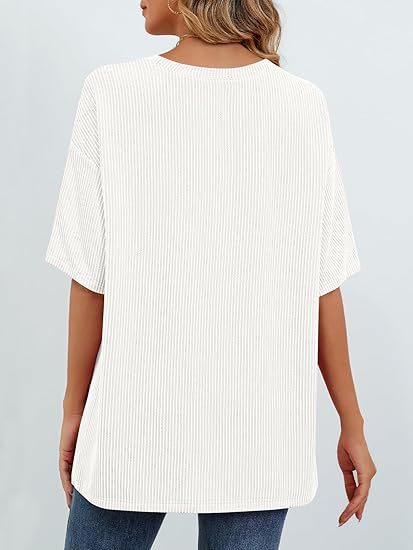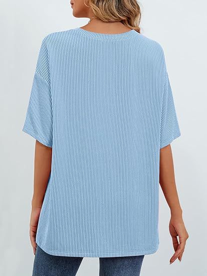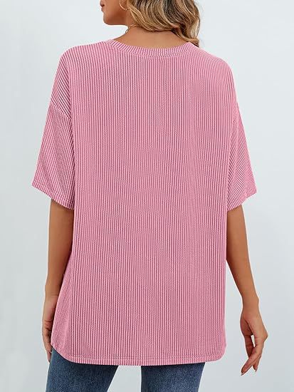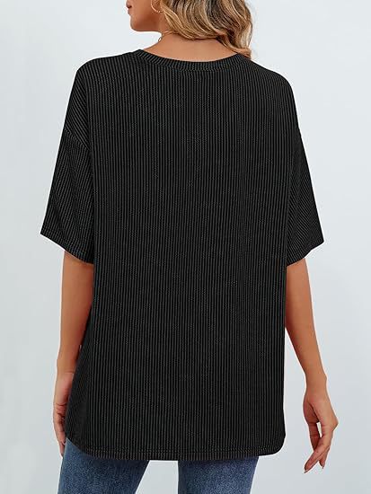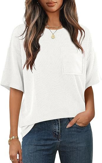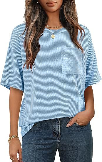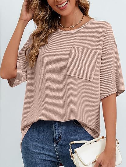 아마존 국경 유럽 및 미국 여성 여름 반팔 패치 포켓 탑 대형 라운드 넥 텍스처 캐주얼 기본 티셔츠스토어 가기