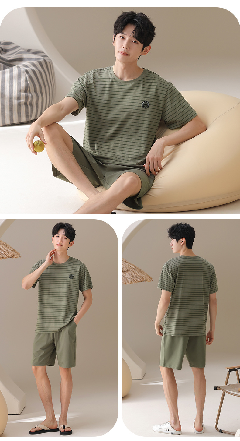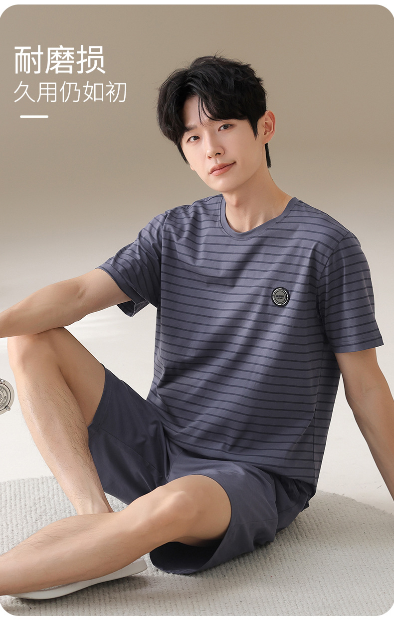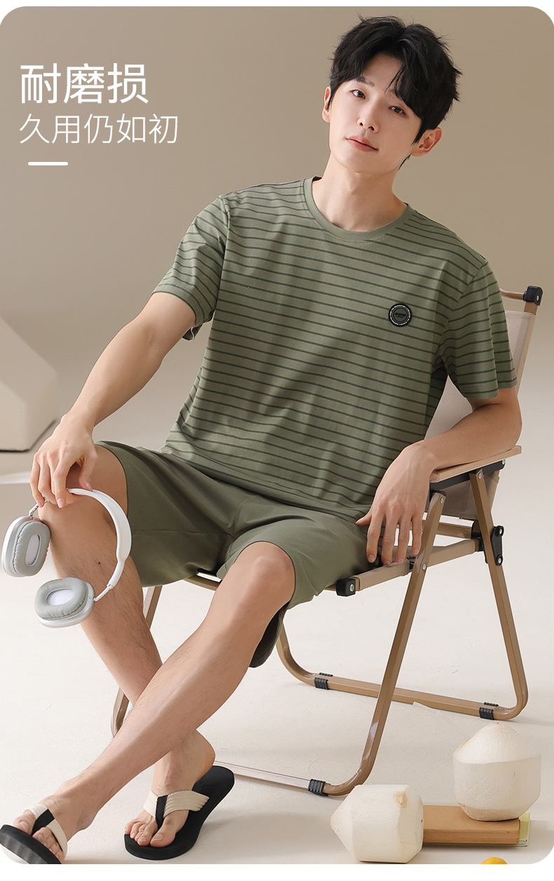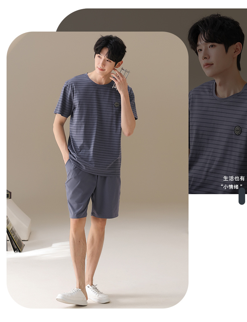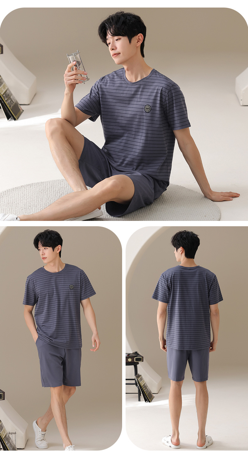 남성용 잠옷, 여름용 순면 반팔 얇은 스트라이프 슈트, 외부 착용 가능, 여름용 풀오버 홈웨어 슈트, 남성용스토어 가기