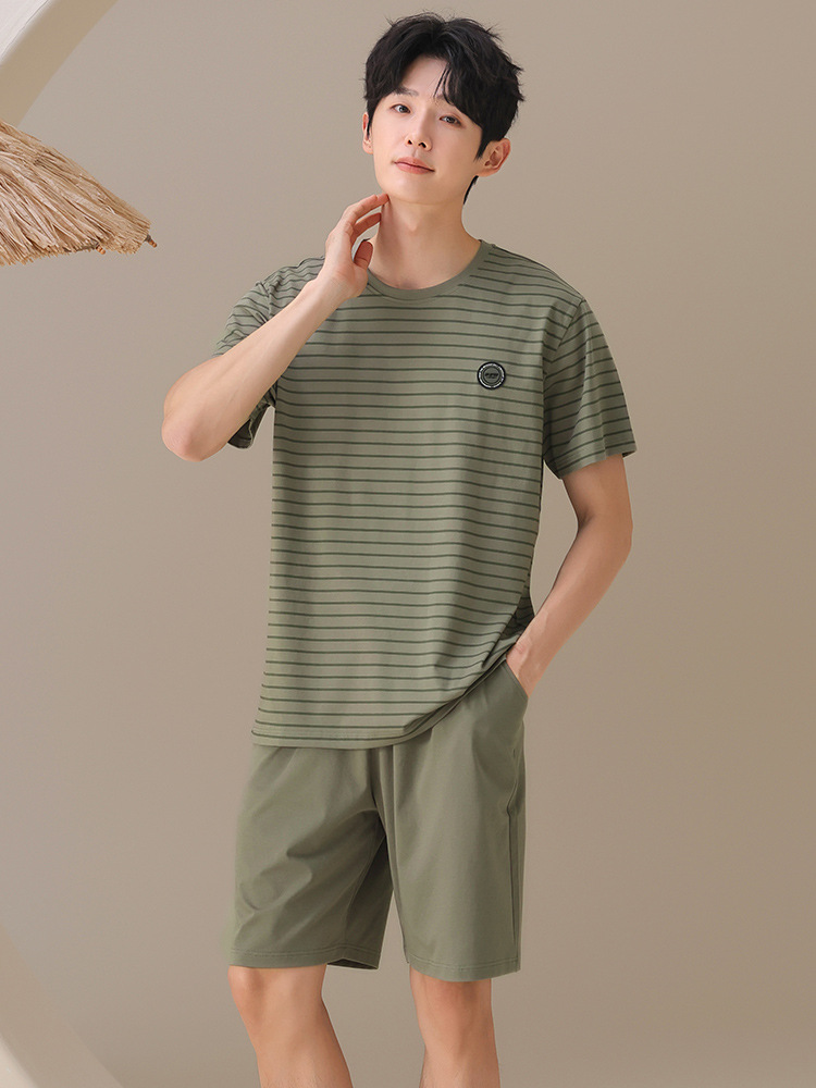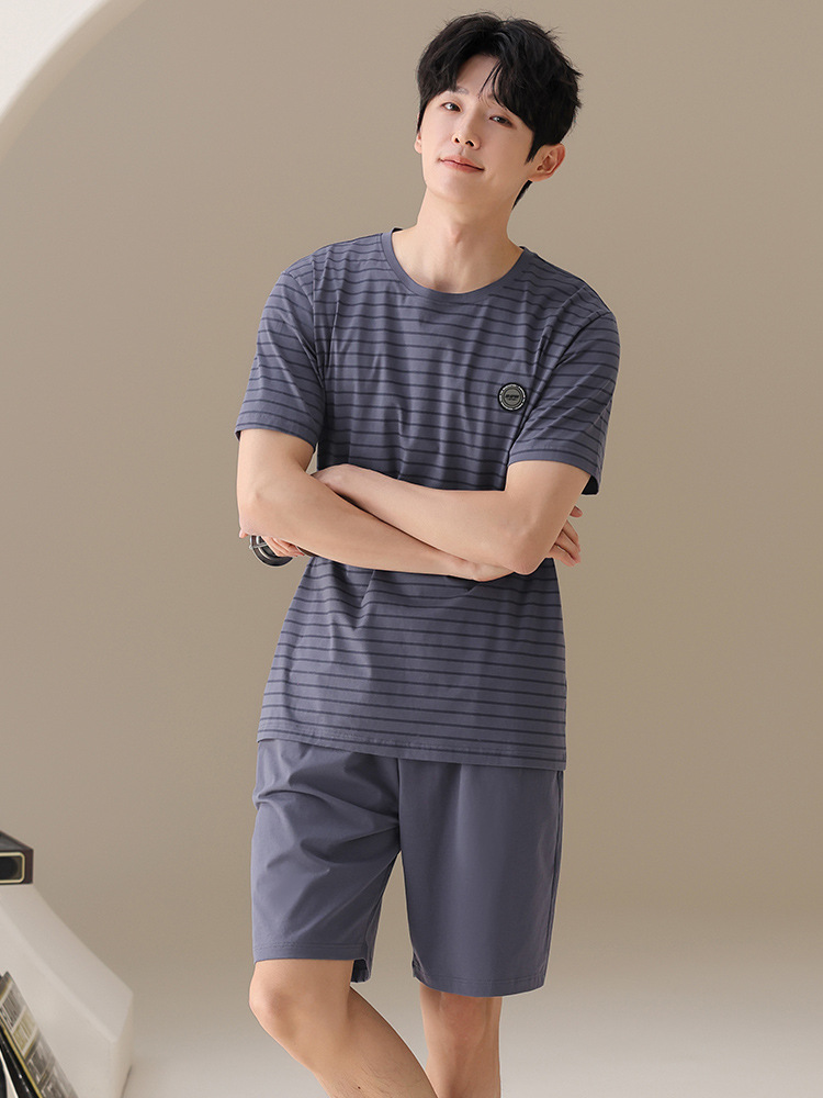 남성용 잠옷, 여름용 순면 반팔 얇은 스트라이프 슈트, 외부 착용 가능, 여름용 풀오버 홈웨어 슈트, 남성용