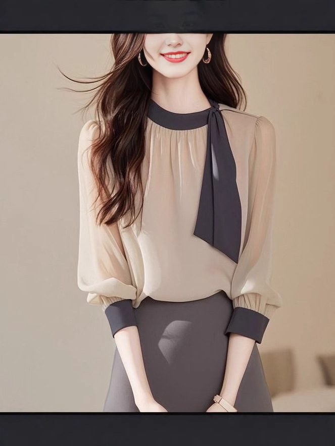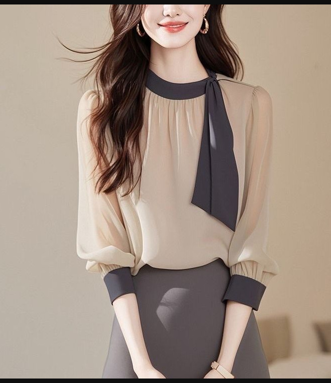 최고의 여성 단색 쉬폰 셔츠 디자인 틈새 크루 넥 셔츠 긴 소매 여성용 셔츠스토어 가기