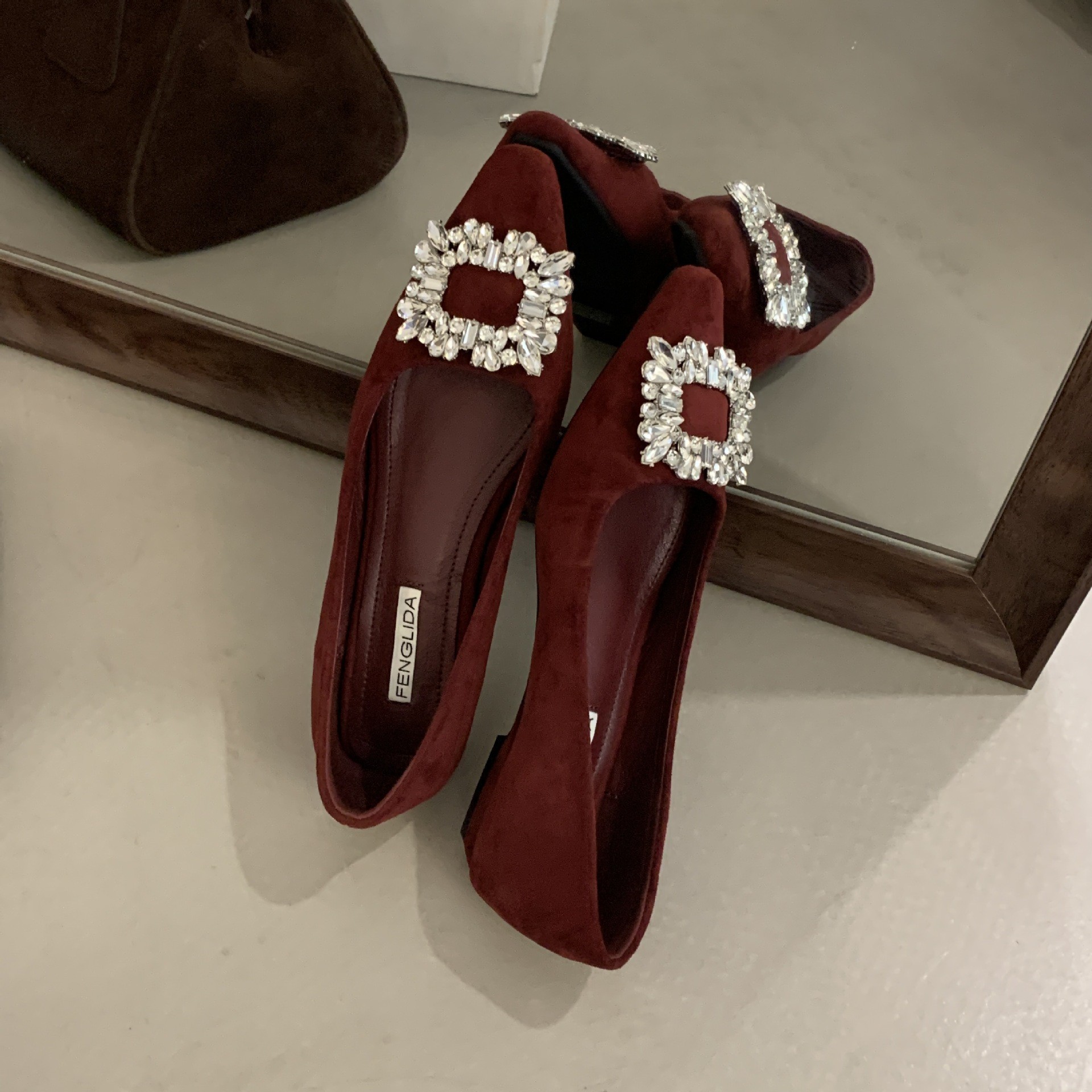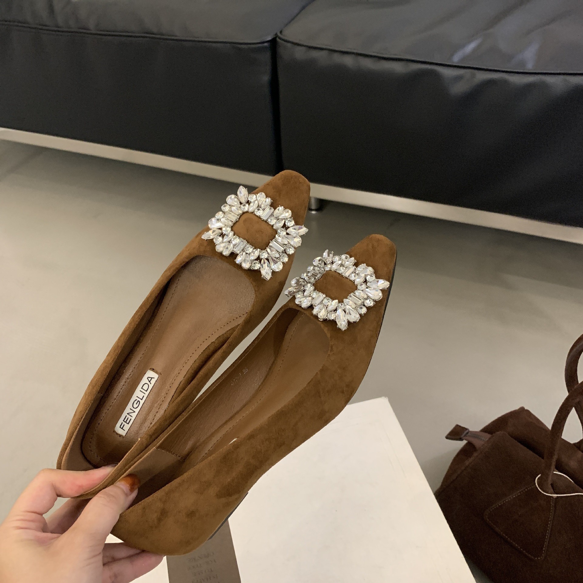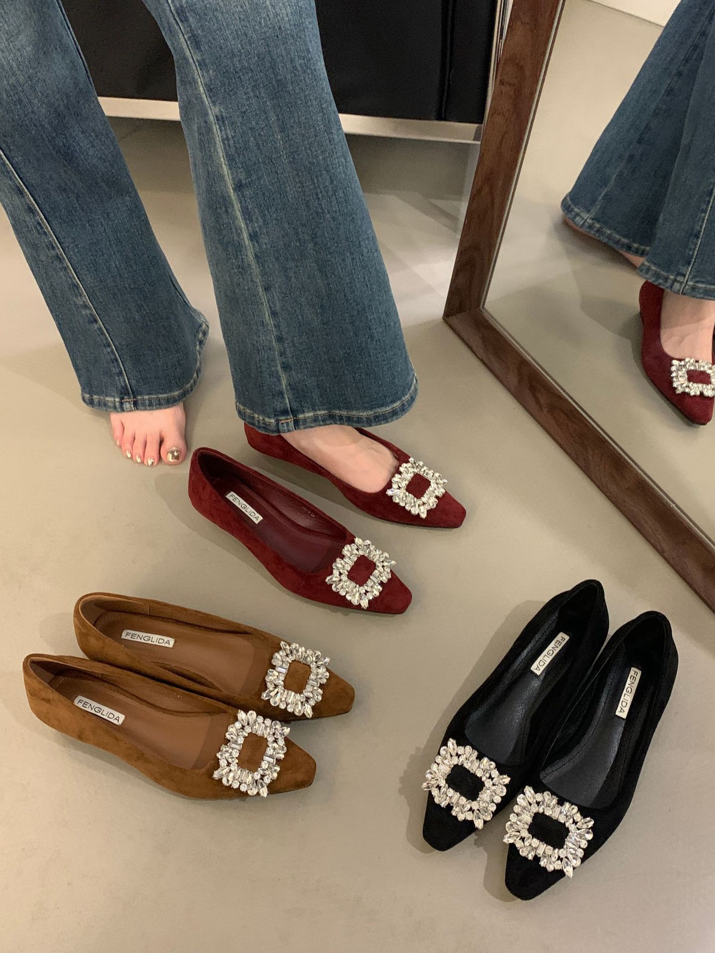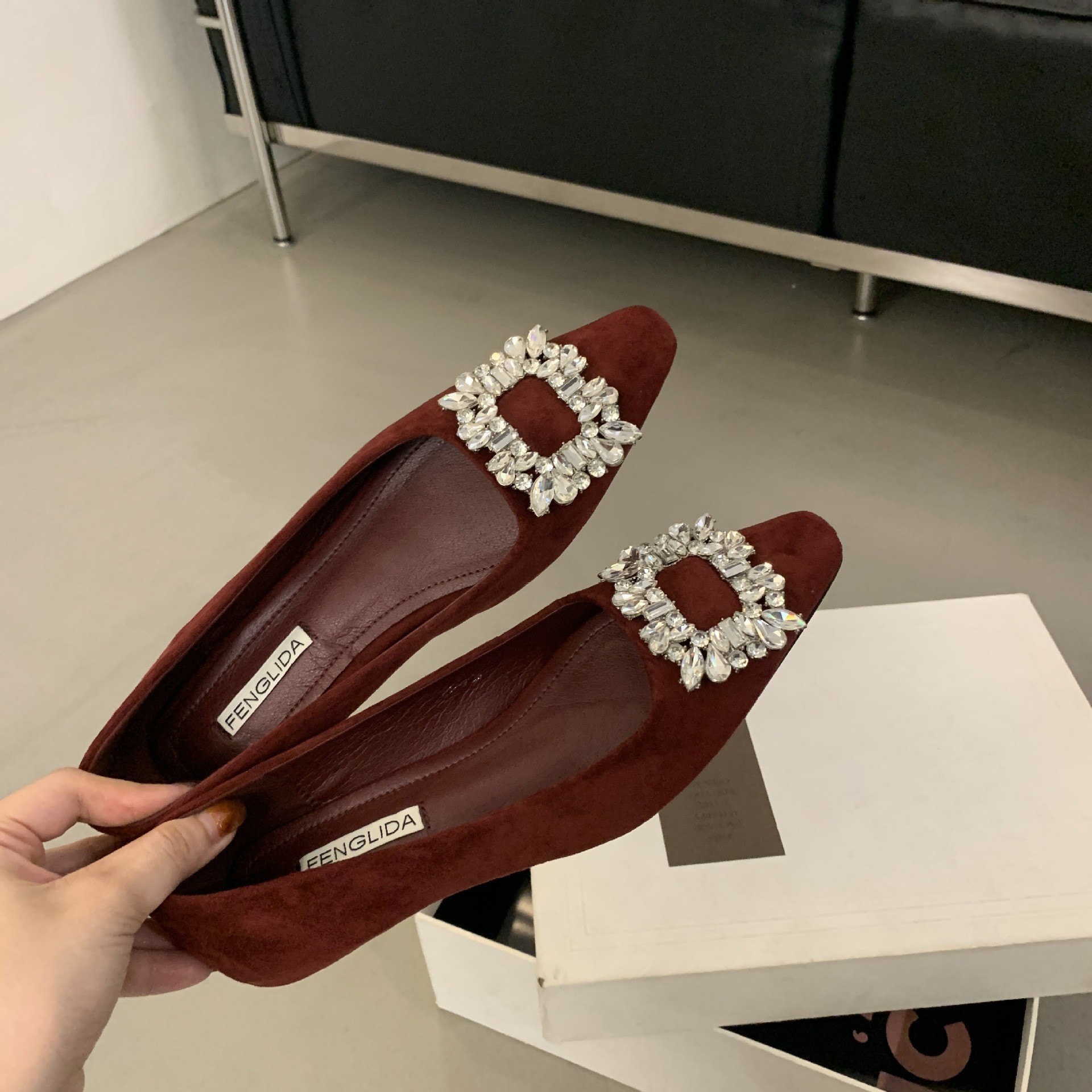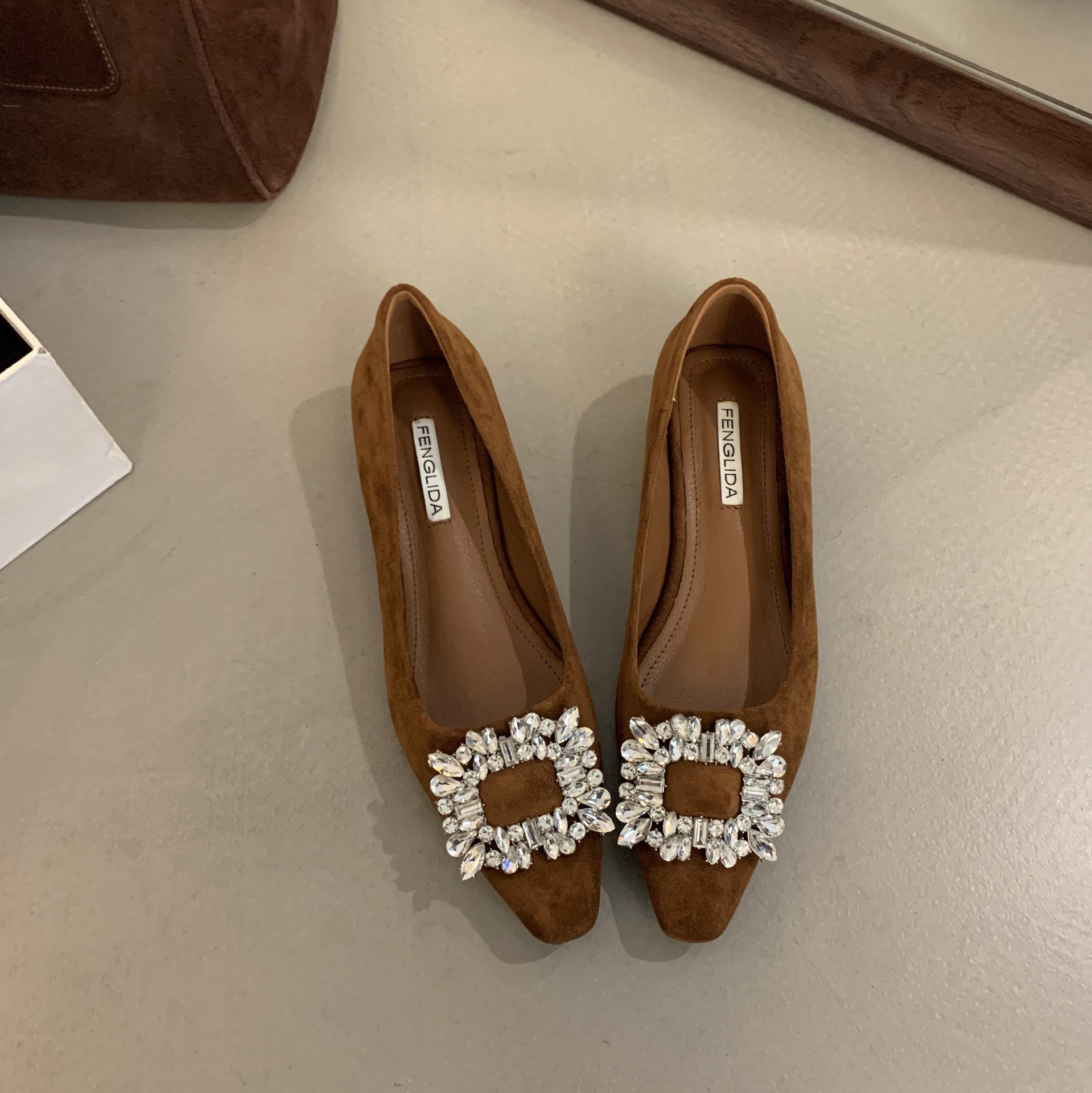 프랑스 뾰족한 발가락 통근 신발 여성의 2024 년 새 가을 얕은 입 올 매치 라인스톤 스퀘어 버클 우아한 플랫 레이디 슈즈스토어 가기