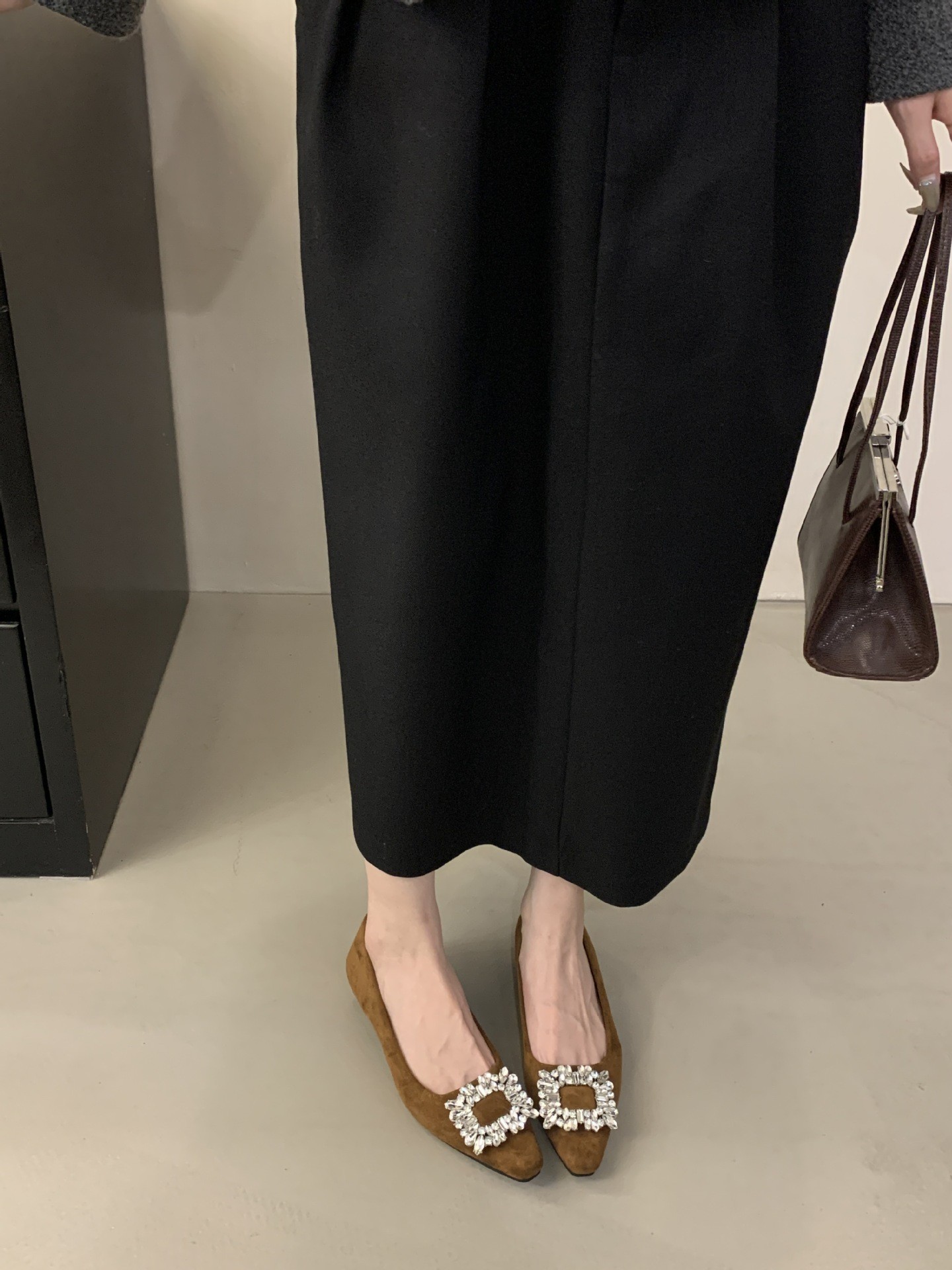 프랑스 뾰족한 발가락 통근 신발 여성의 2024 년 새 가을 얕은 입 올 매치 라인스톤 스퀘어 버클 우아한 플랫 레이디 슈즈