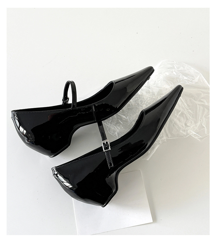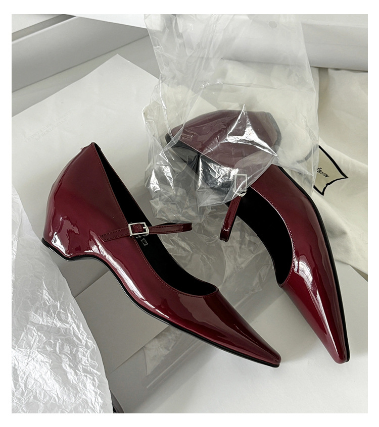 양가죽 버전 프랑스 스타일 한 캐릭터 버클 벨트 두꺼운 힐 높이 증가 메리 제인 여성 신발 뾰족한 발가락 싱글 레이어 신발 얕은 입 통근 하이힐