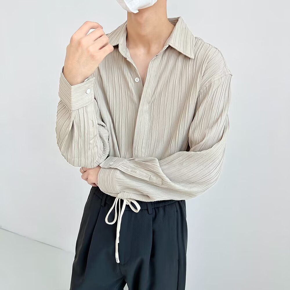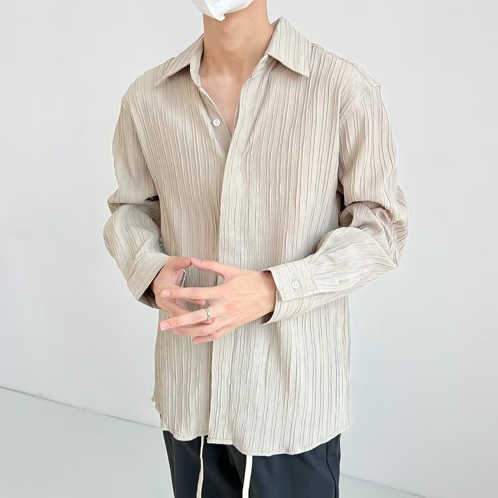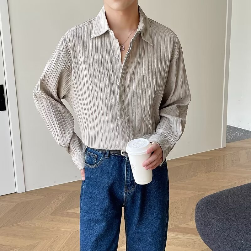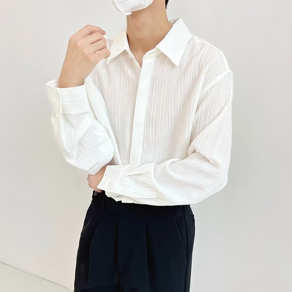 한국 스타일 다크 버튼 스트라이프 긴팔 질감 셔츠 여름 남성 청소년 한국 스타일 인기있는 핫 룩 솔리드 컬러 다림질 셔츠