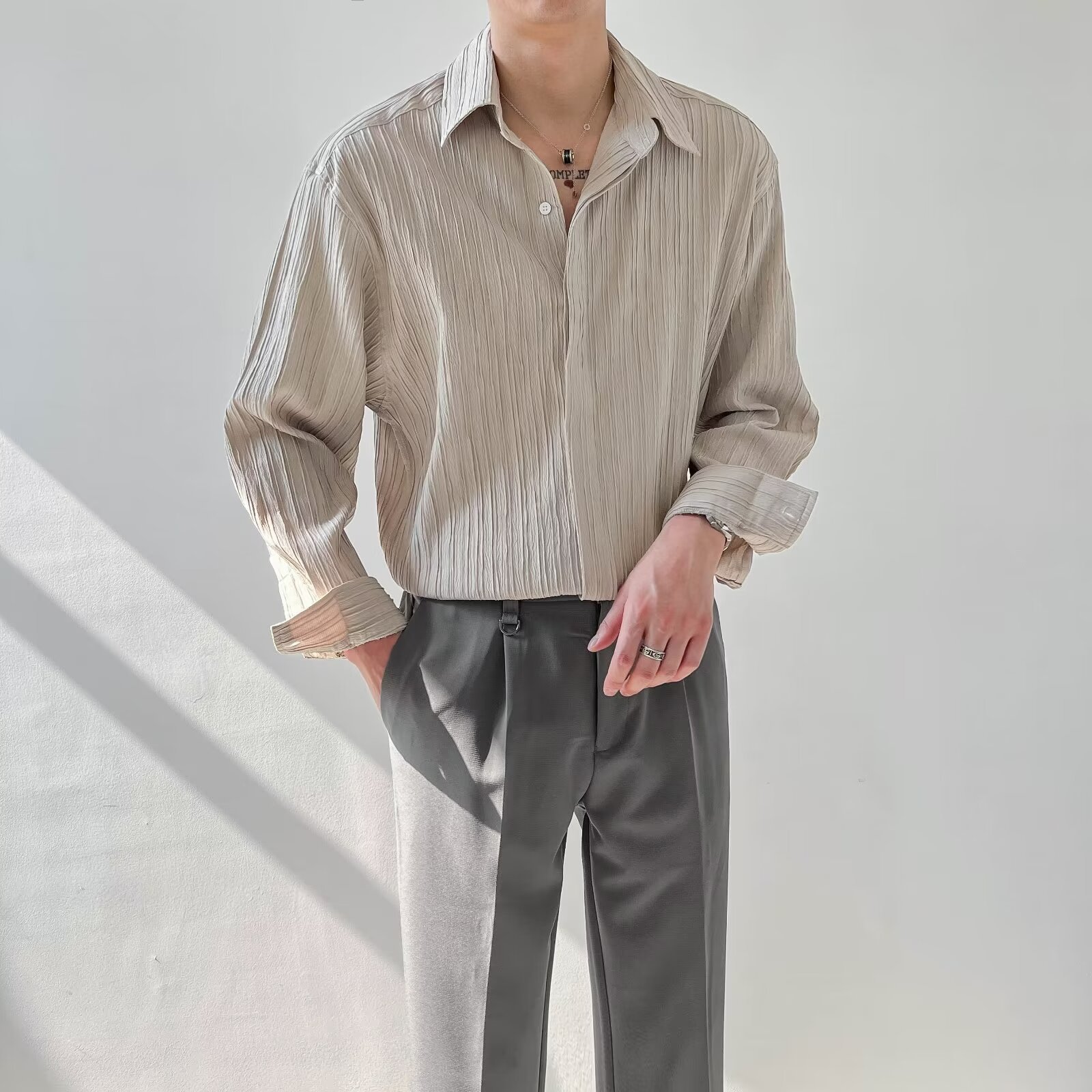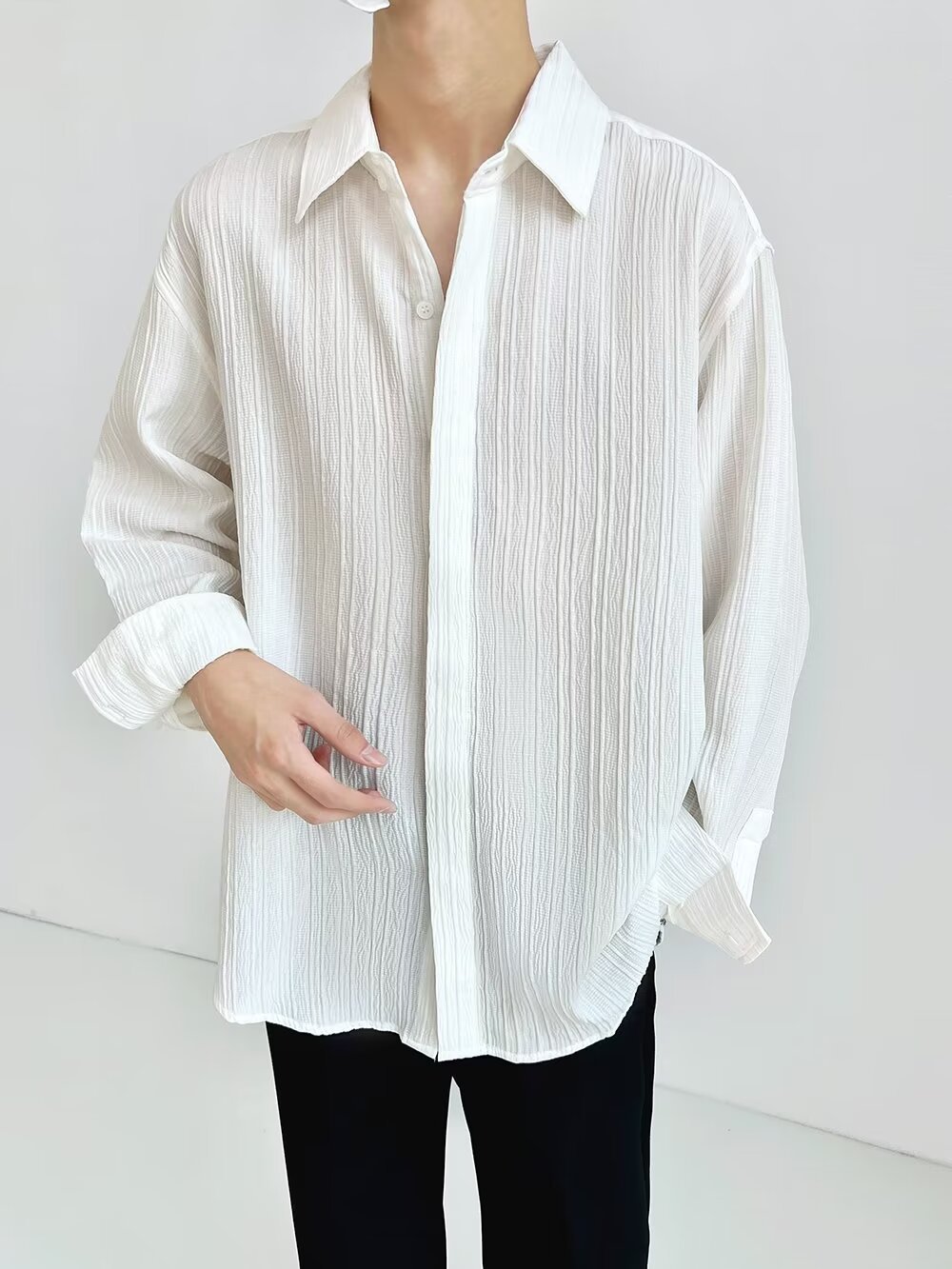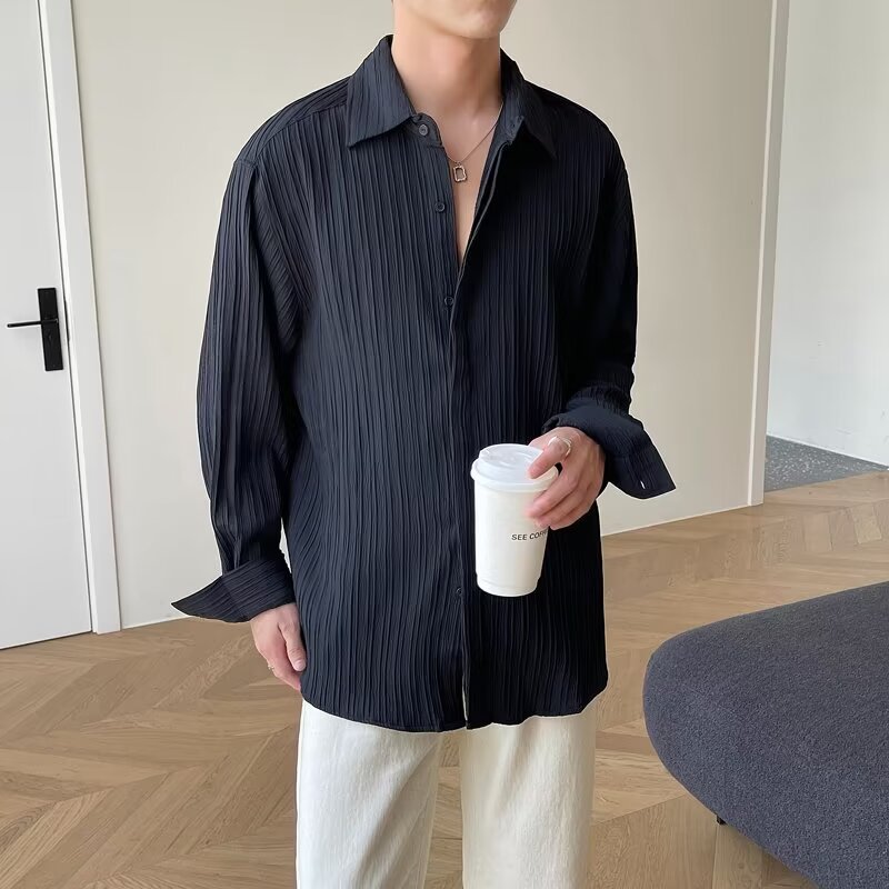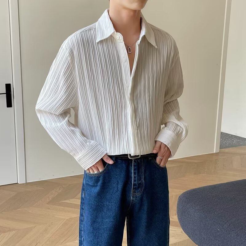 한국 스타일 다크 버튼 스트라이프 긴팔 질감 셔츠 여름 남성 청소년 한국 스타일 인기있는 핫 룩 솔리드 컬러 다림질 셔츠