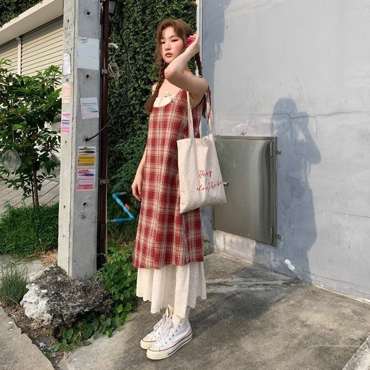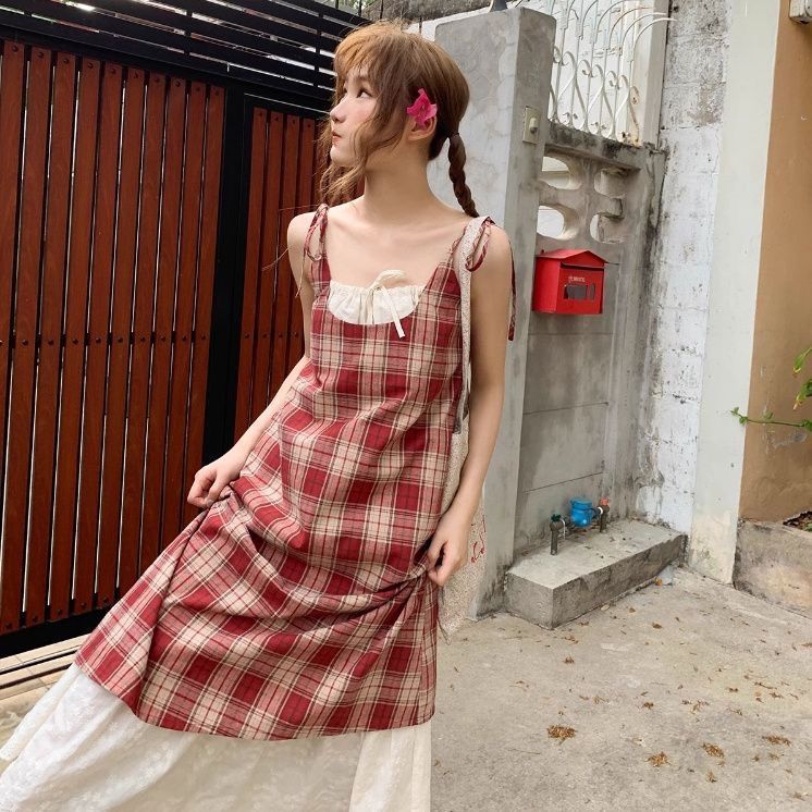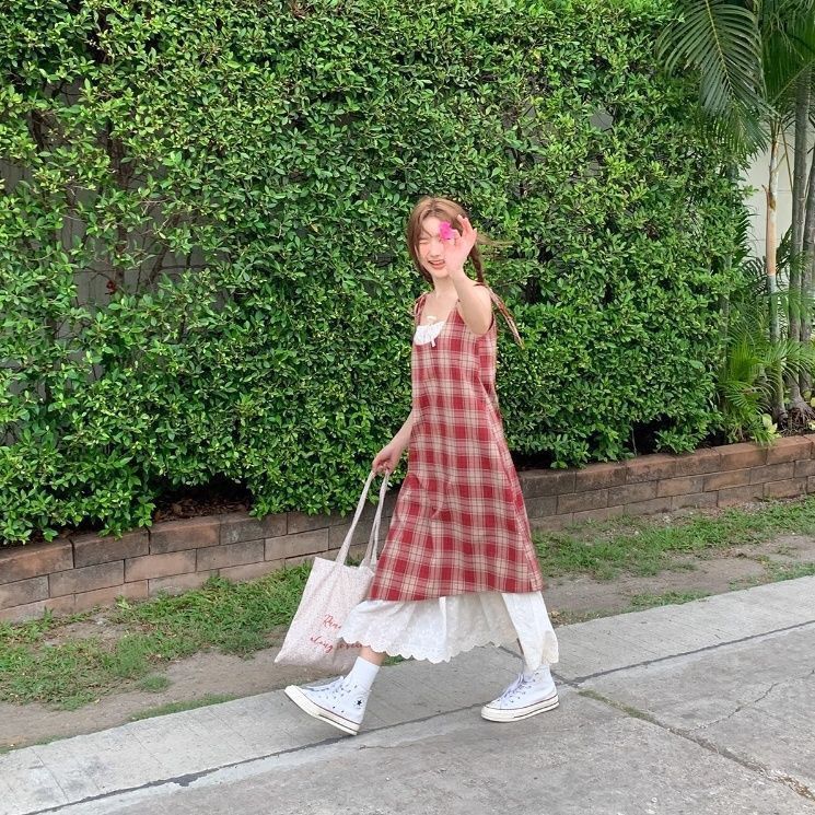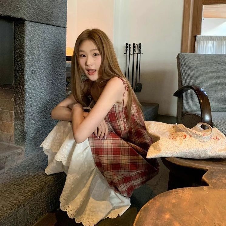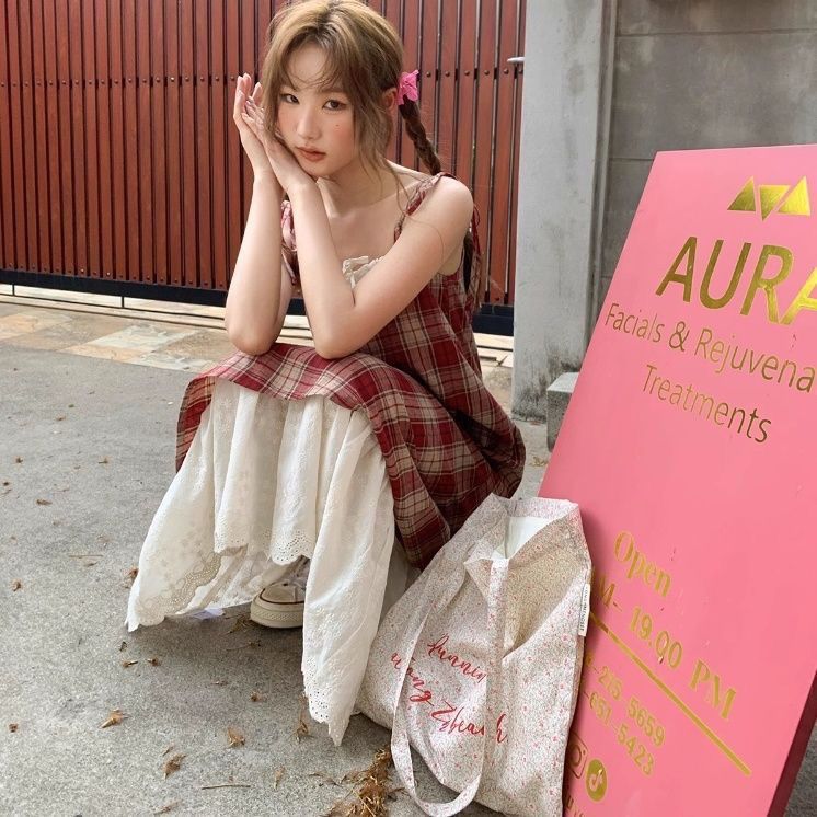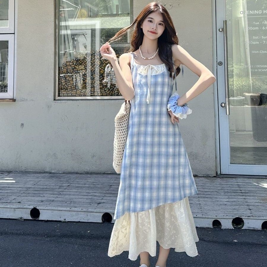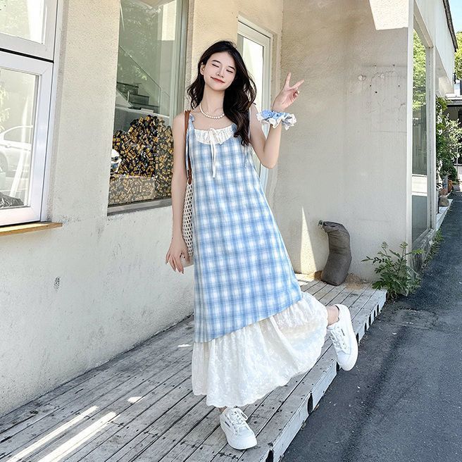 여성을위한 레이스 스티치 격자 무늬 서스펜더 스커트 드레스 여름 새로운 스타일 신선하고 느슨한 슬리밍 가짜 투피스 스커트스토어 가기