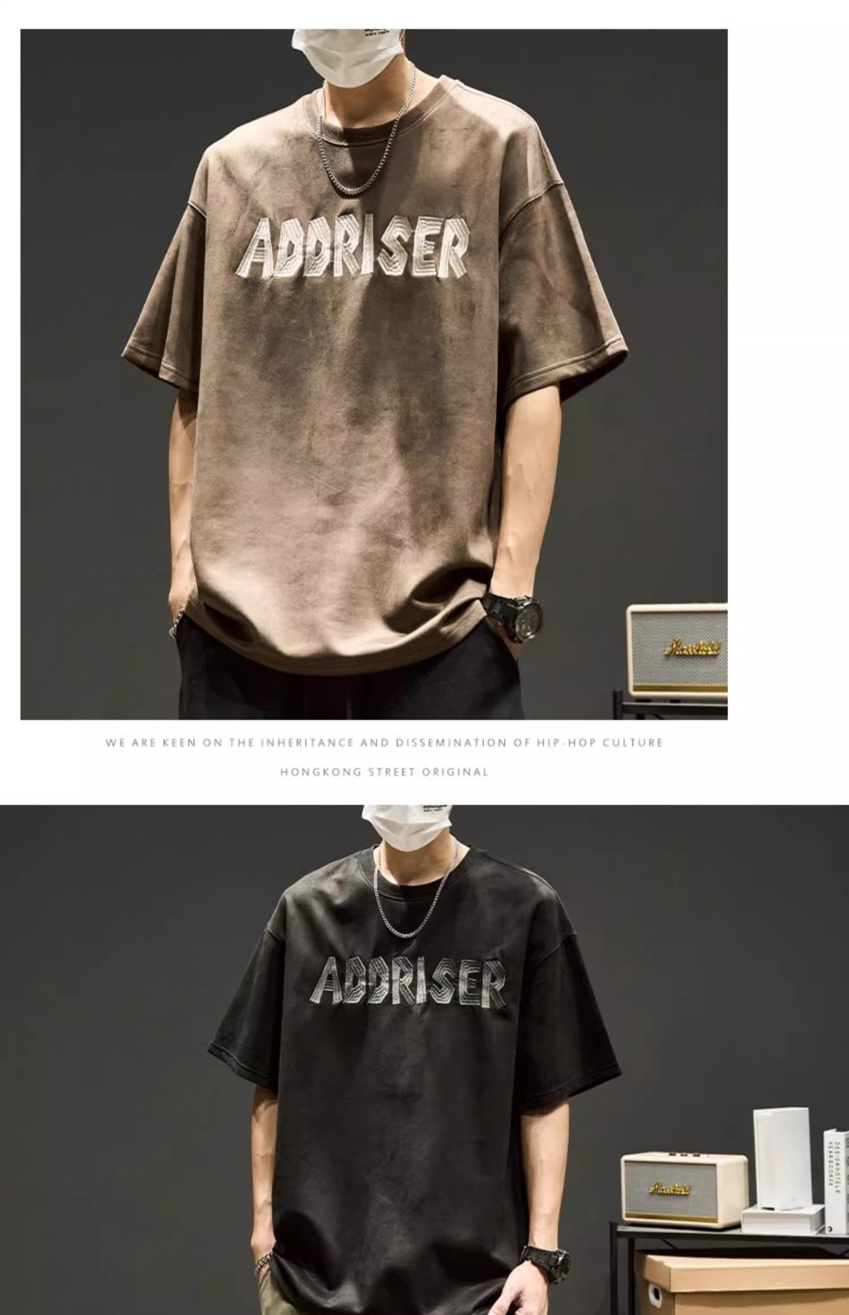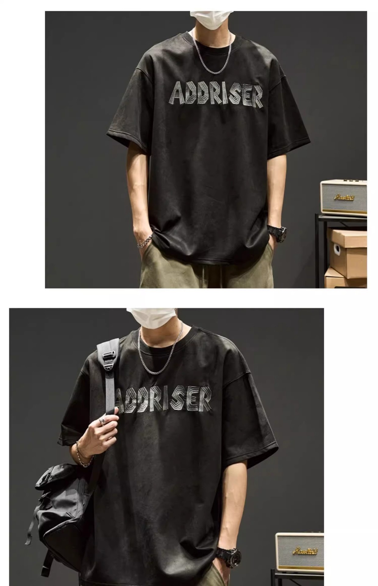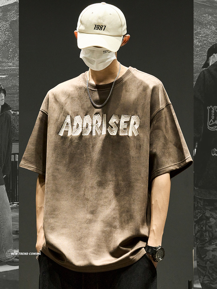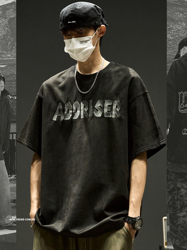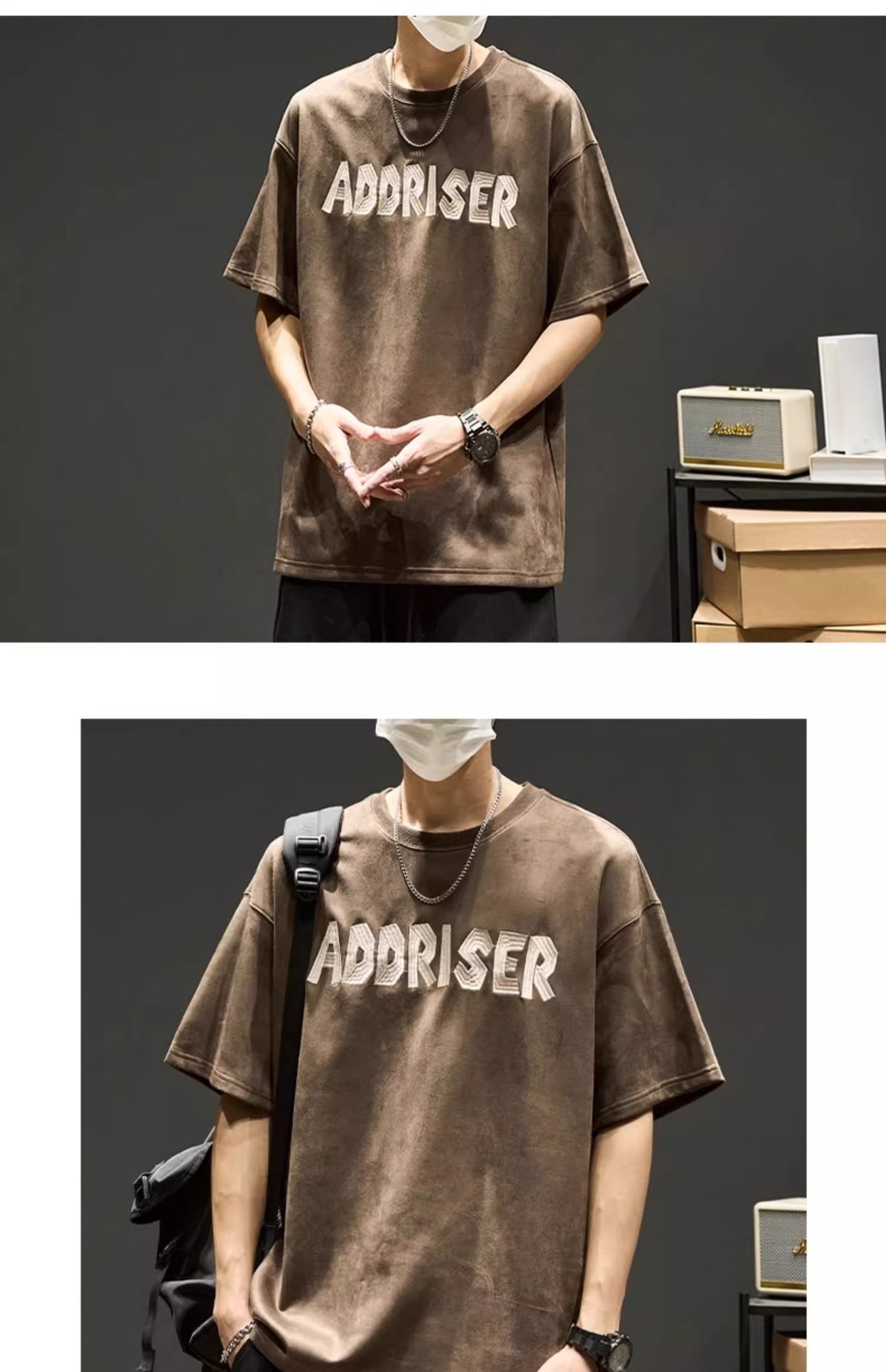 티셔츠 남자 여름 미국 스타일 하이 스트리트 트렌디 브랜드 자수 편지 크루 넥 탑 남자 2025 뉴 스웨이드 쇼트 슬리브 탑스토어 가기