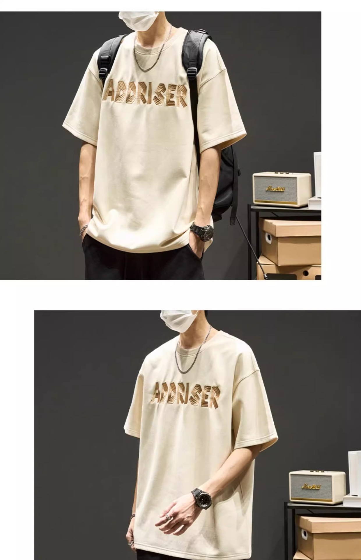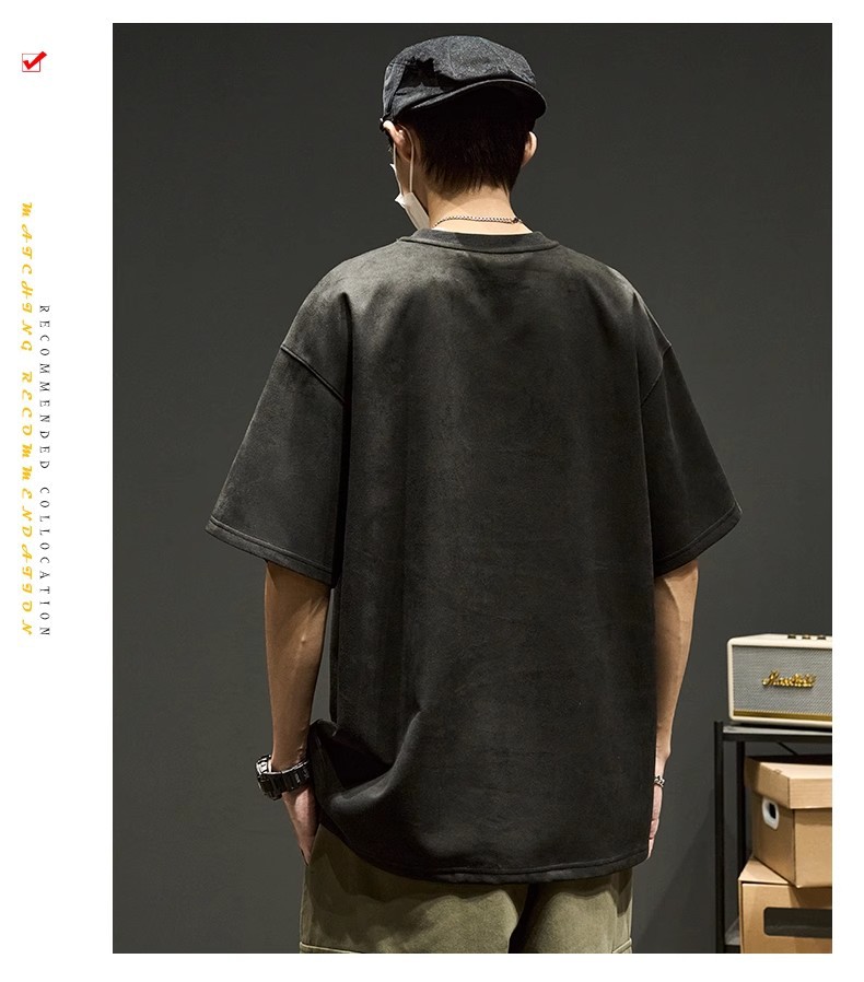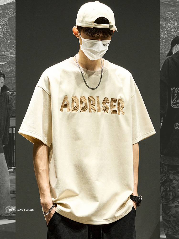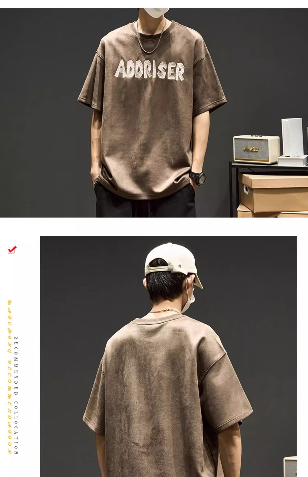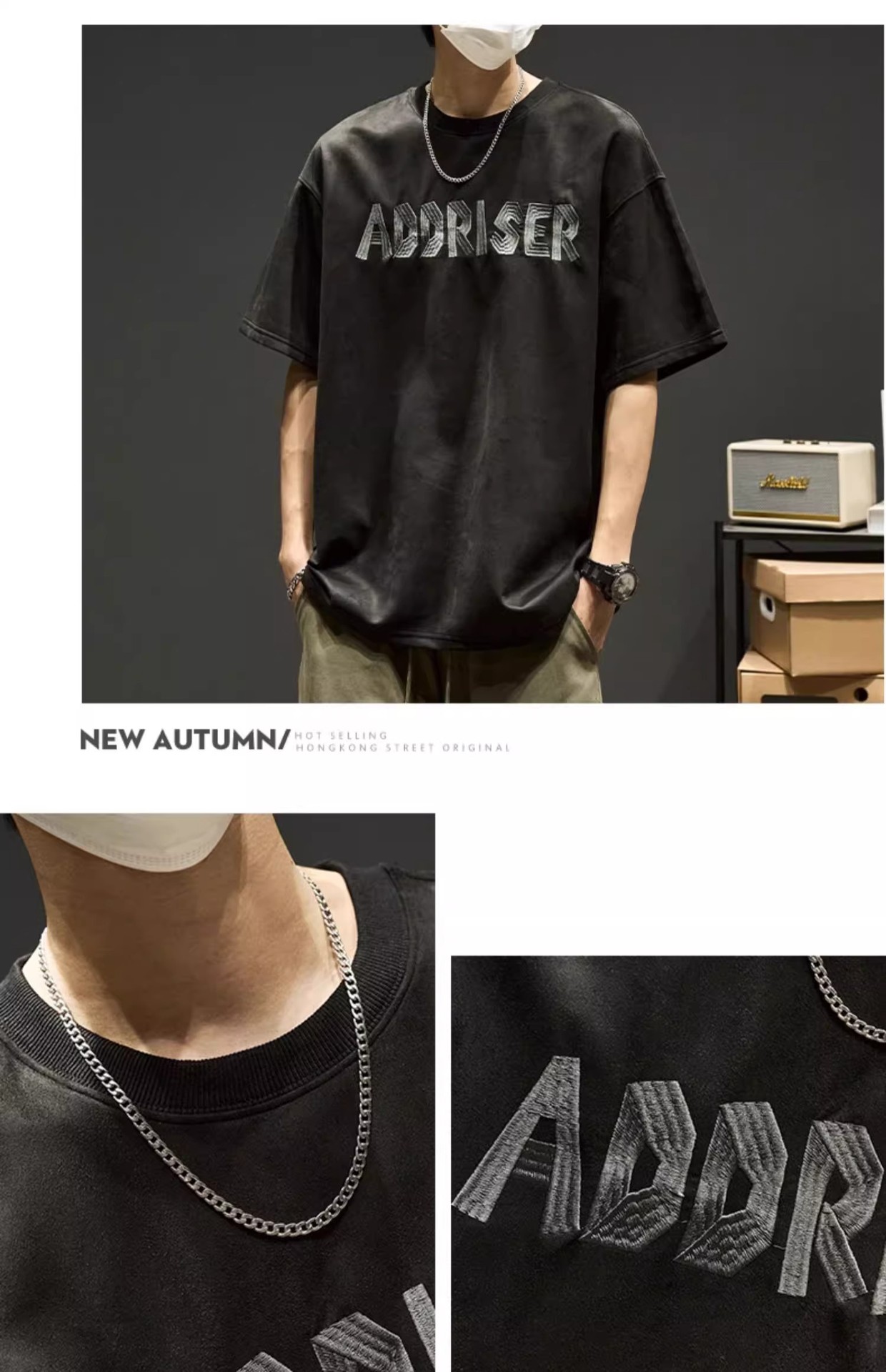 티셔츠 남자 여름 미국 스타일 하이 스트리트 트렌디 브랜드 자수 편지 크루 넥 탑 남자 2025 뉴 스웨이드 쇼트 슬리브 탑스토어 가기