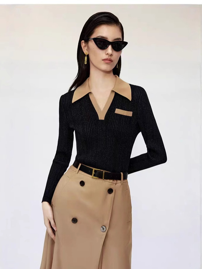 콘트라스트 칼라 니트 셔츠 여성용 봄과 가을 새로운 레트로 우아한 내부 얇은 슬림 핏 소프트 왁스 긴팔 베이스 셔츠