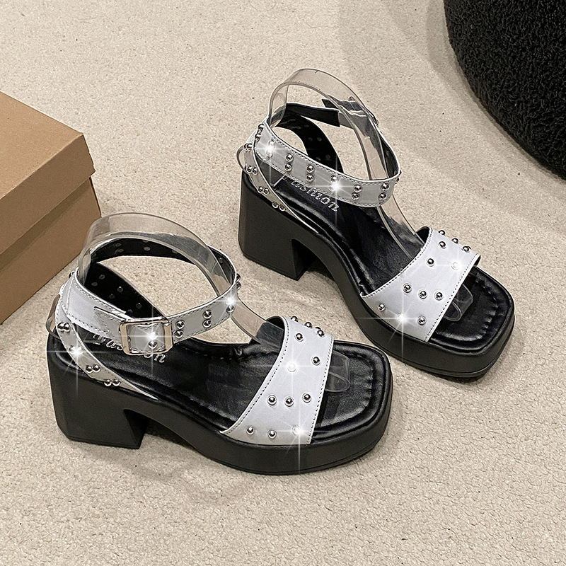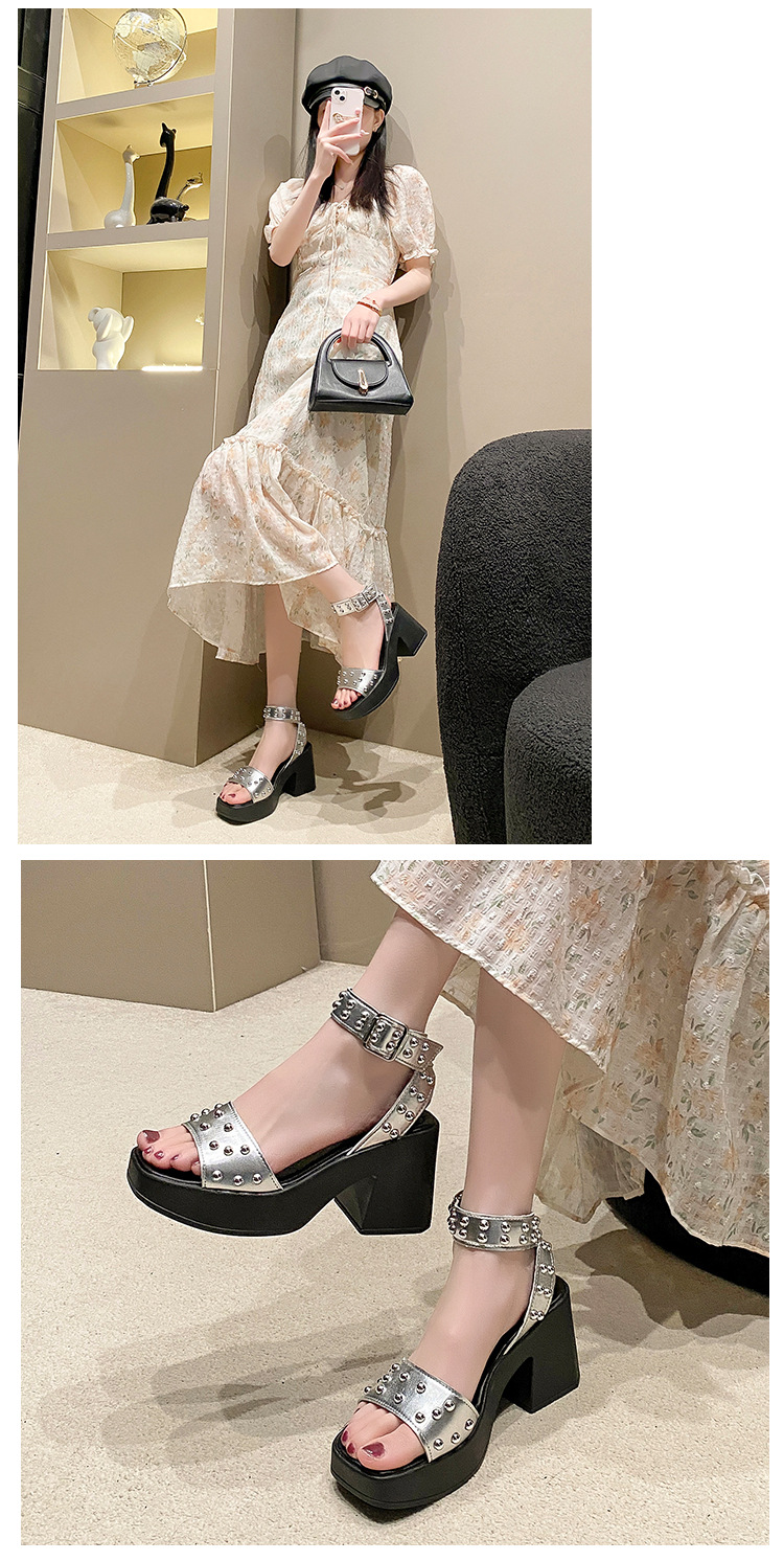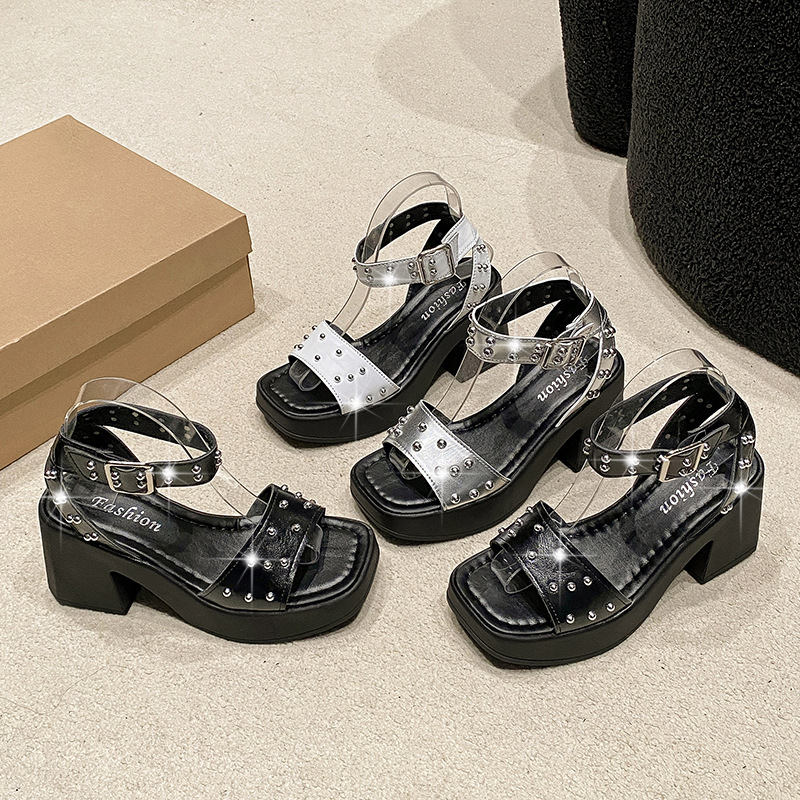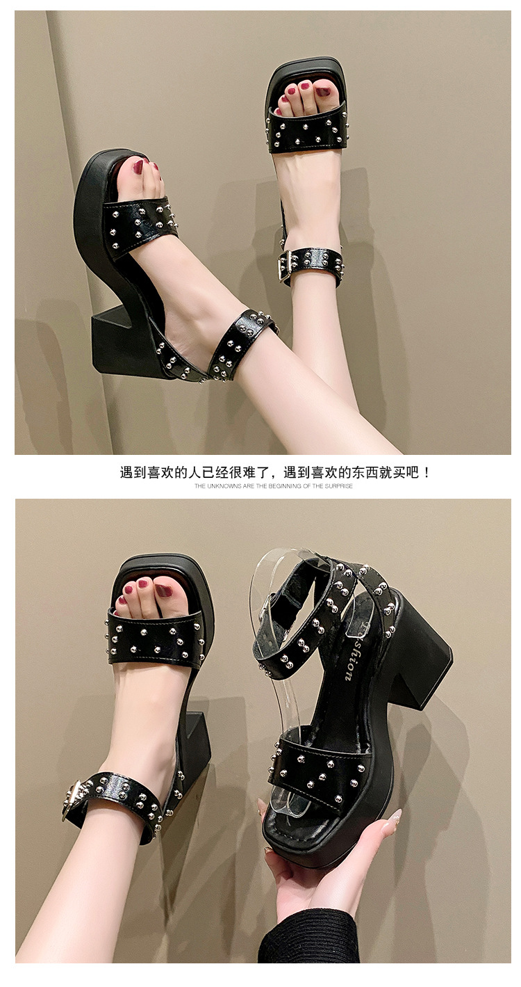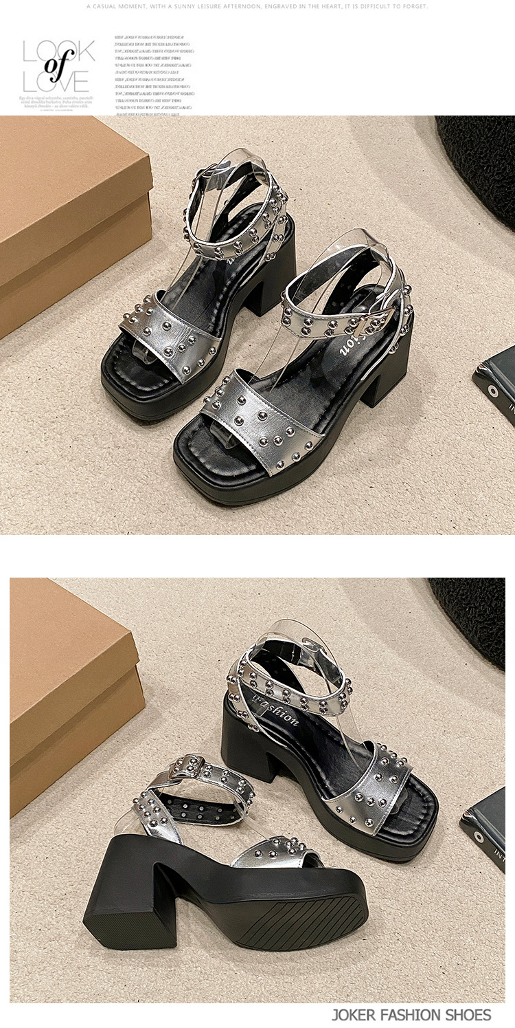2025년 여름 신상 여성용 리벳 하이힐 샌들, 두꺼운 굽, 버클 오픈토 패션 샌들스토어 가기
