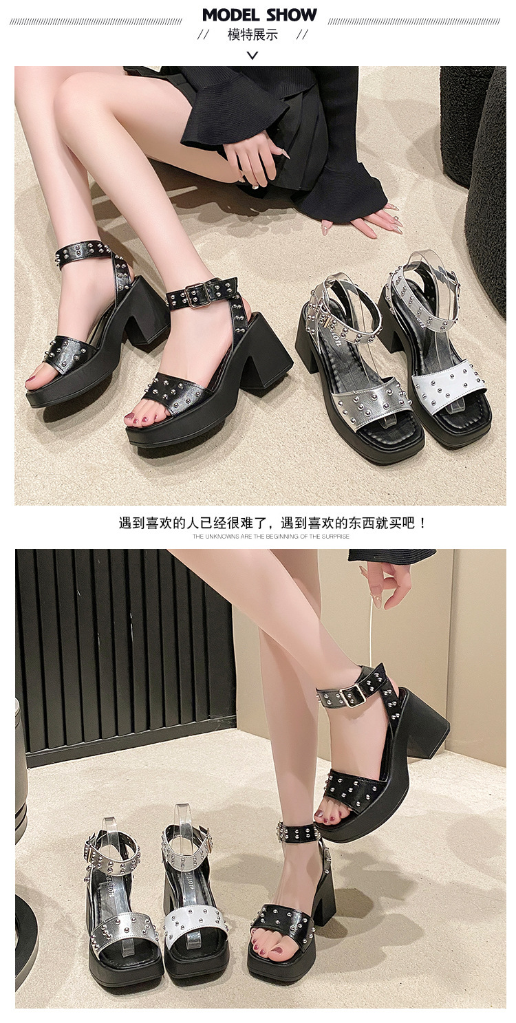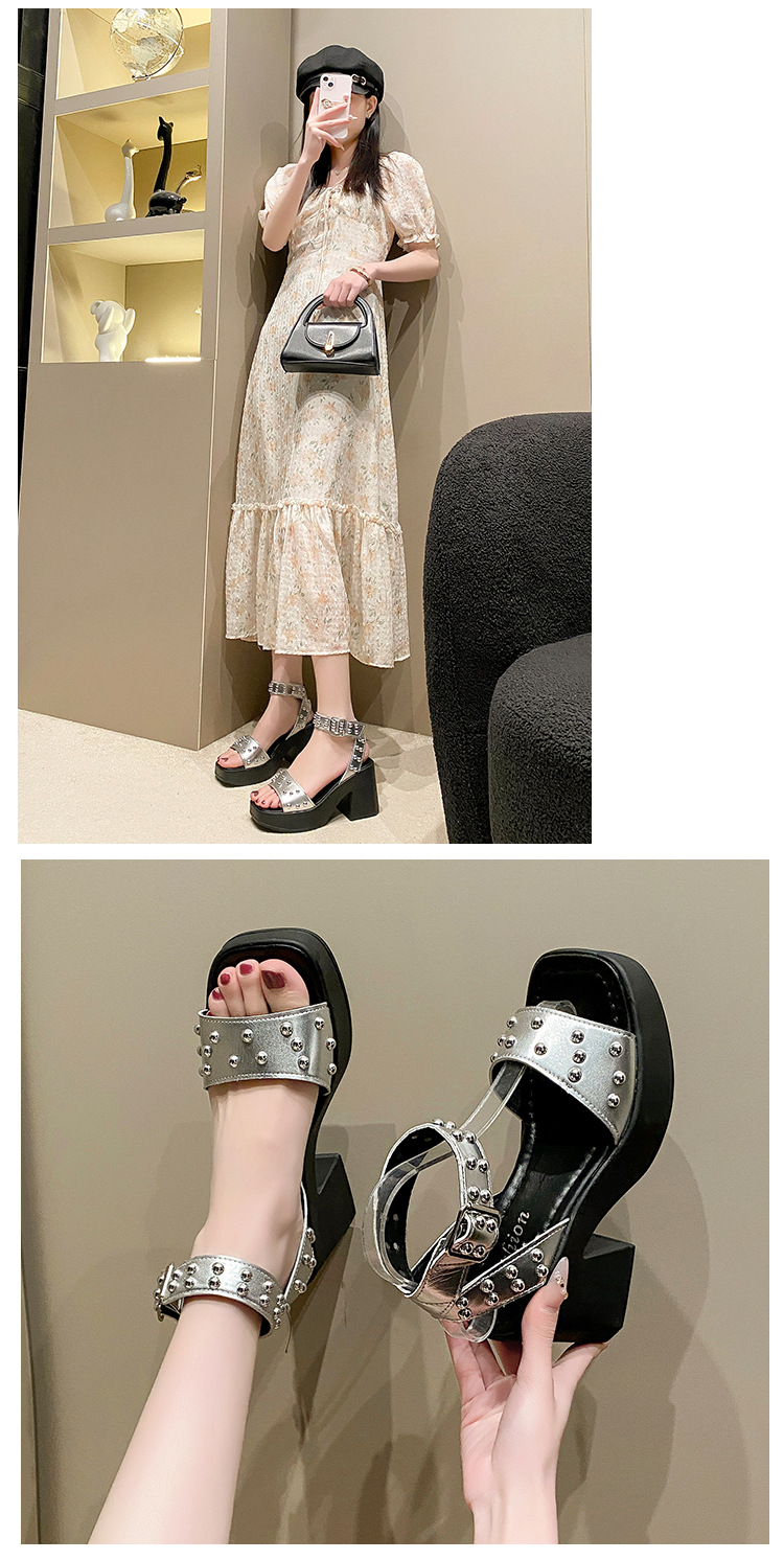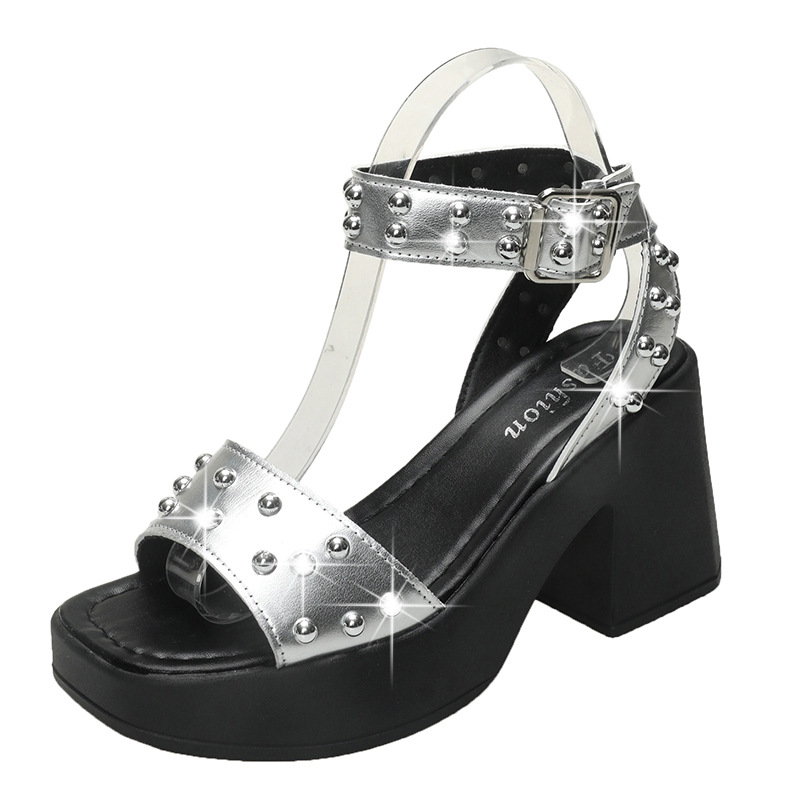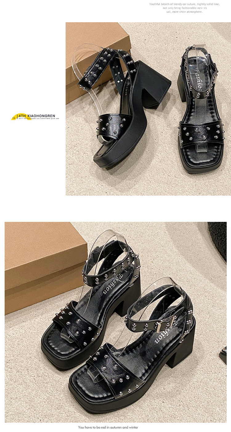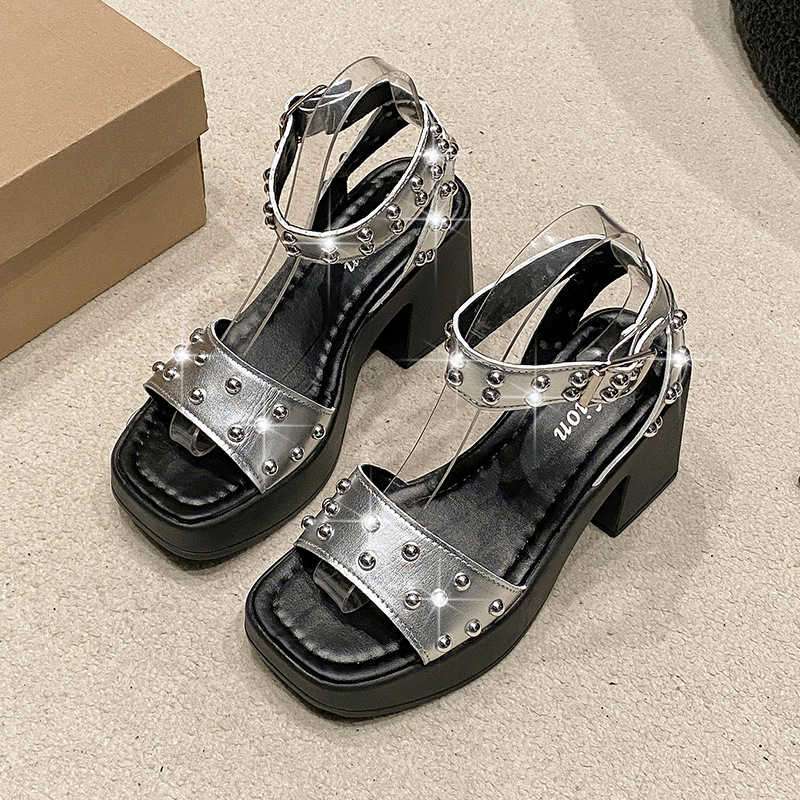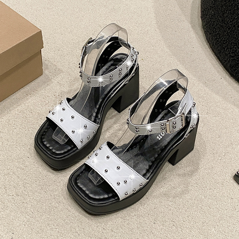 2025년 여름 신상 여성용 리벳 하이힐 샌들, 두꺼운 굽, 버클 오픈토 패션 샌들스토어 가기