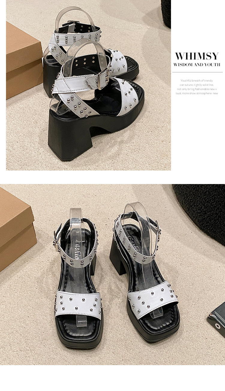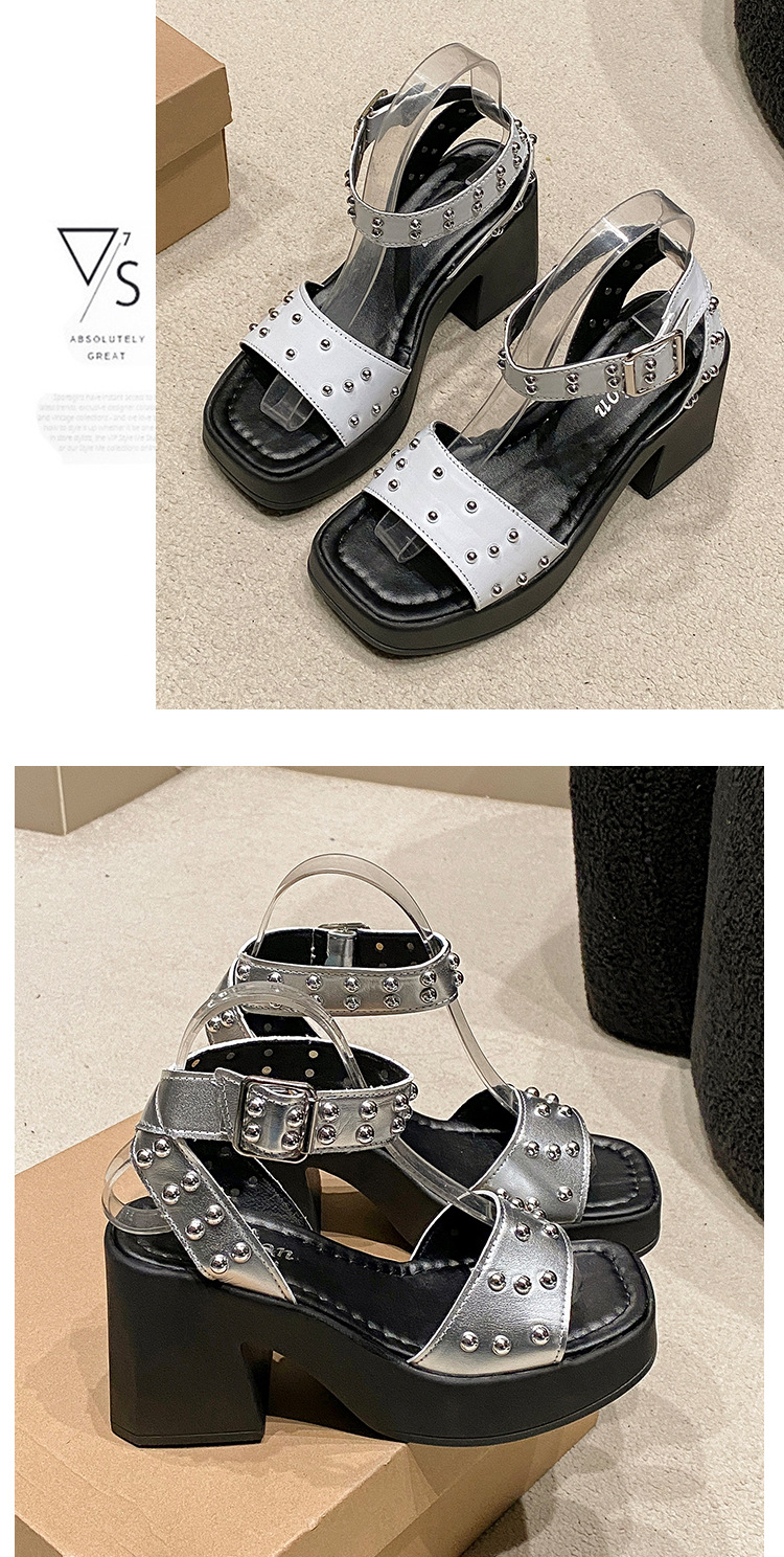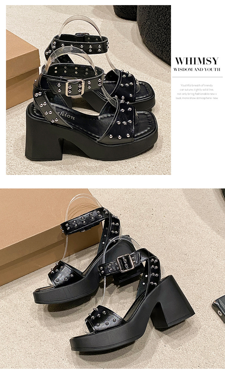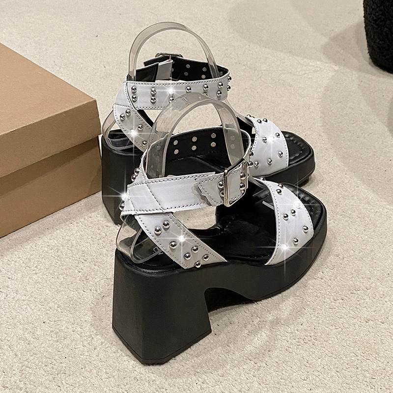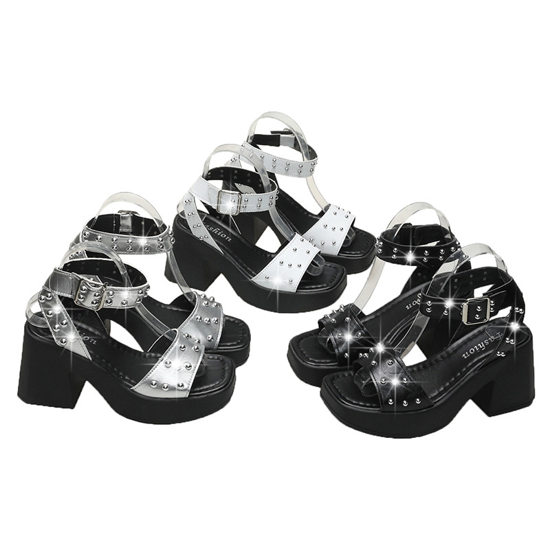 2025년 여름 신상 여성용 리벳 하이힐 샌들, 두꺼운 굽, 버클 오픈토 패션 샌들스토어 가기