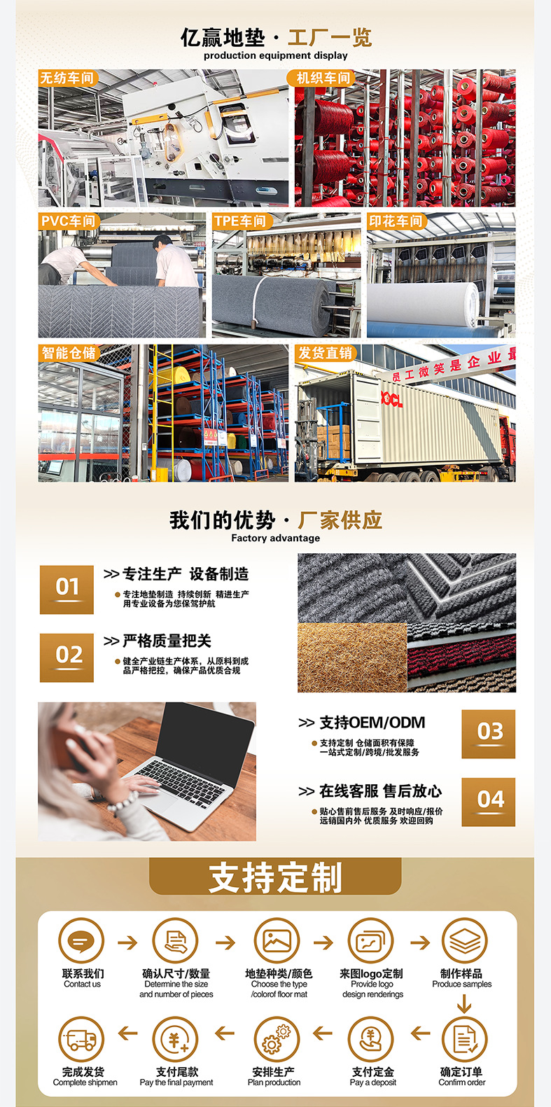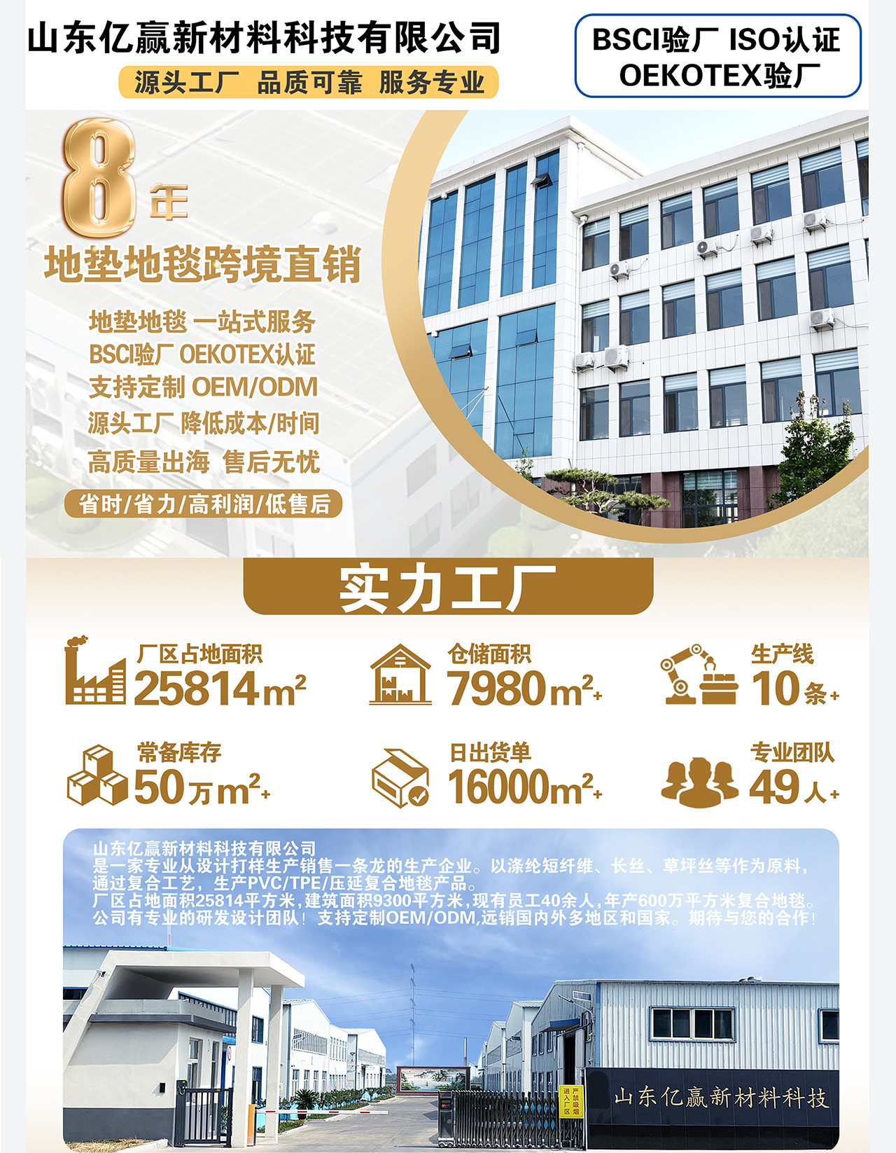 山东亿赢新材料科技有限公司,是一家专业从设计打样生产销售一条龙的企业。以涤纶短纤维、长丝、草坪丝等作为原料,通过复合工艺,压延复合、PVC复合、TPR复合地毯产品。可大批量供应国内、外贸跨境客户。 公司有专业的研发团队。期待与您的合作