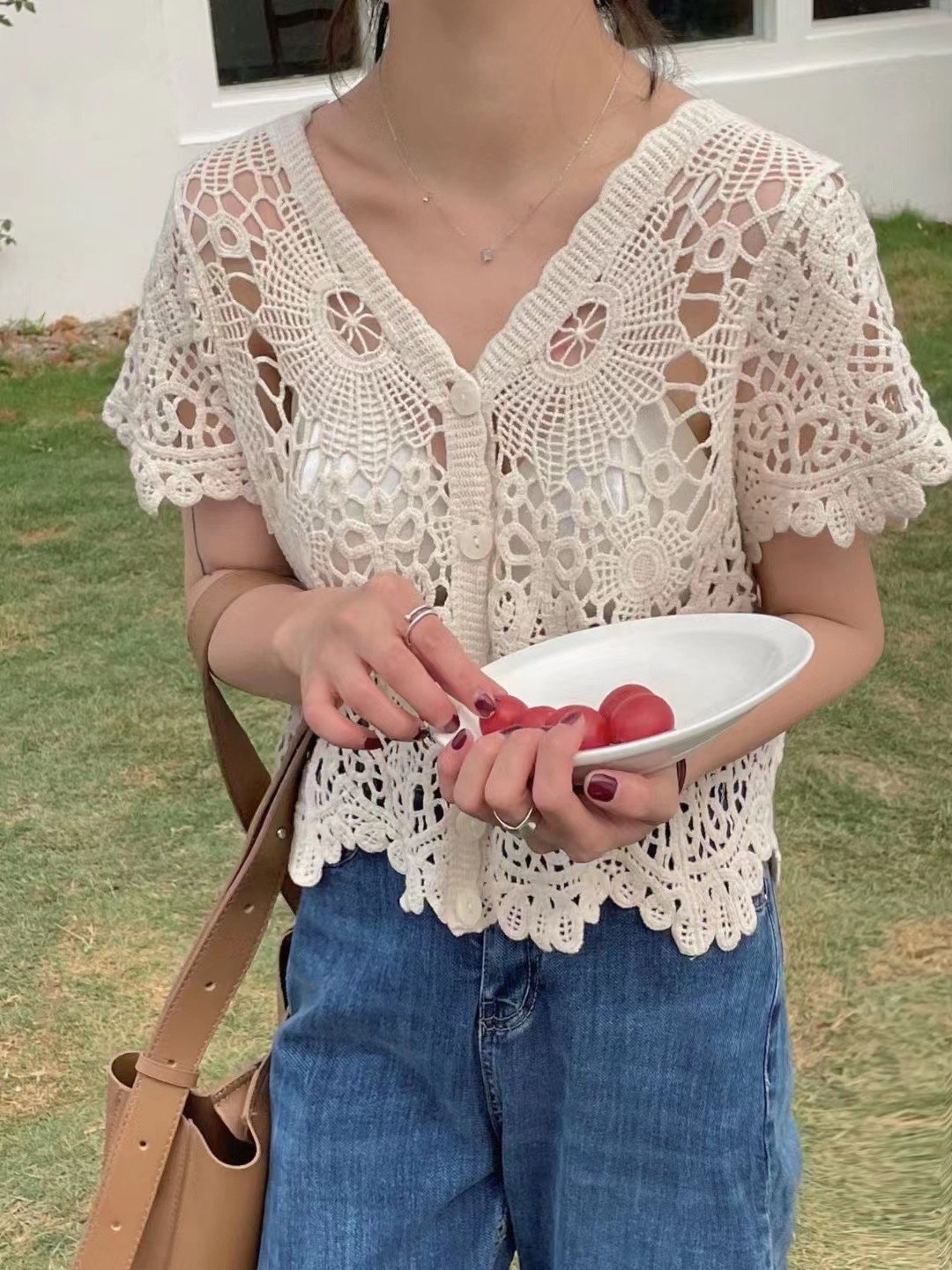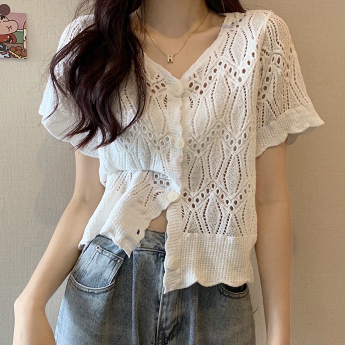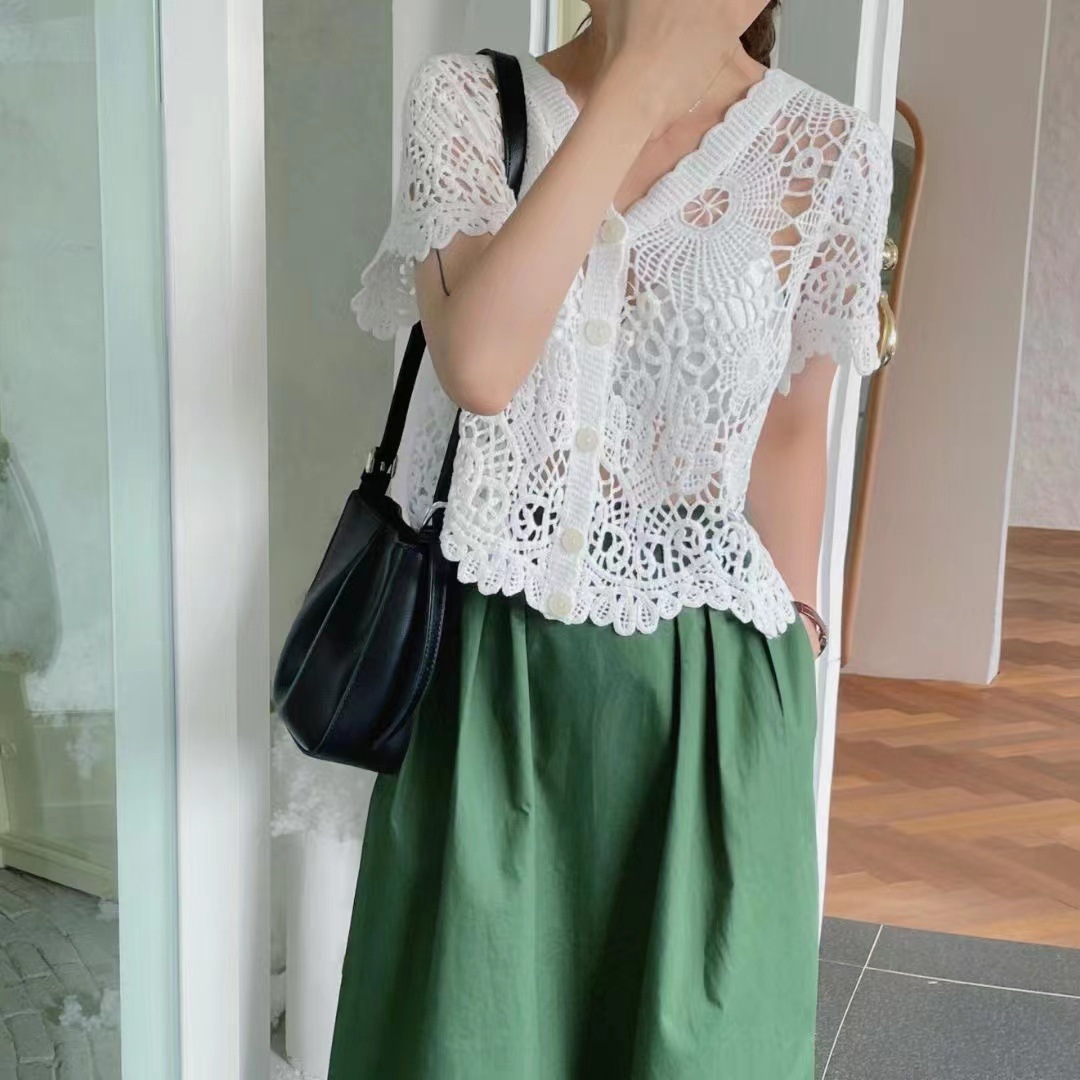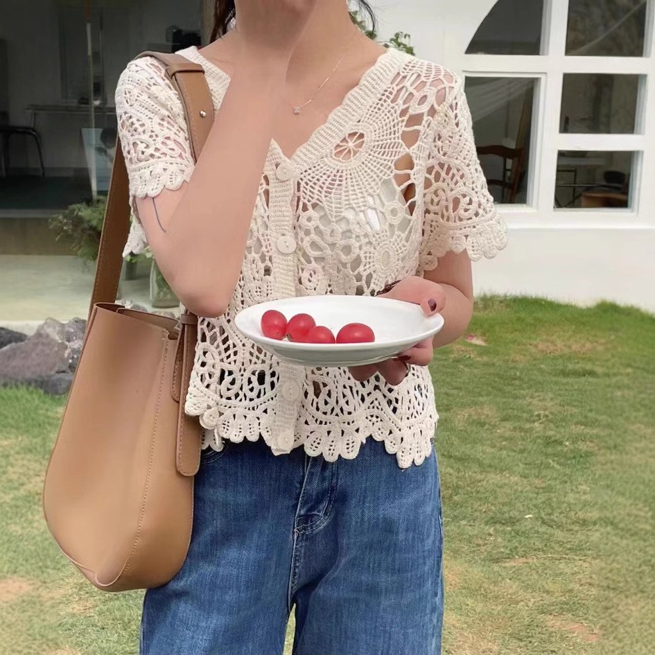 여성을위한 레트로 크로 셰 뜨개질 중공 반팔 탑 2025 여름 새 스웨터 다목적 짧은 카디건 v 넥 탑