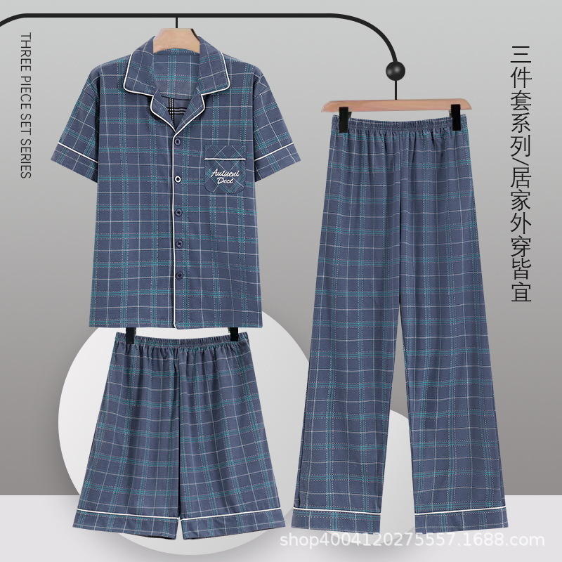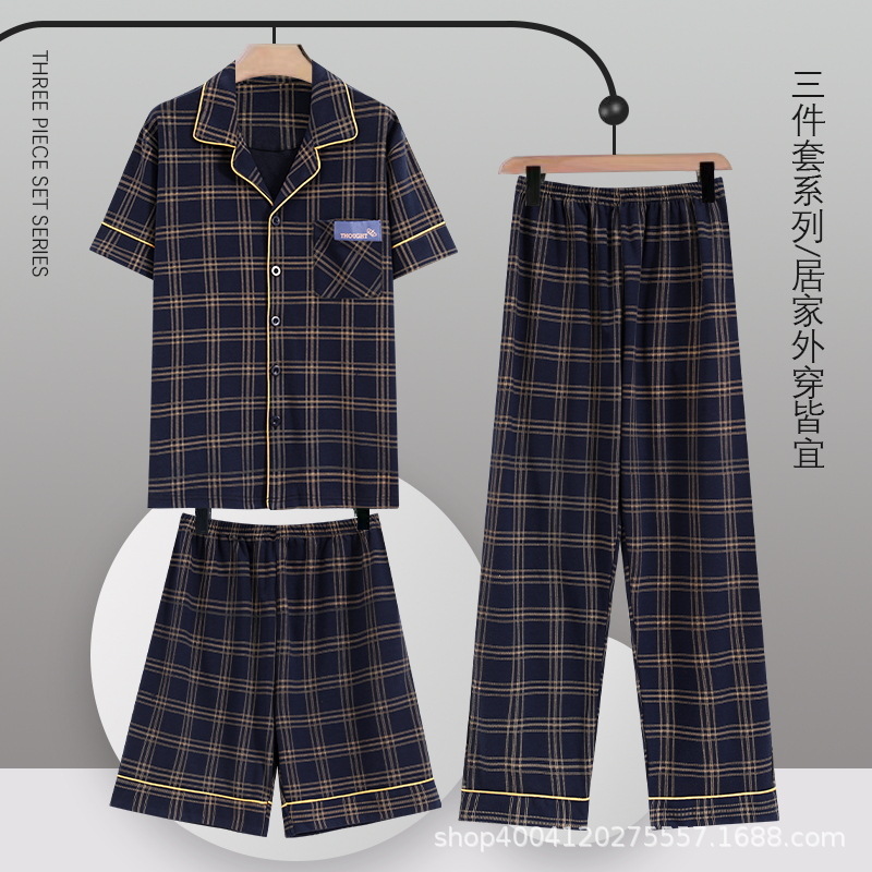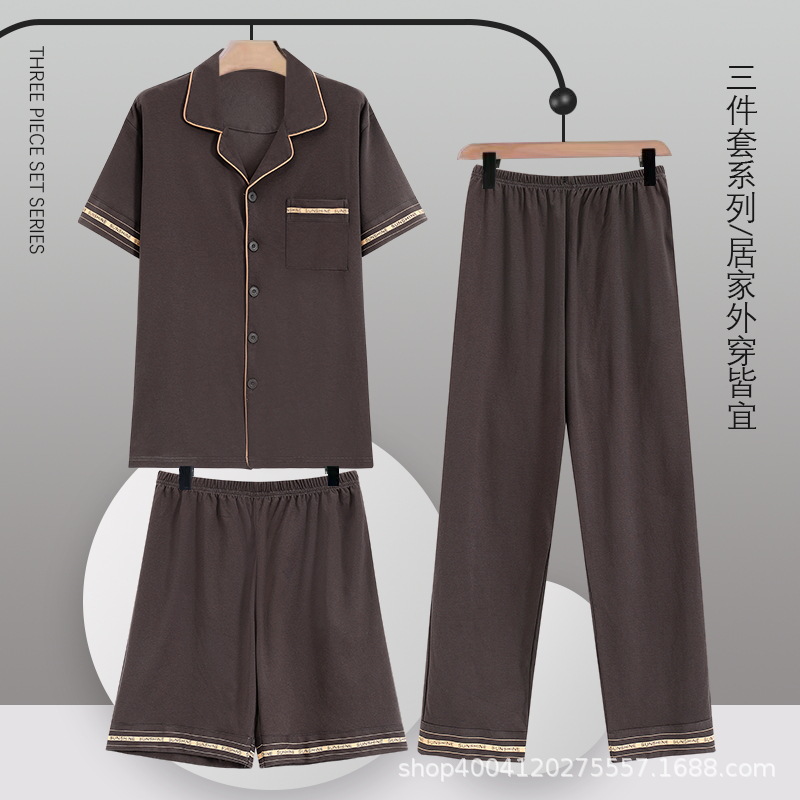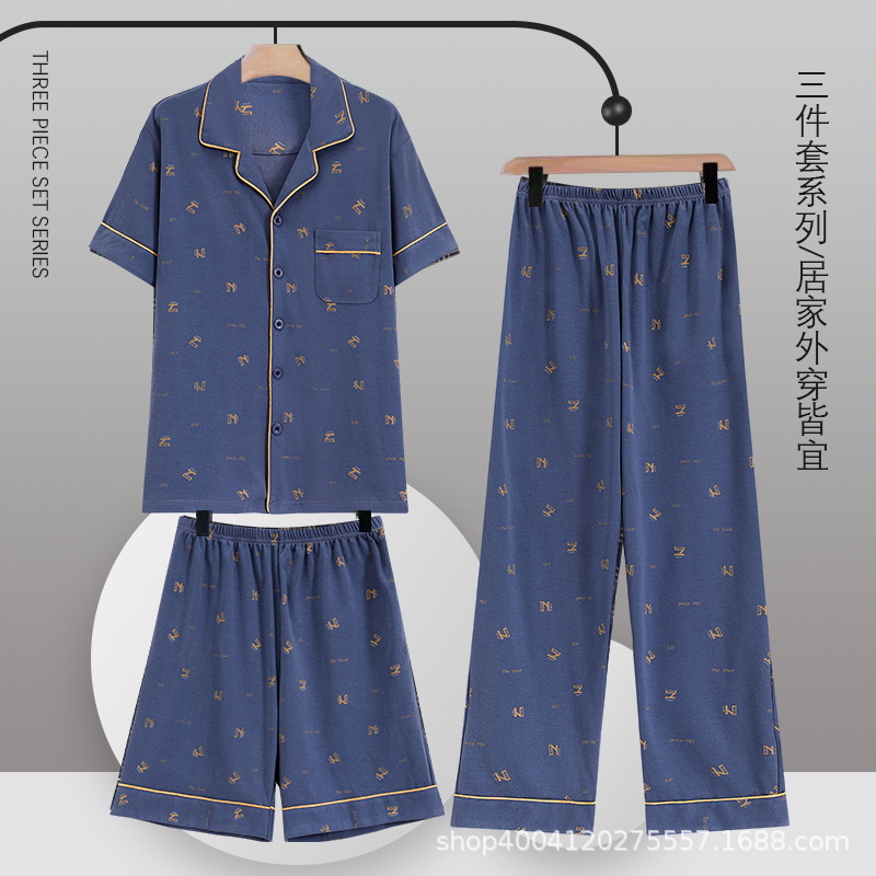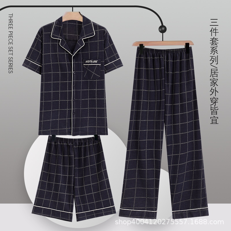 면 남성 잠옷 3 조각 반팔 바지 바지 캐주얼 카디건 플러스 사이즈 외부 옷 세트 입고스토어 가기